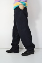 ジャストで履くより、ウエストを余らせて“太さで履く”ことで完成するチノです。