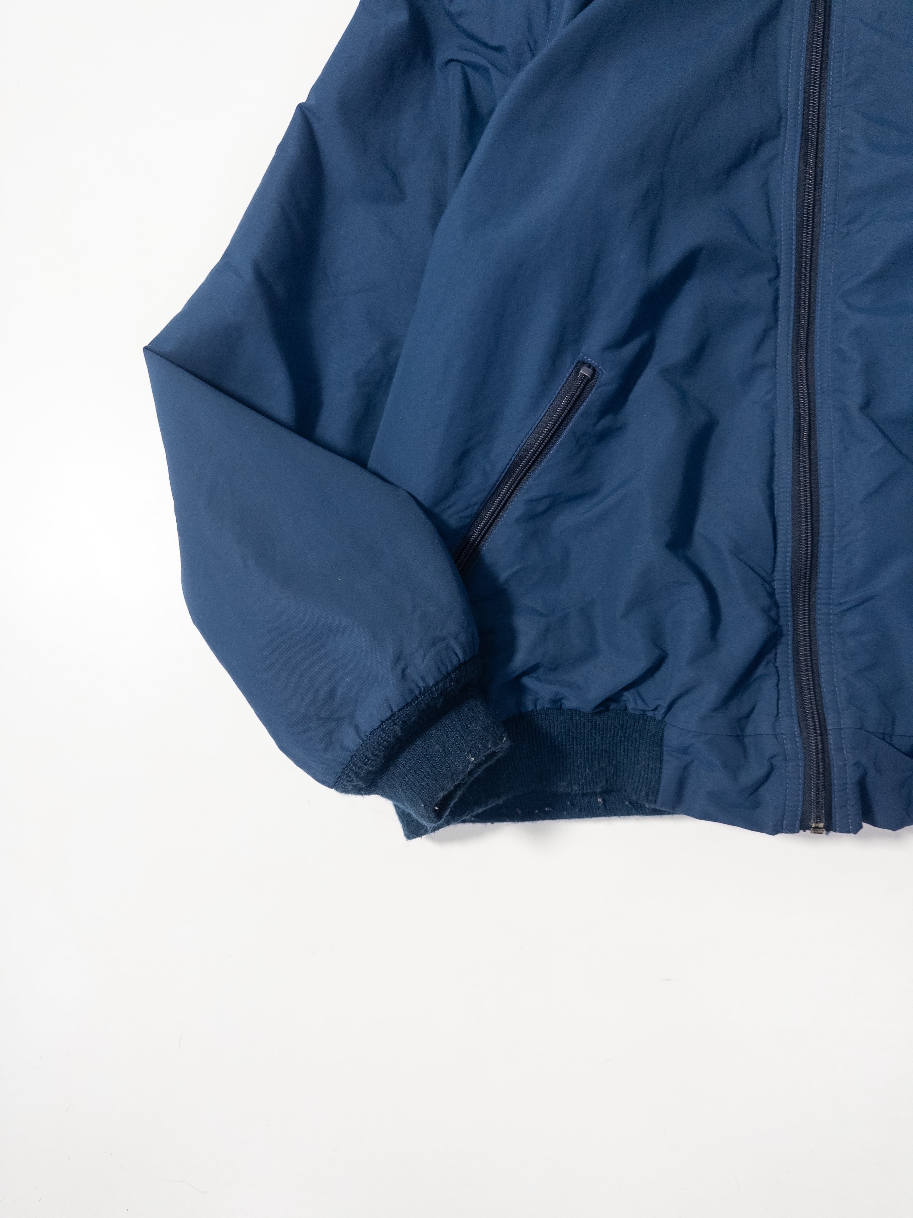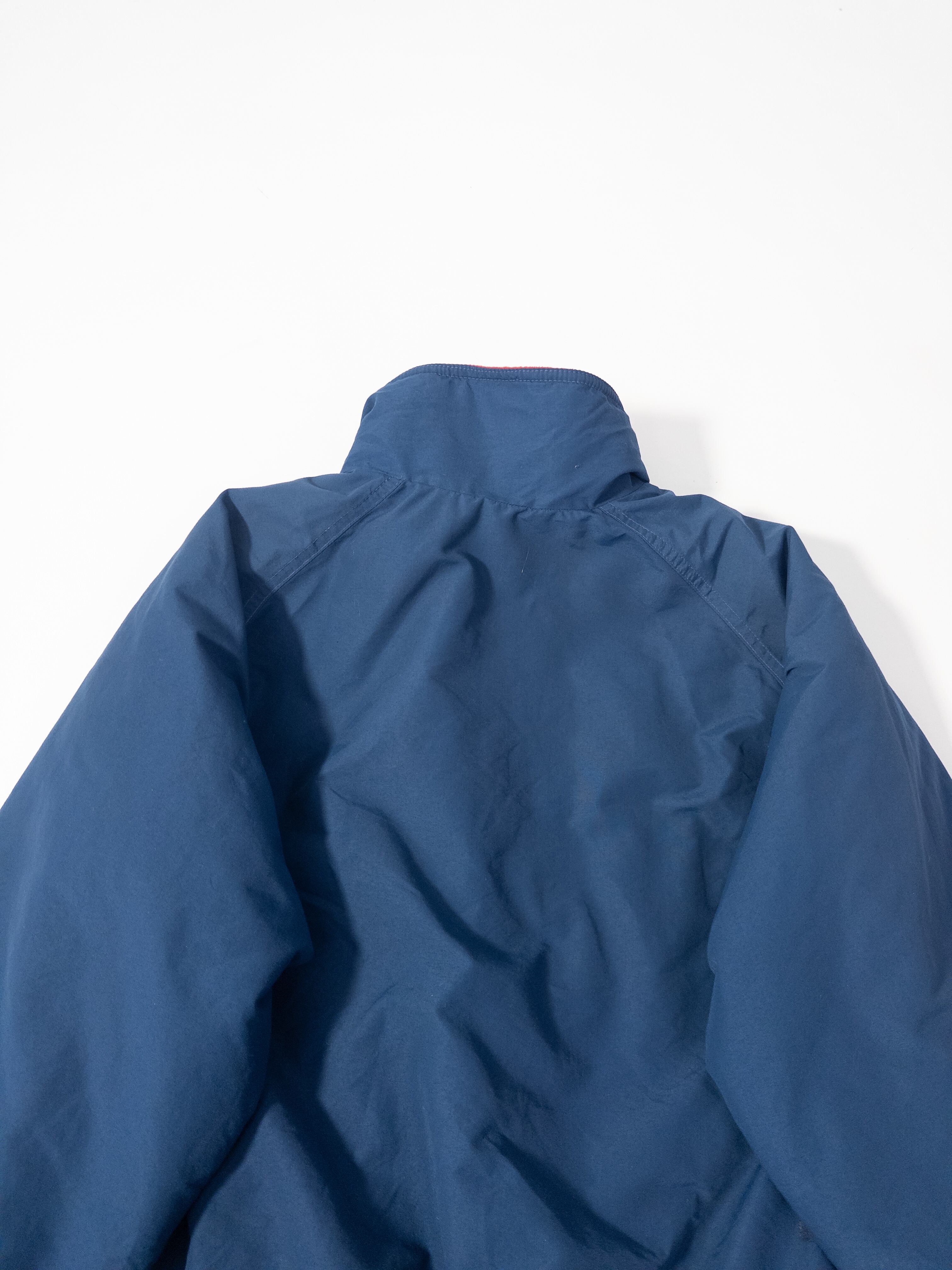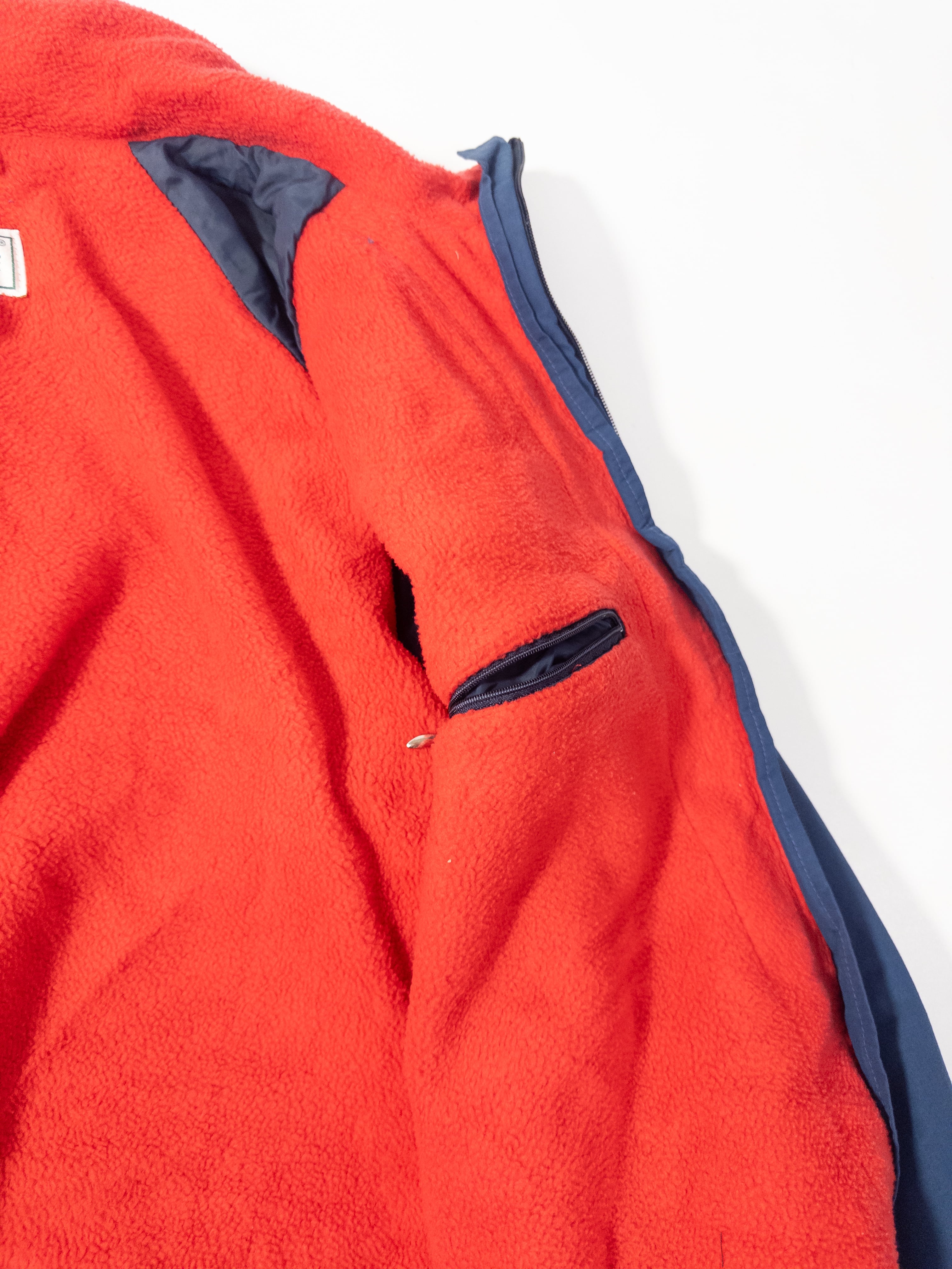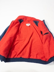 ネイビーのシェルに、襟元からのぞくレッドフリース。