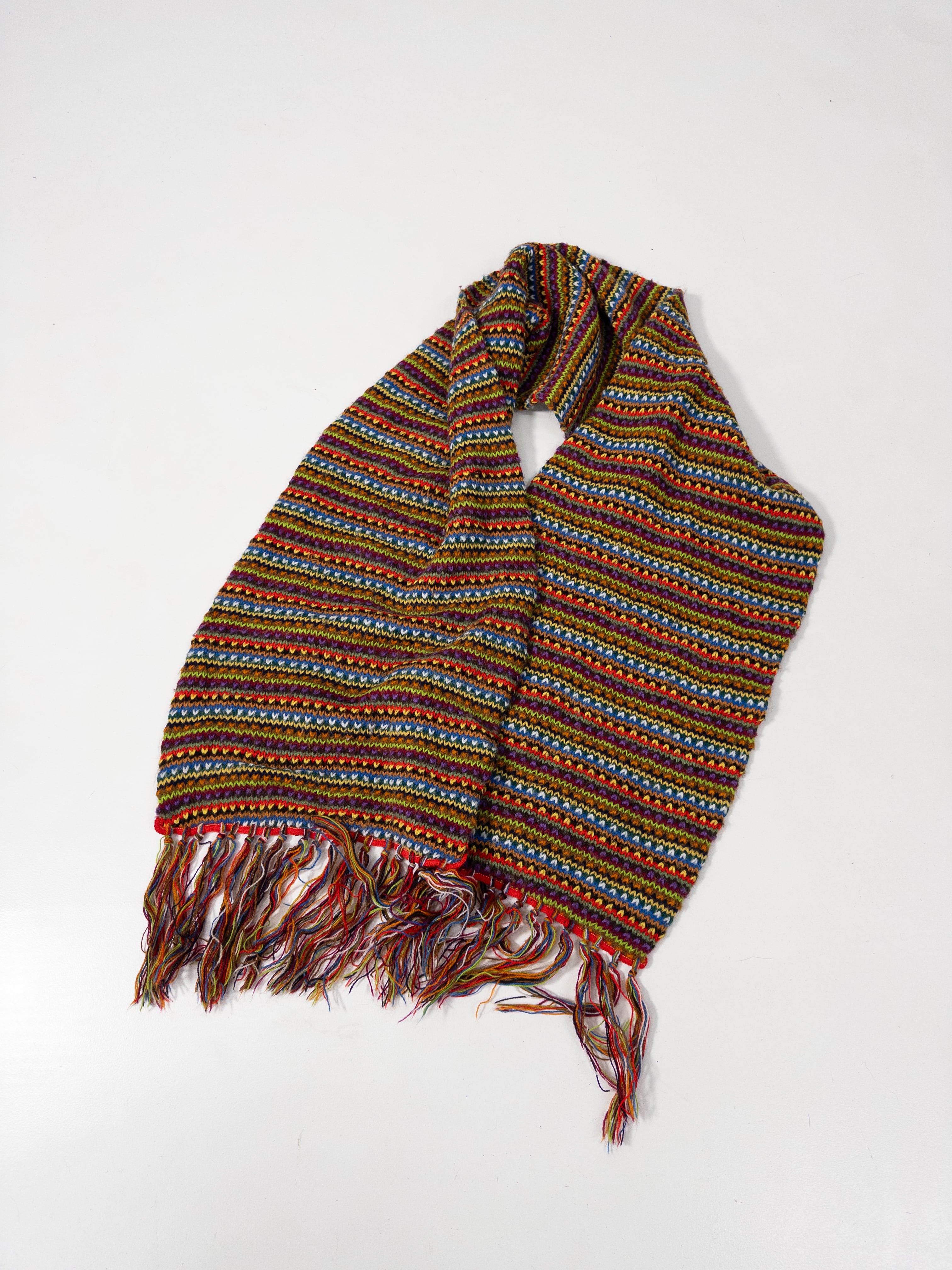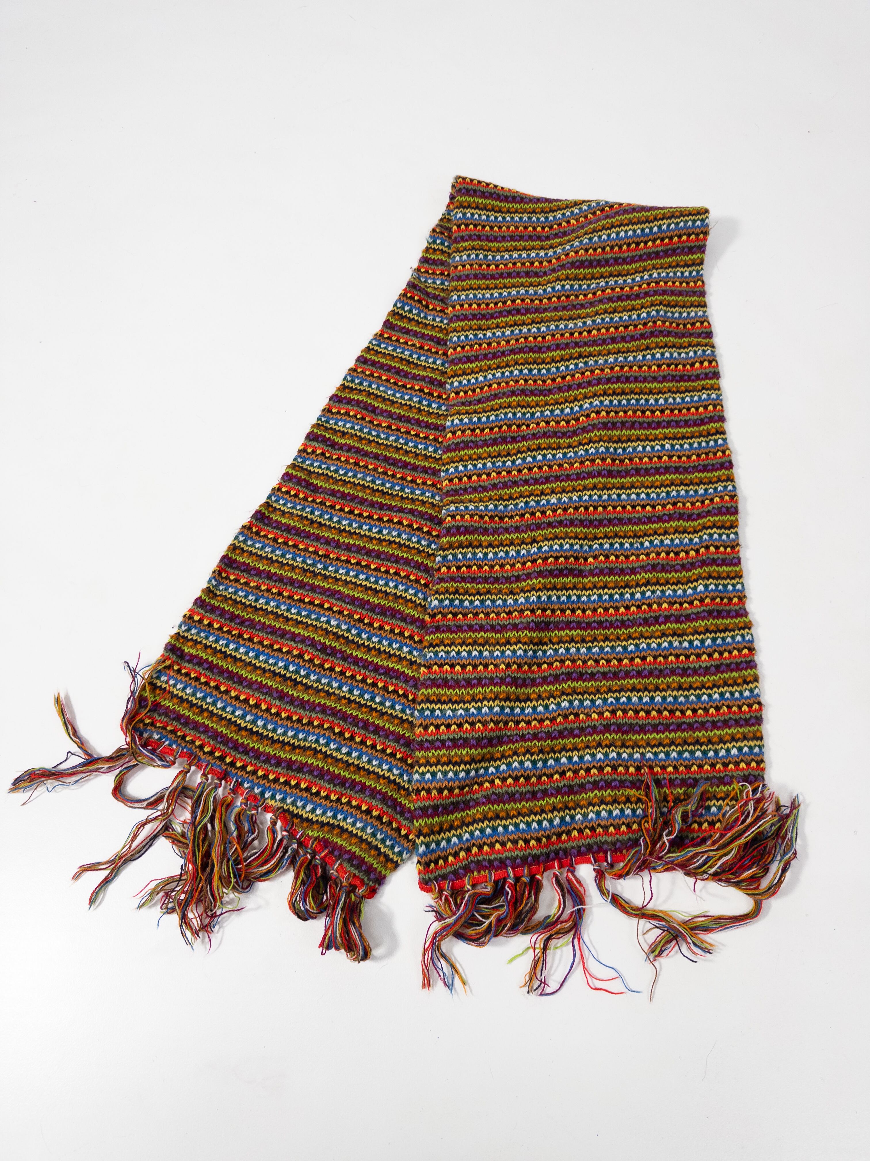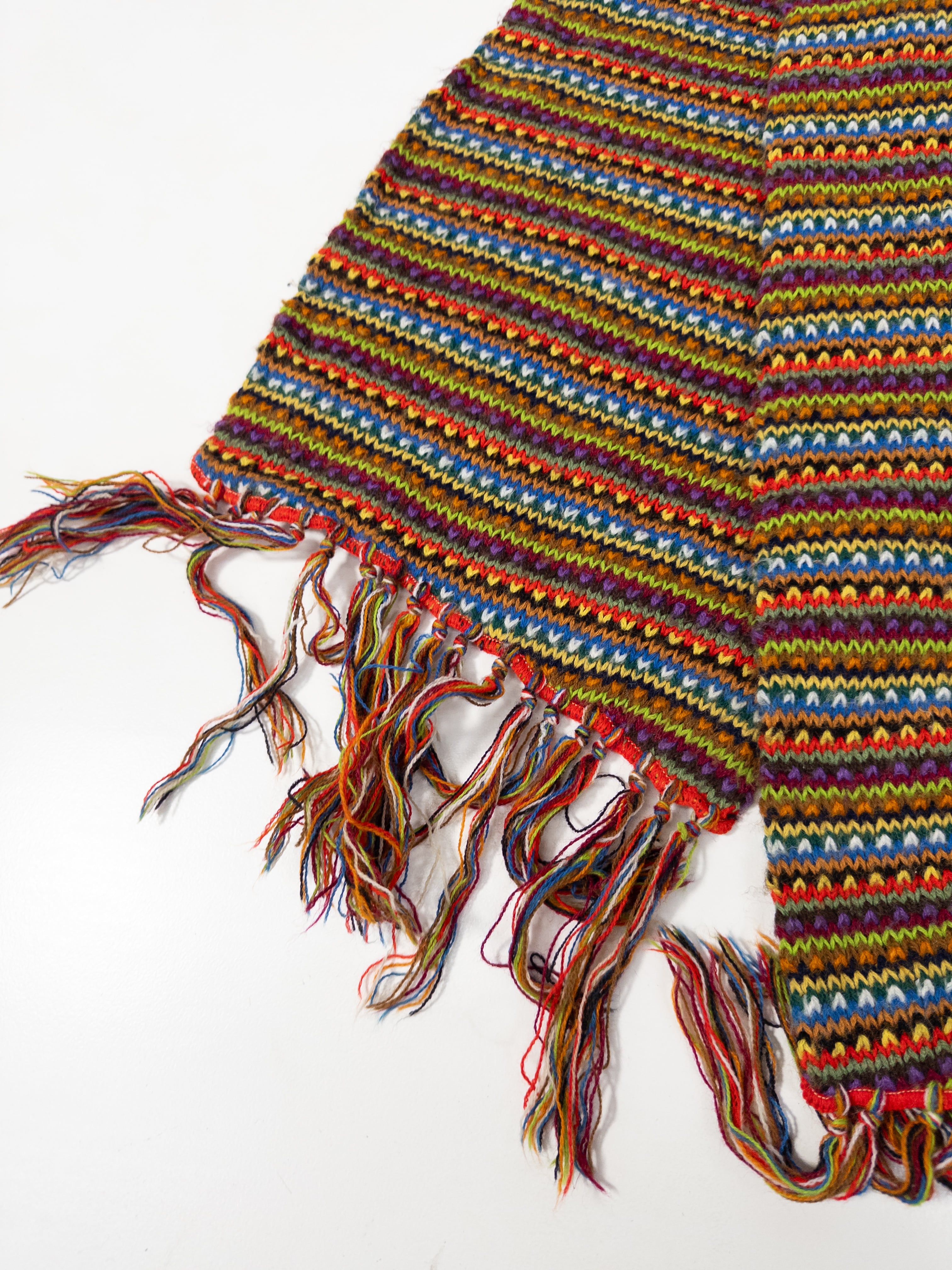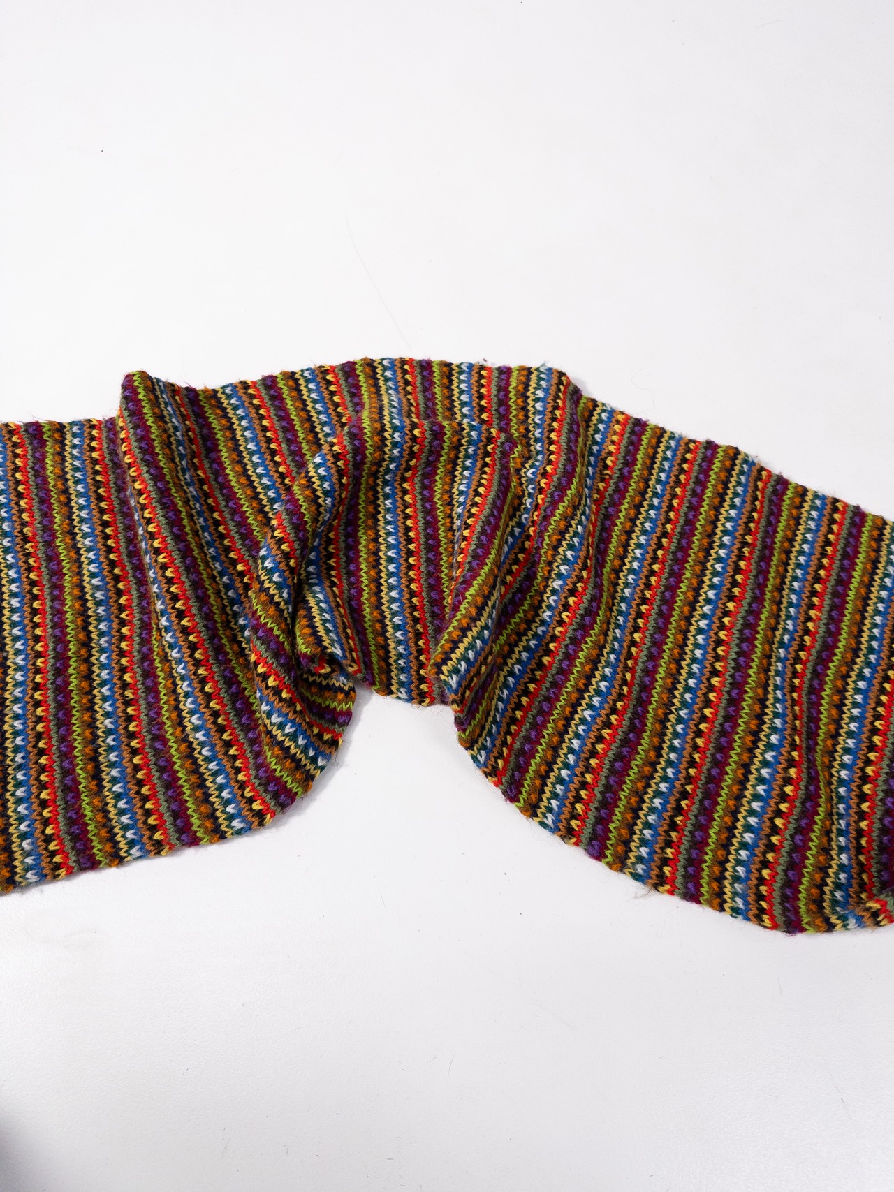 細かい点が連なったようなバーズアイ柄で、赤・黄・青・緑が均等に混ざり合い、遠目では落ち着いて見えるのに、近くで見るとかなり情報量がある配色です。