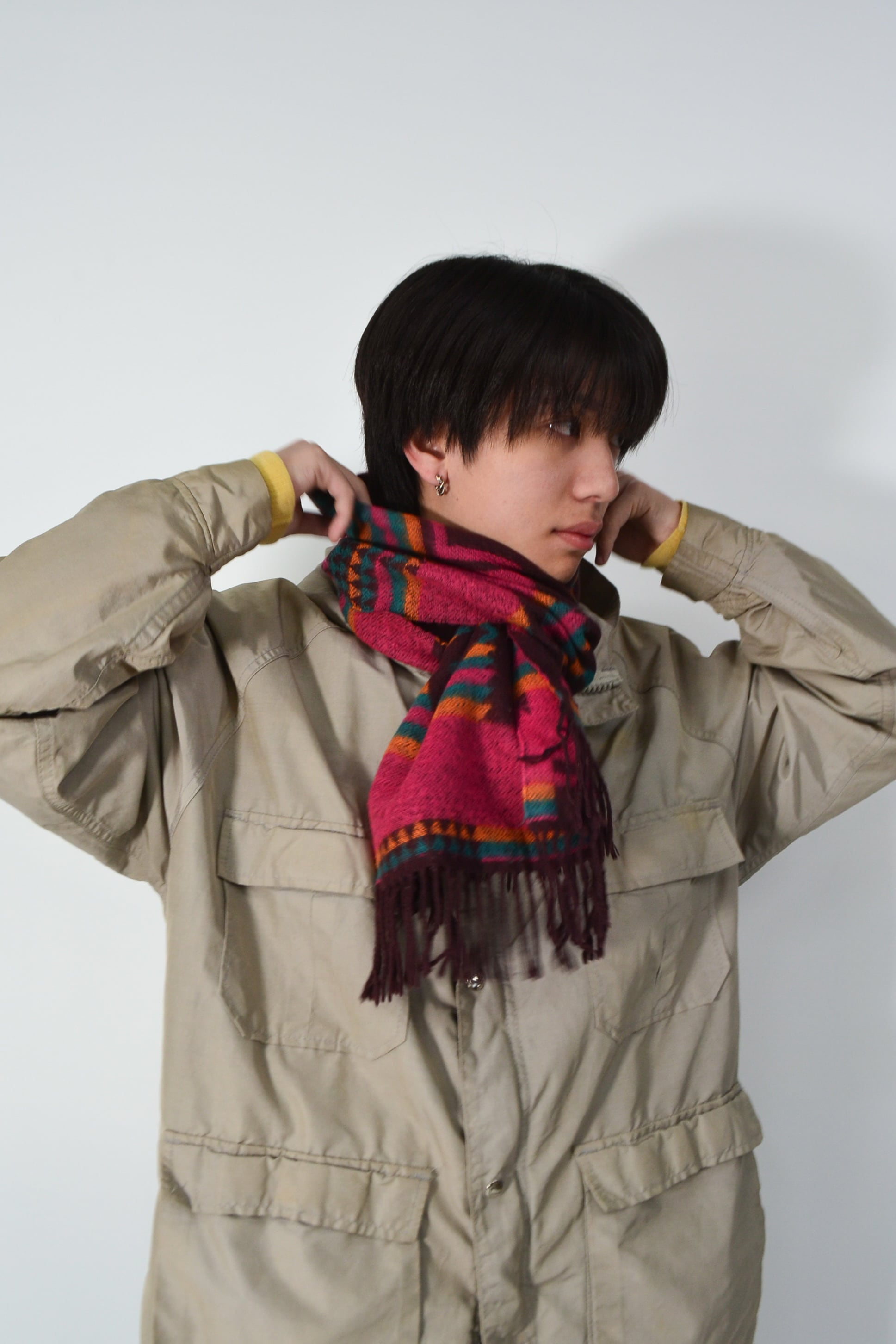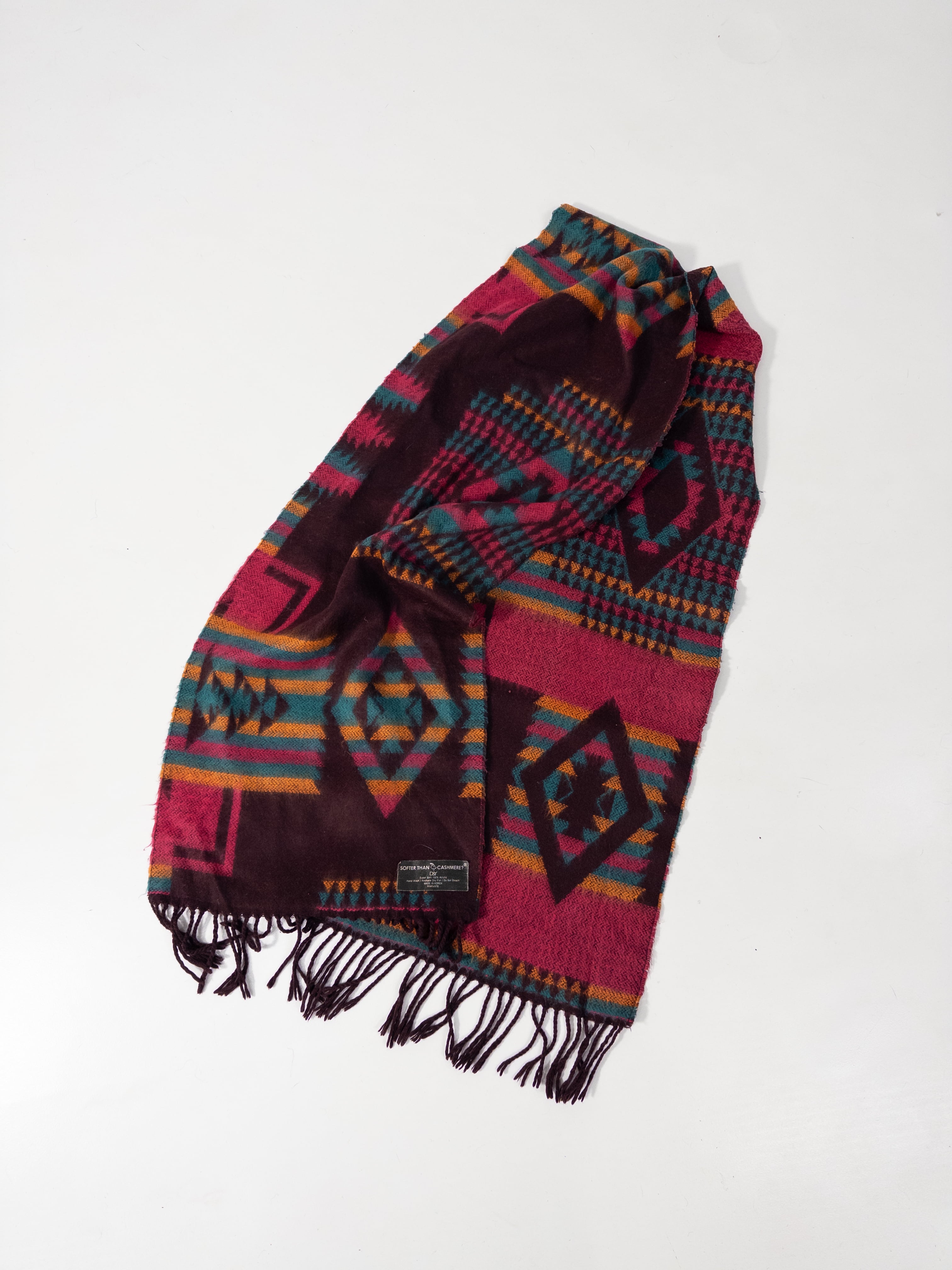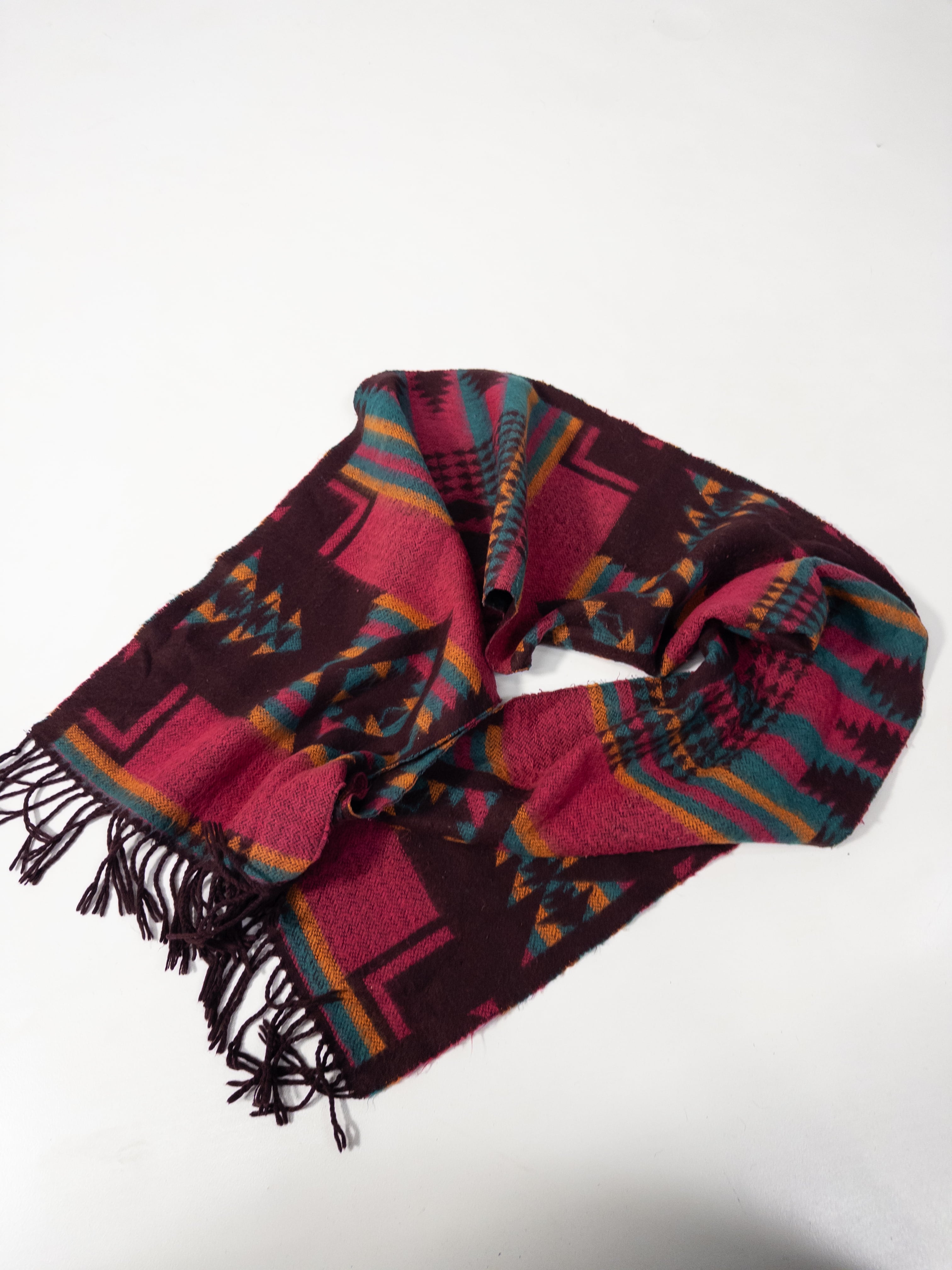 バーガンディをベースに、ターコイズやマスタードが重なるジオメトリックパターンのマフラー。