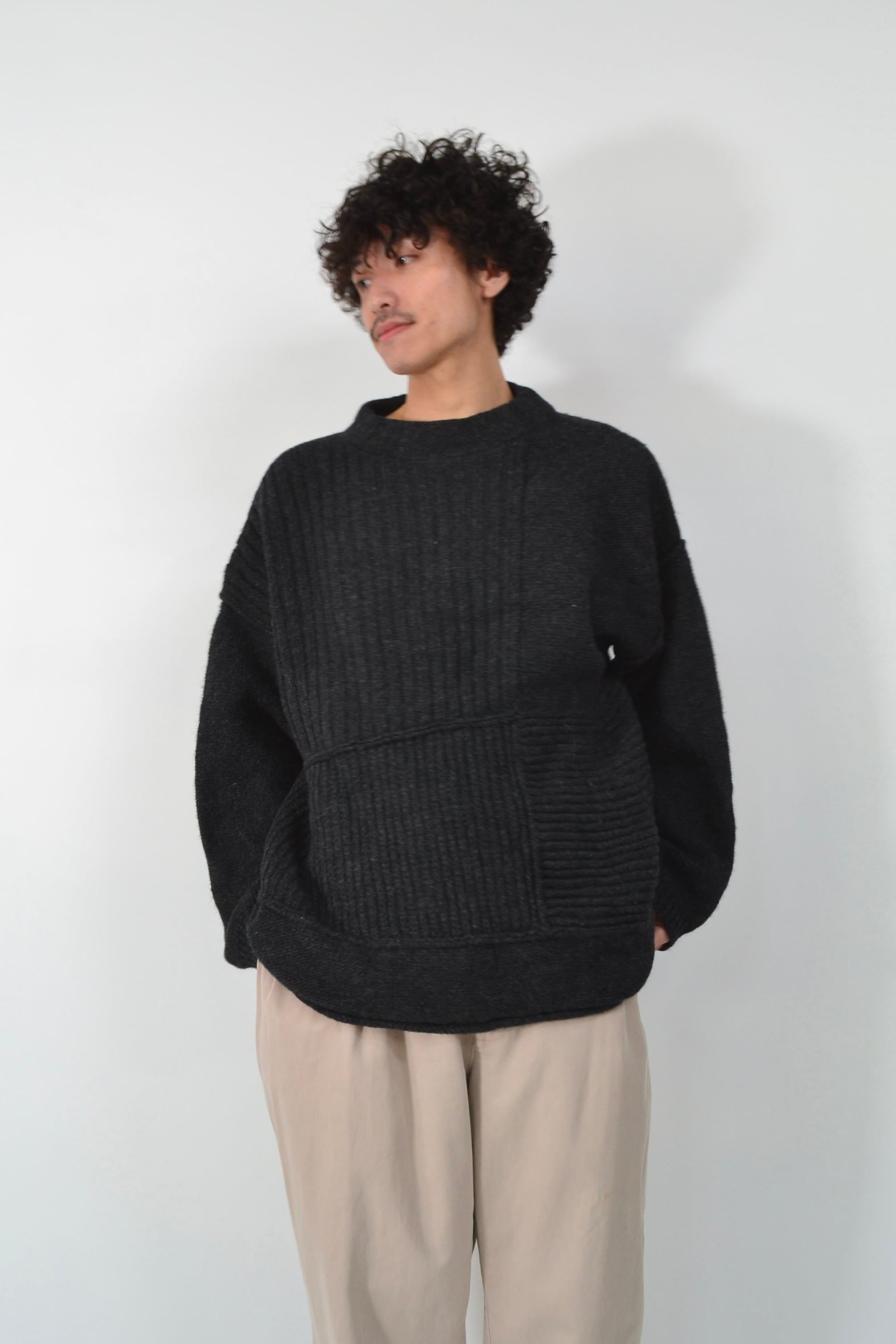 いわゆる「ニットらしい細さ」じゃなくて、スウェット感覚でラフに着られるバランスが良い。