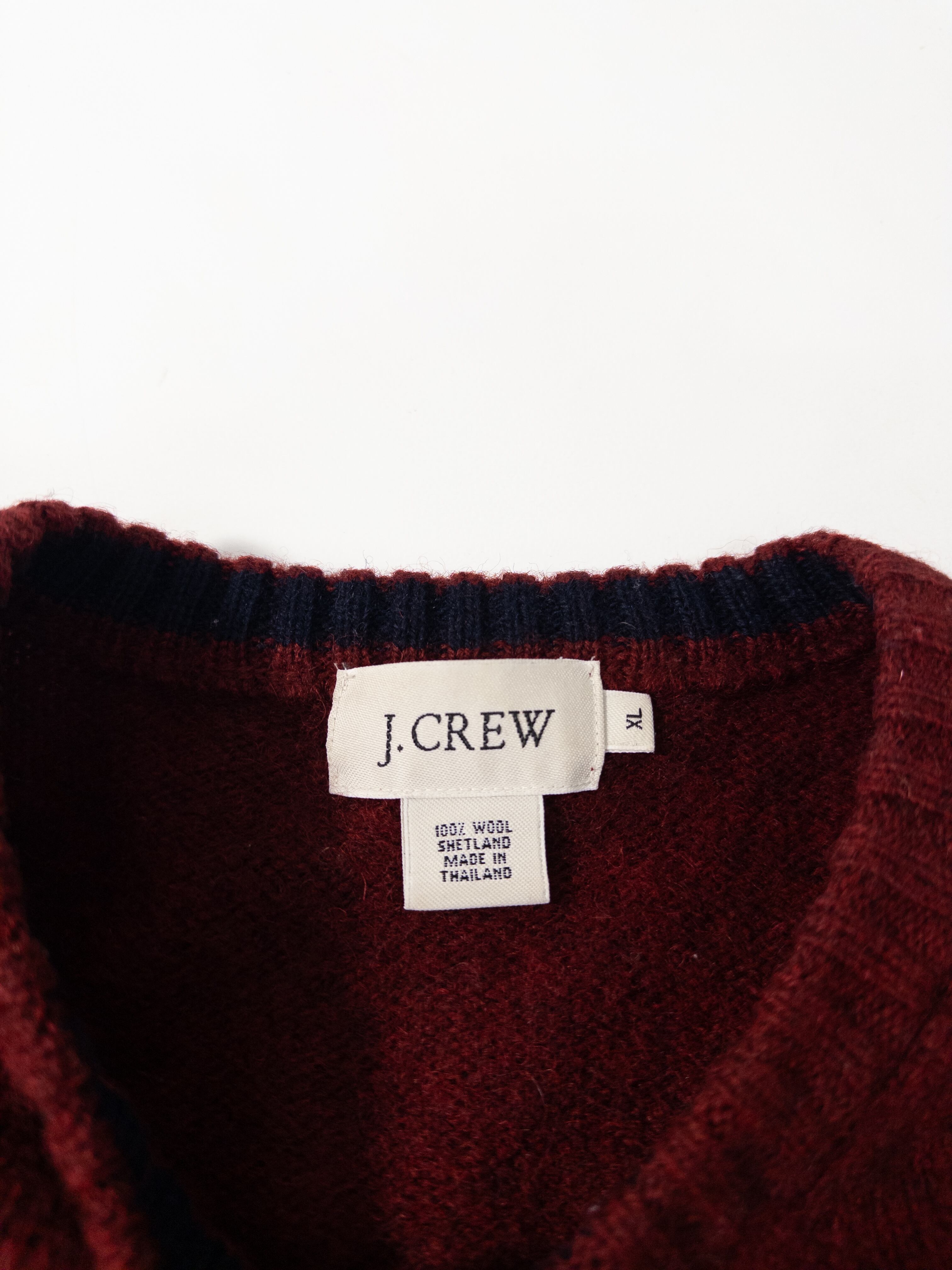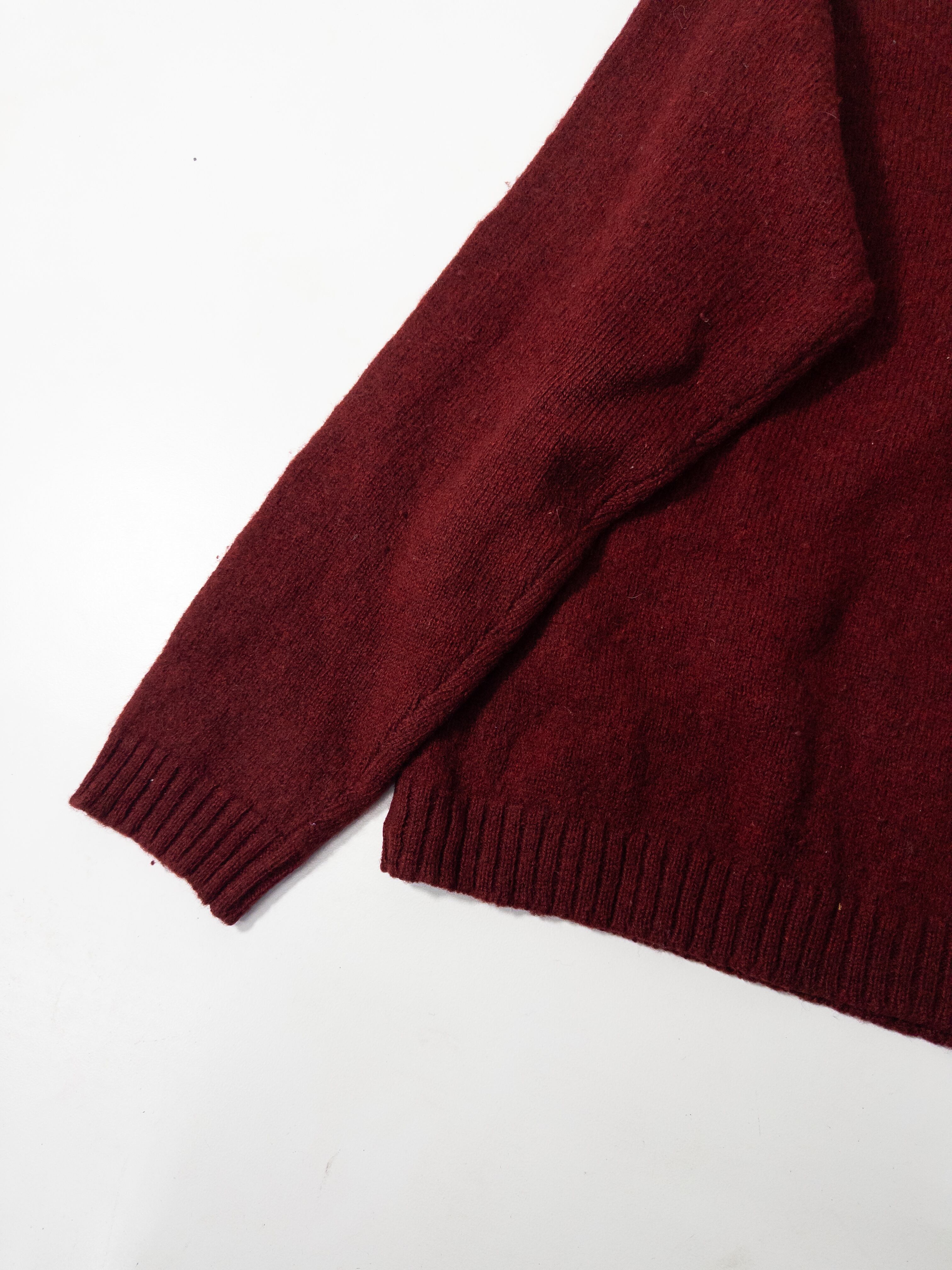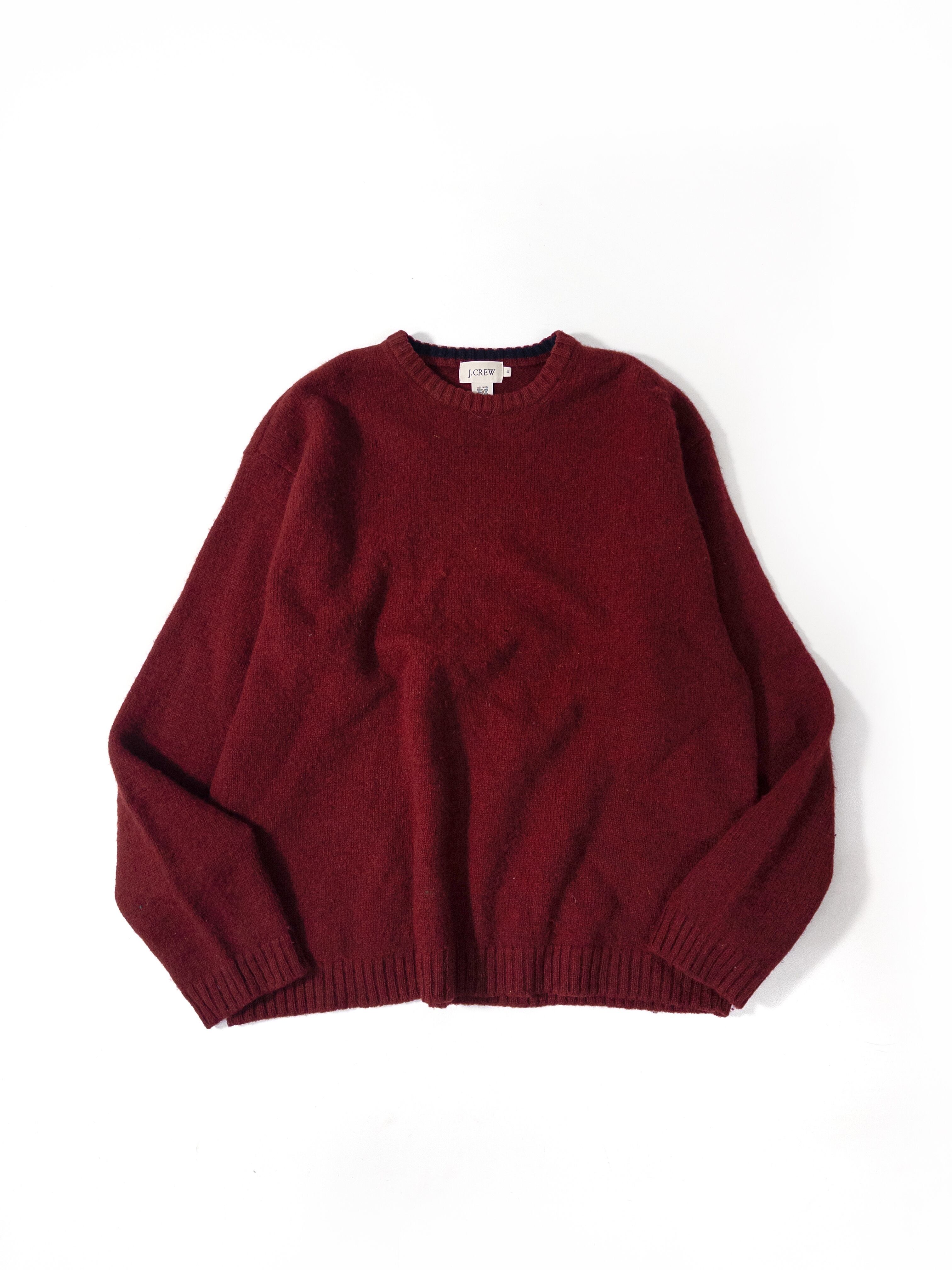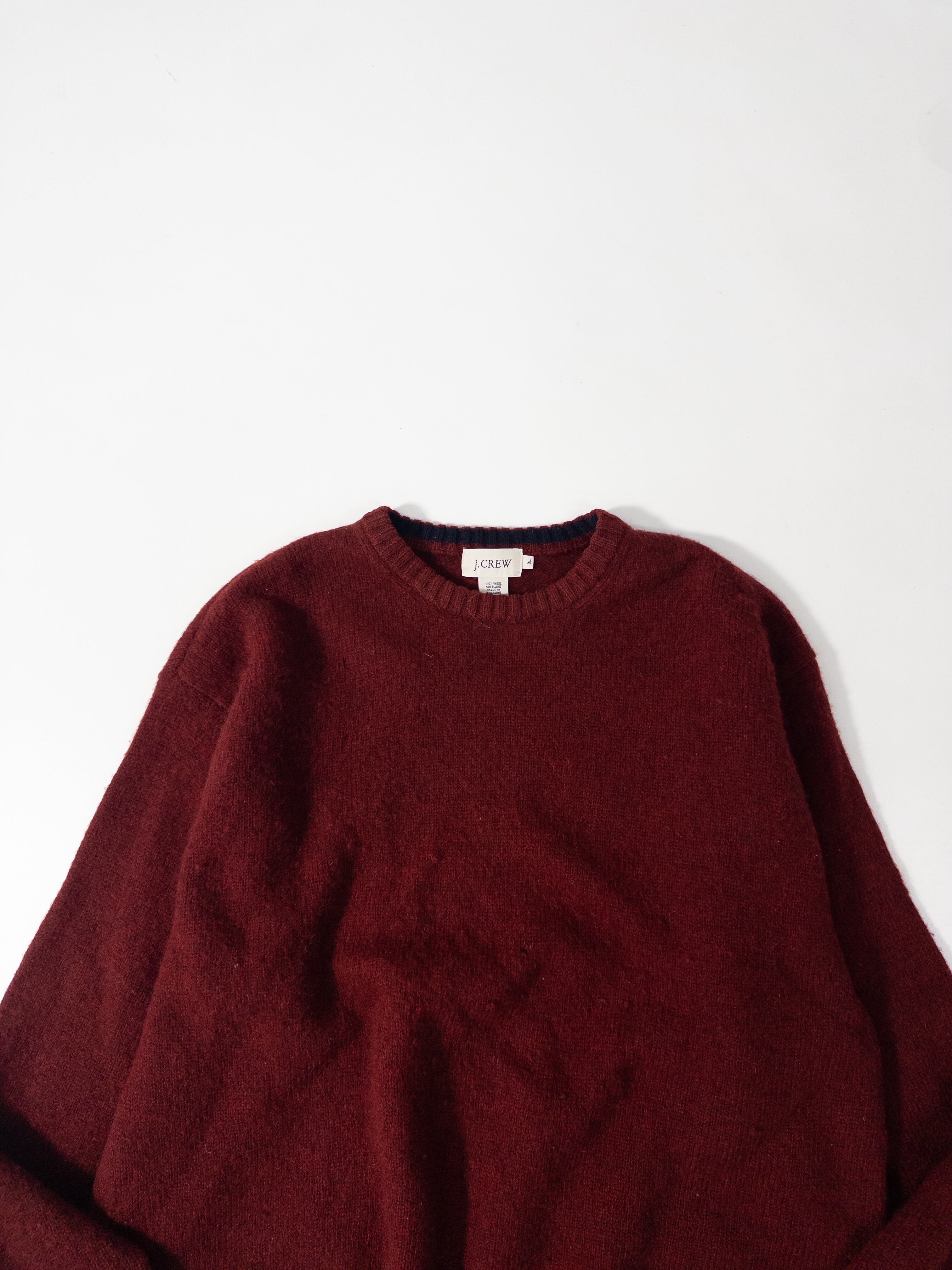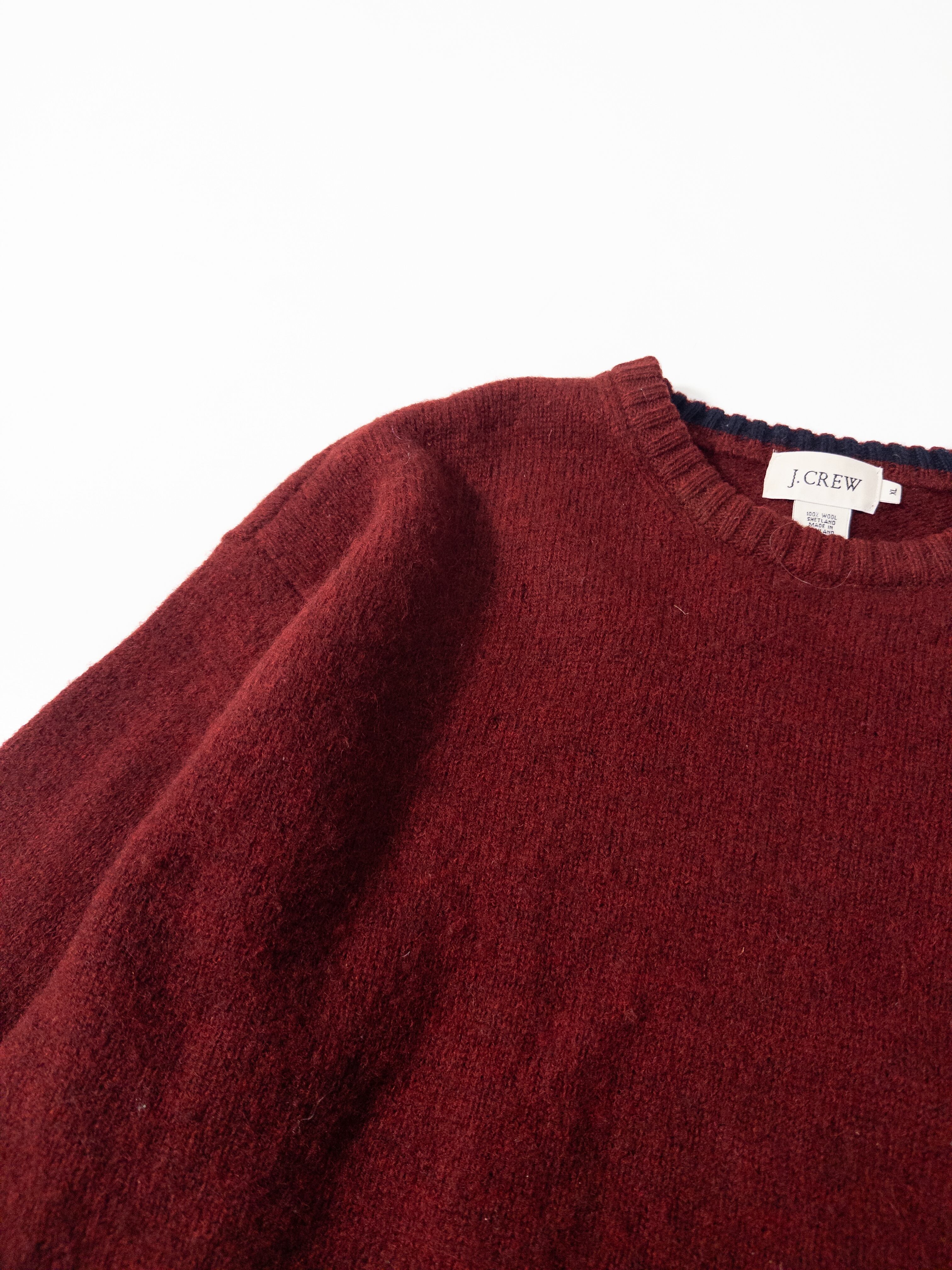深みのあるバーガンディカラーが印象的な J.Crew のシェットランドウールニット。