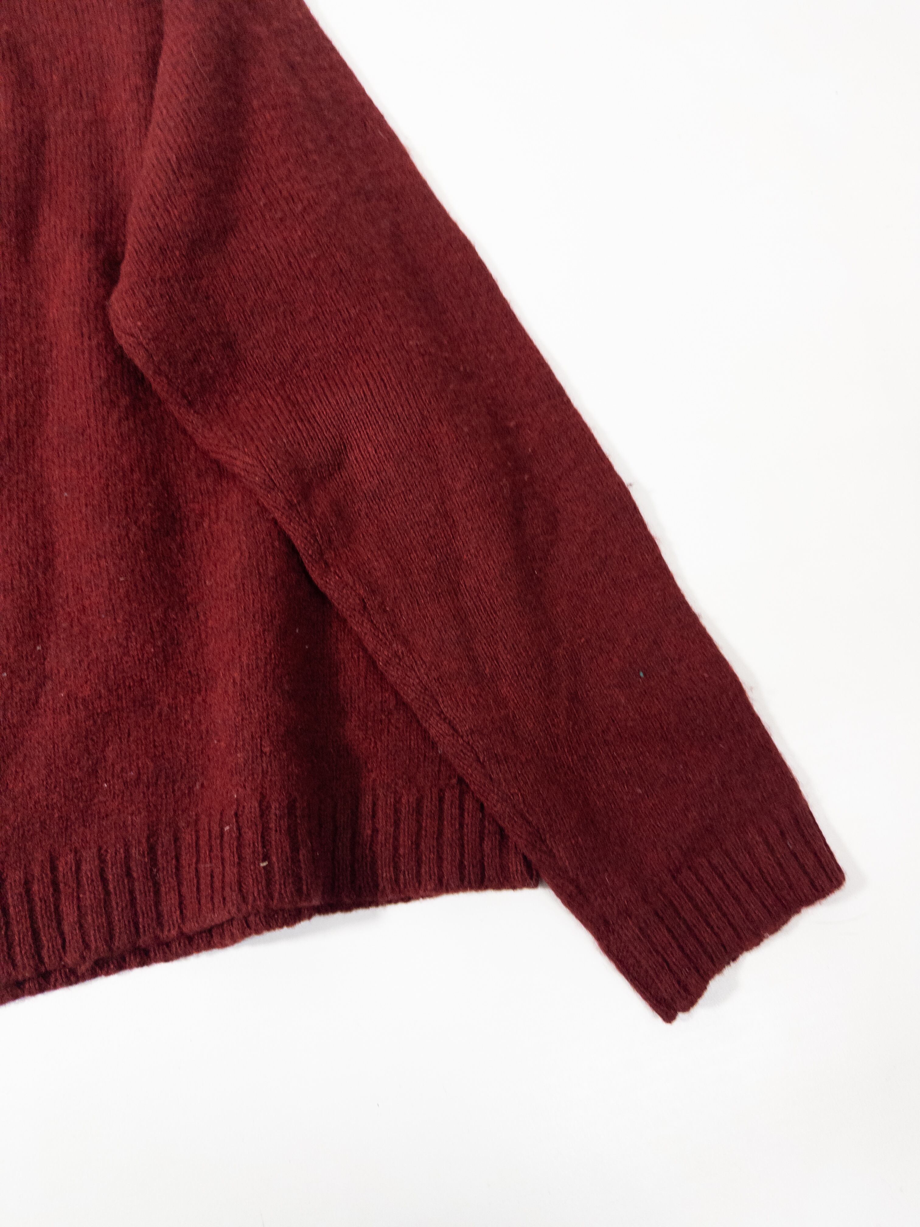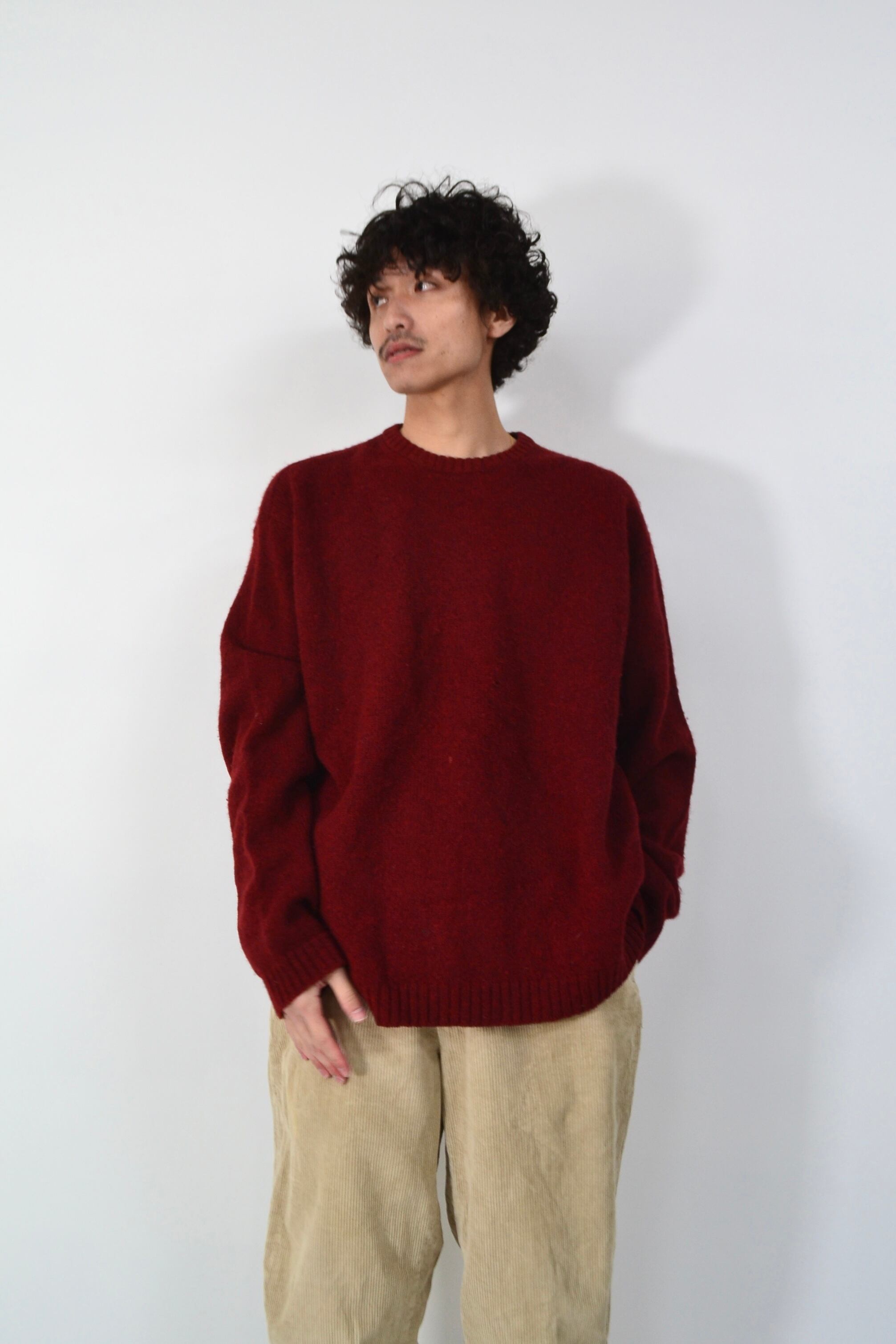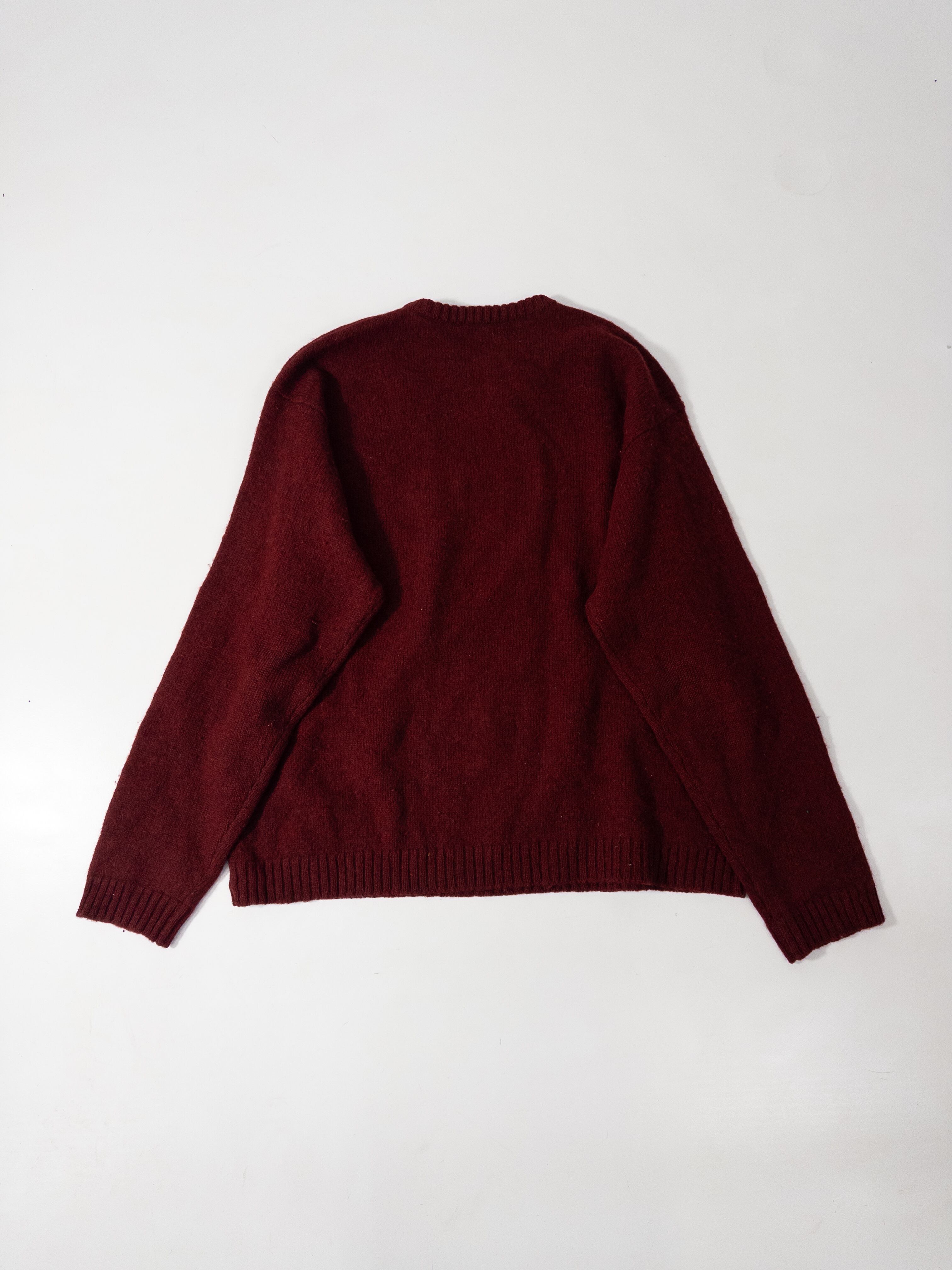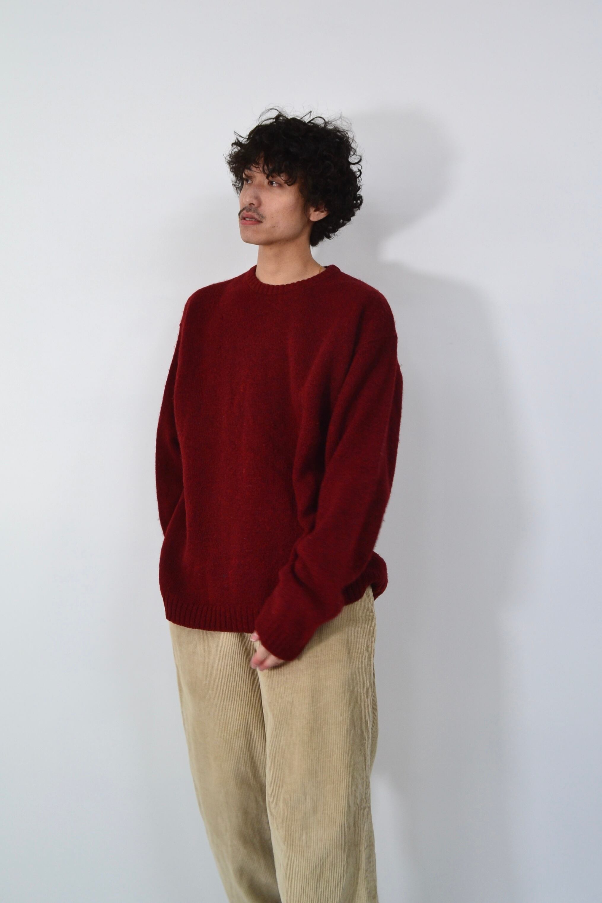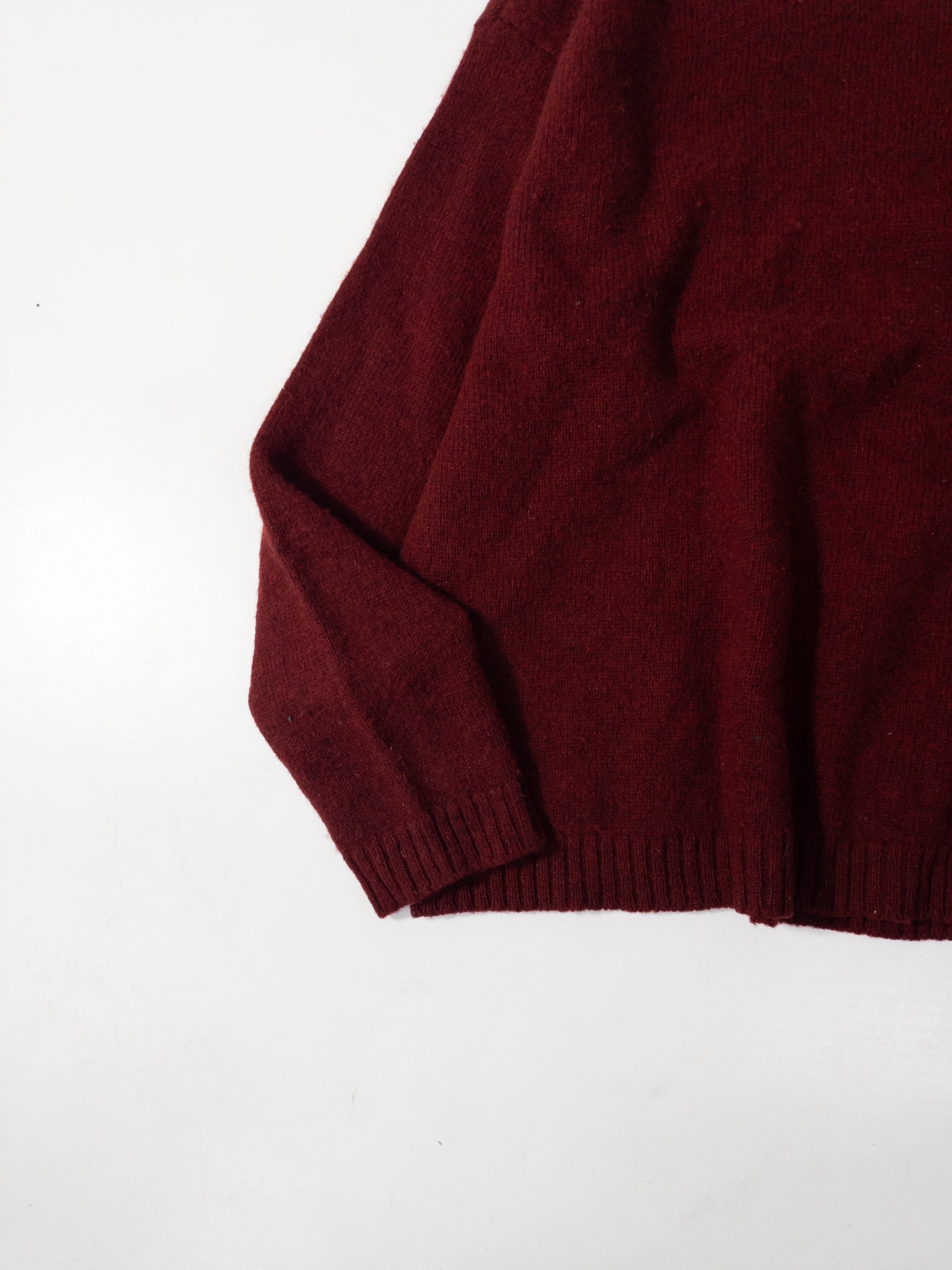 深みのあるバーガンディカラーが印象的な J.Crew のシェットランドウールニット。