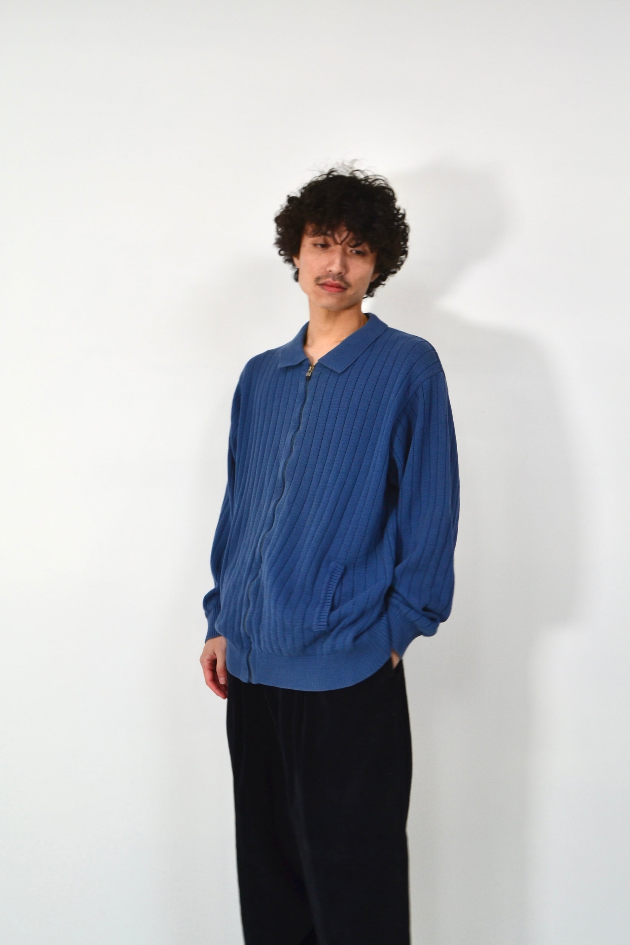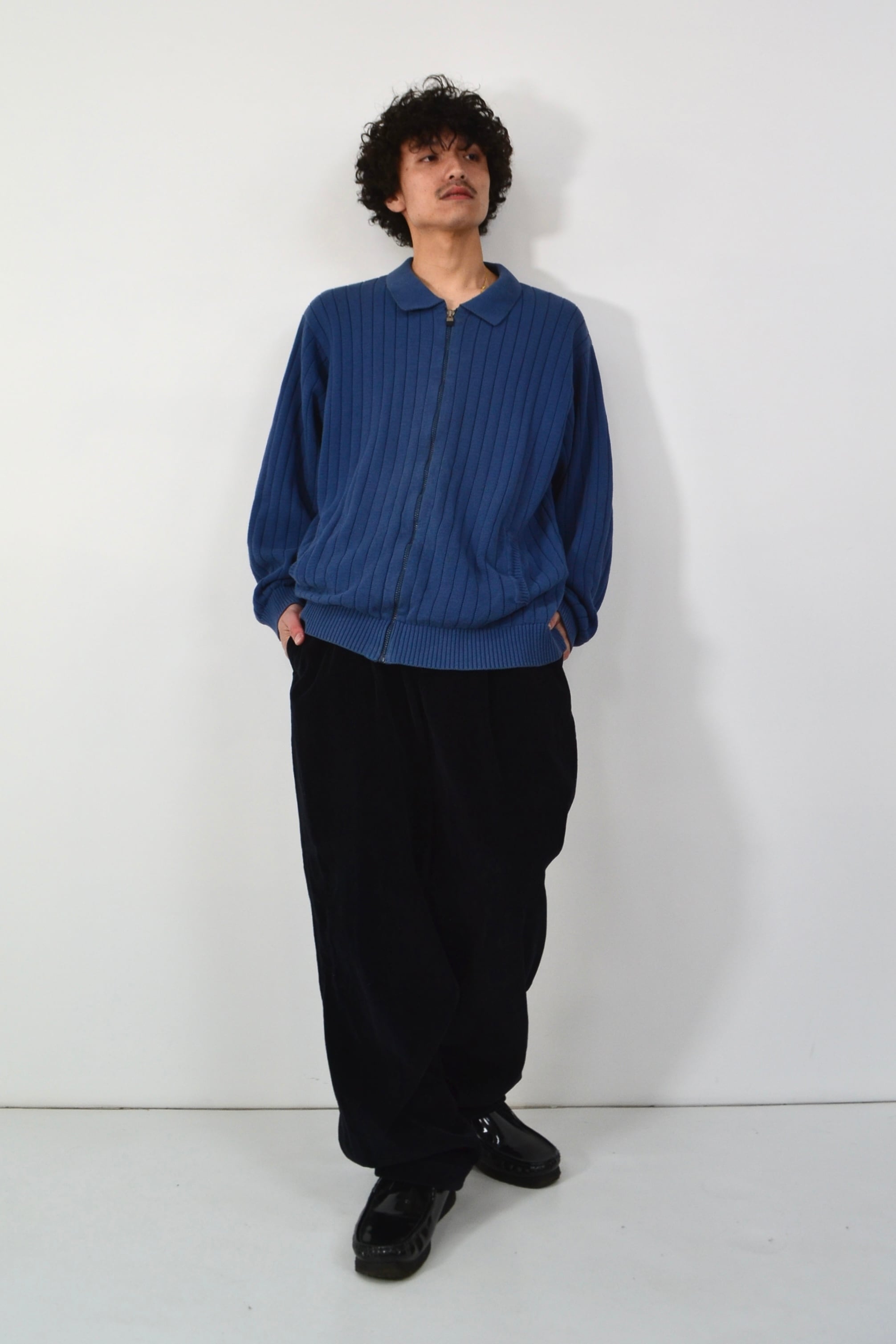 襟付きのフルジップ仕様もかなり優秀で、全部閉めればニットブルゾン感覚、少し開ければカーディガンのように使える。インナー次第で雰囲気を変えられる一枚です。