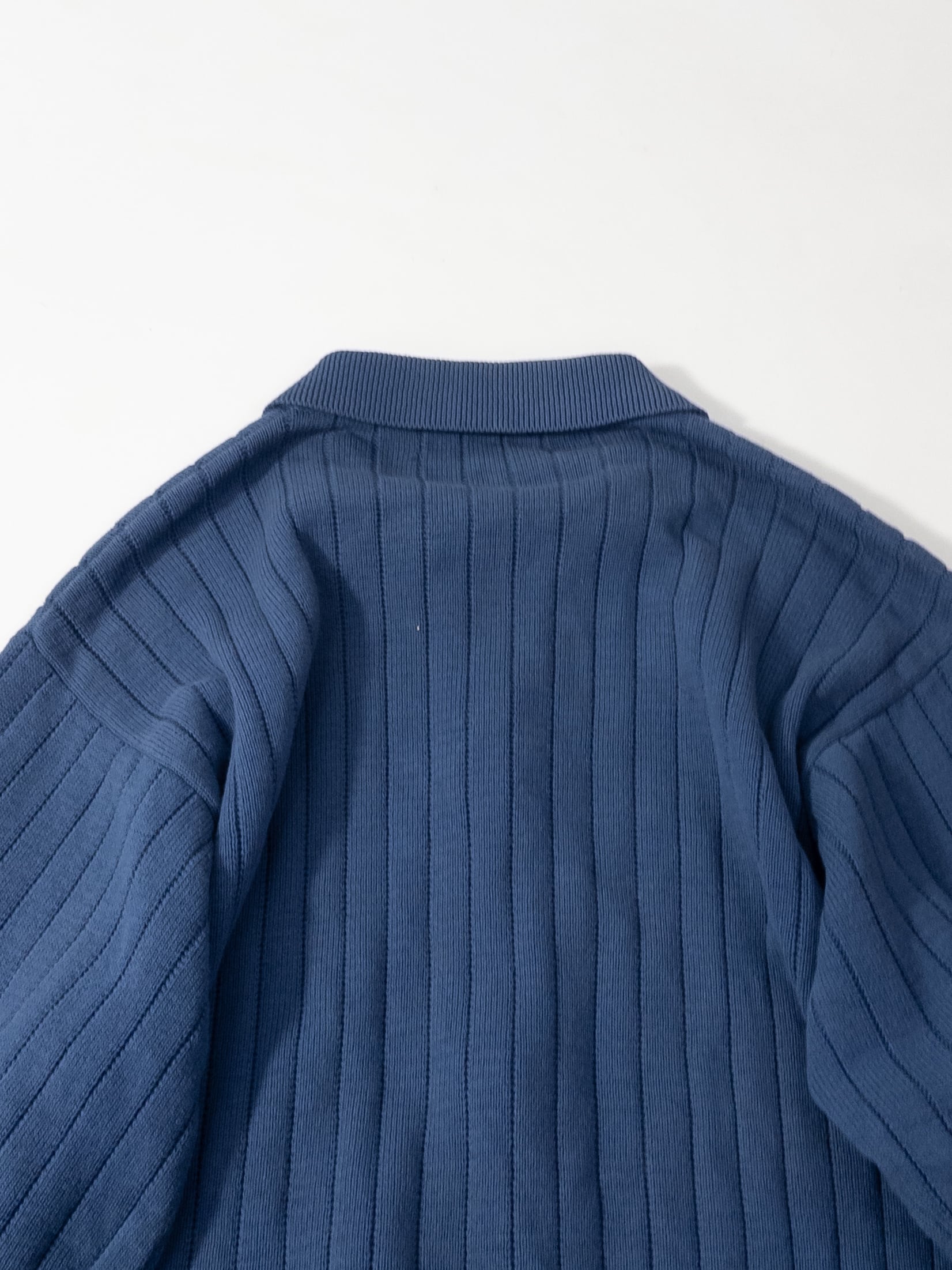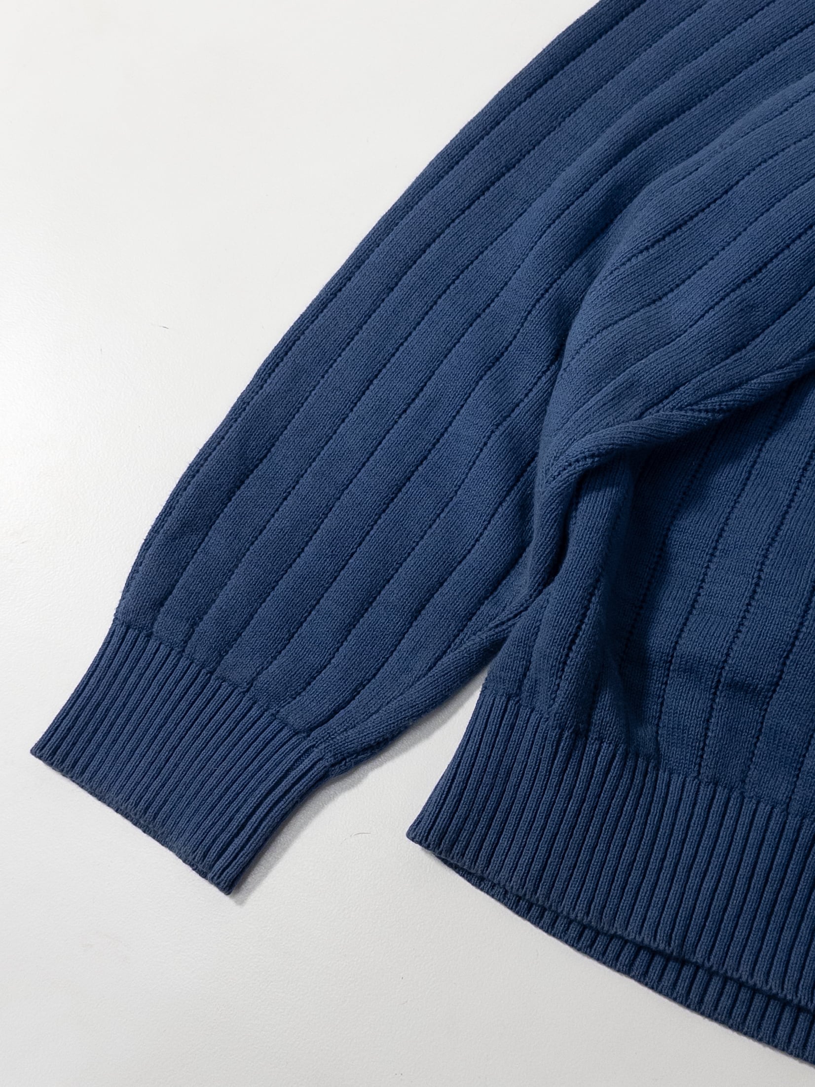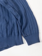編みは縦畝のリブ。ピッチが細かく、体にピタッと沿うというより、ストンと自然に落ちるシルエット。ヨーロッパらしい、線を強調しすぎない編地です。