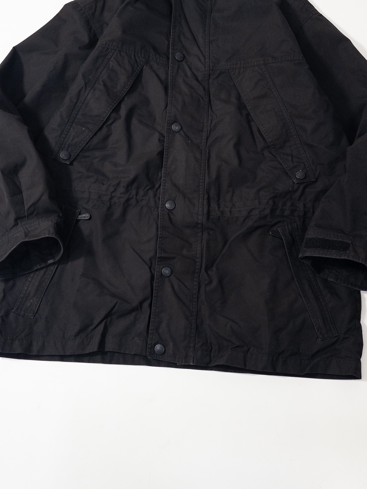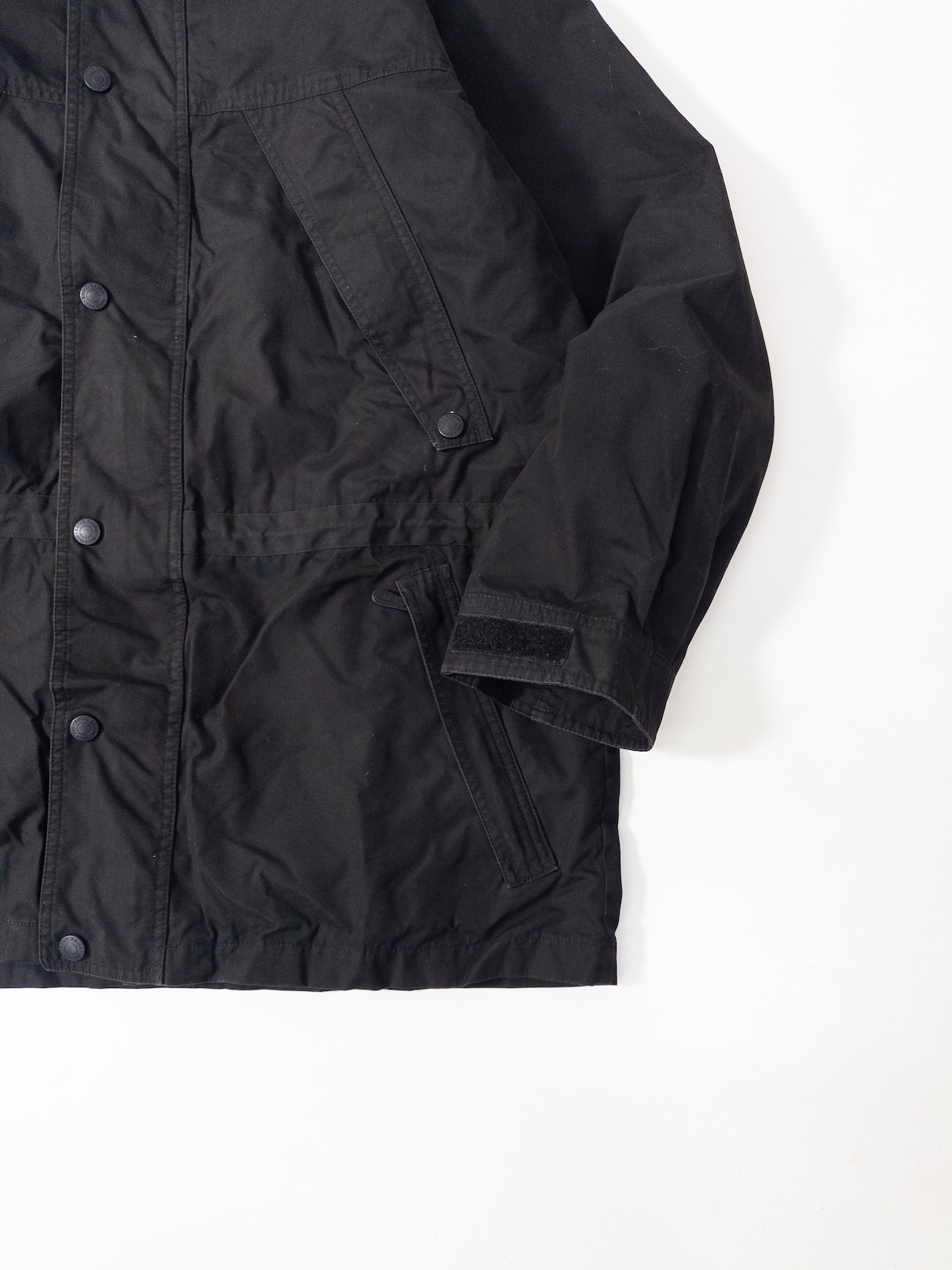 ナイロン全盛になる前後の流れを感じる、コットン混シェルのマットな質感がまずポイント。防水を誇張する方向ではなく、耐久と実用を優先していた時代の作りで、使い込むほど表情が落ち着いていくタイプです。