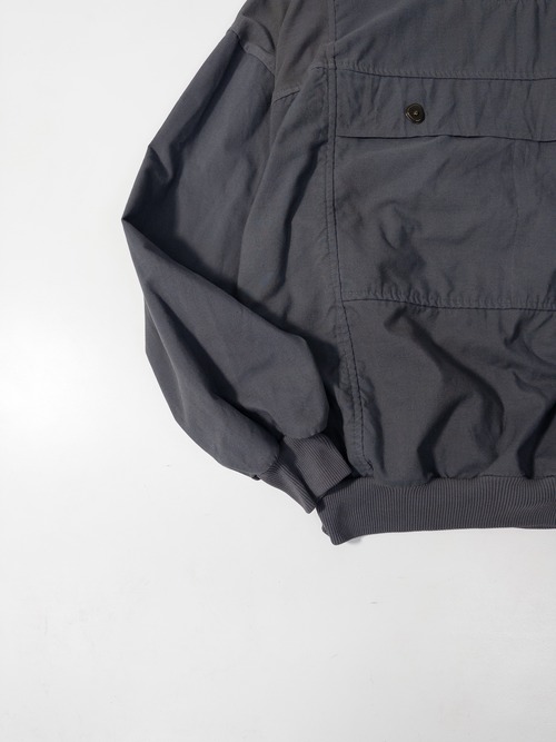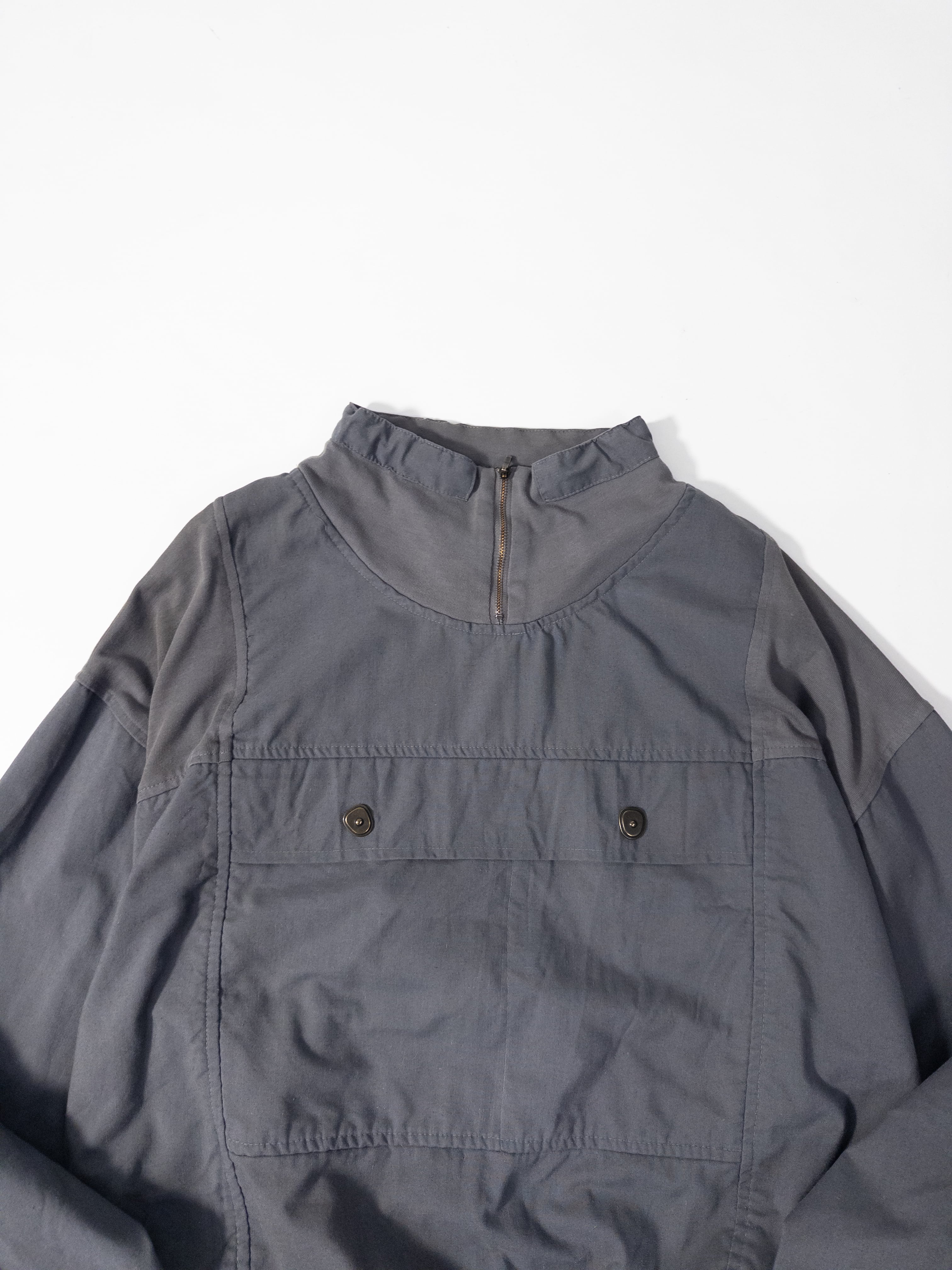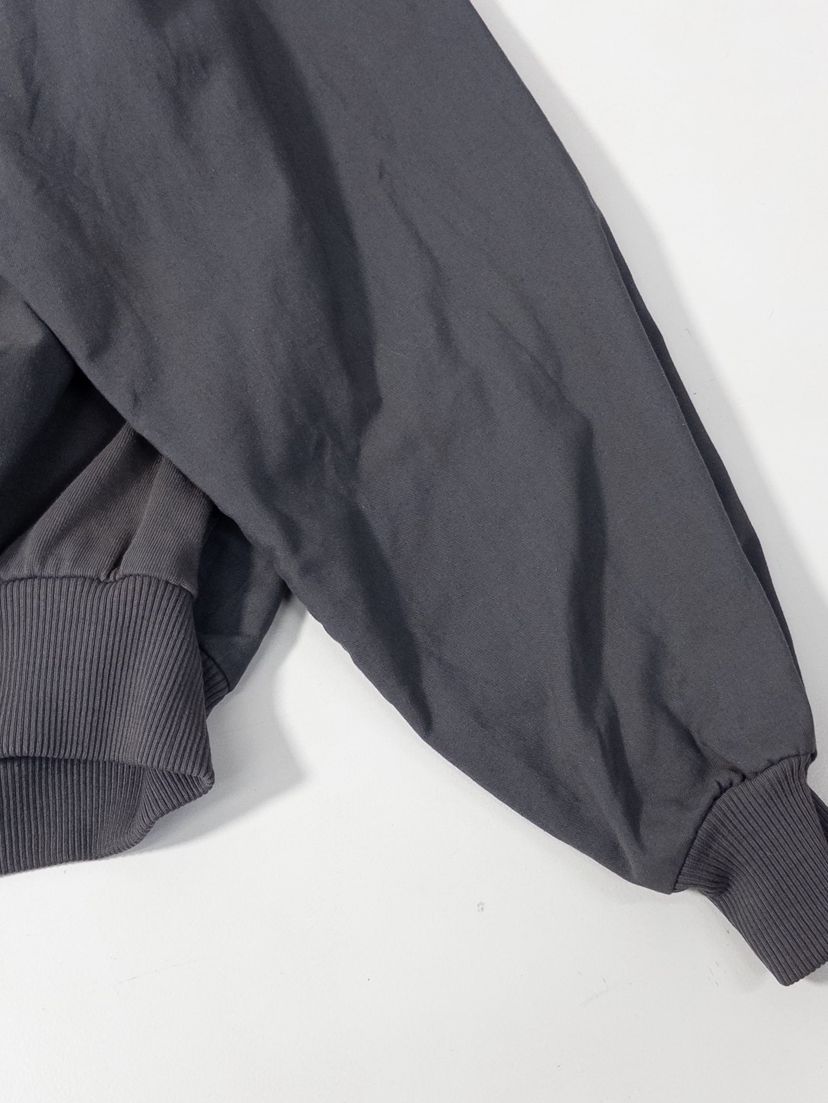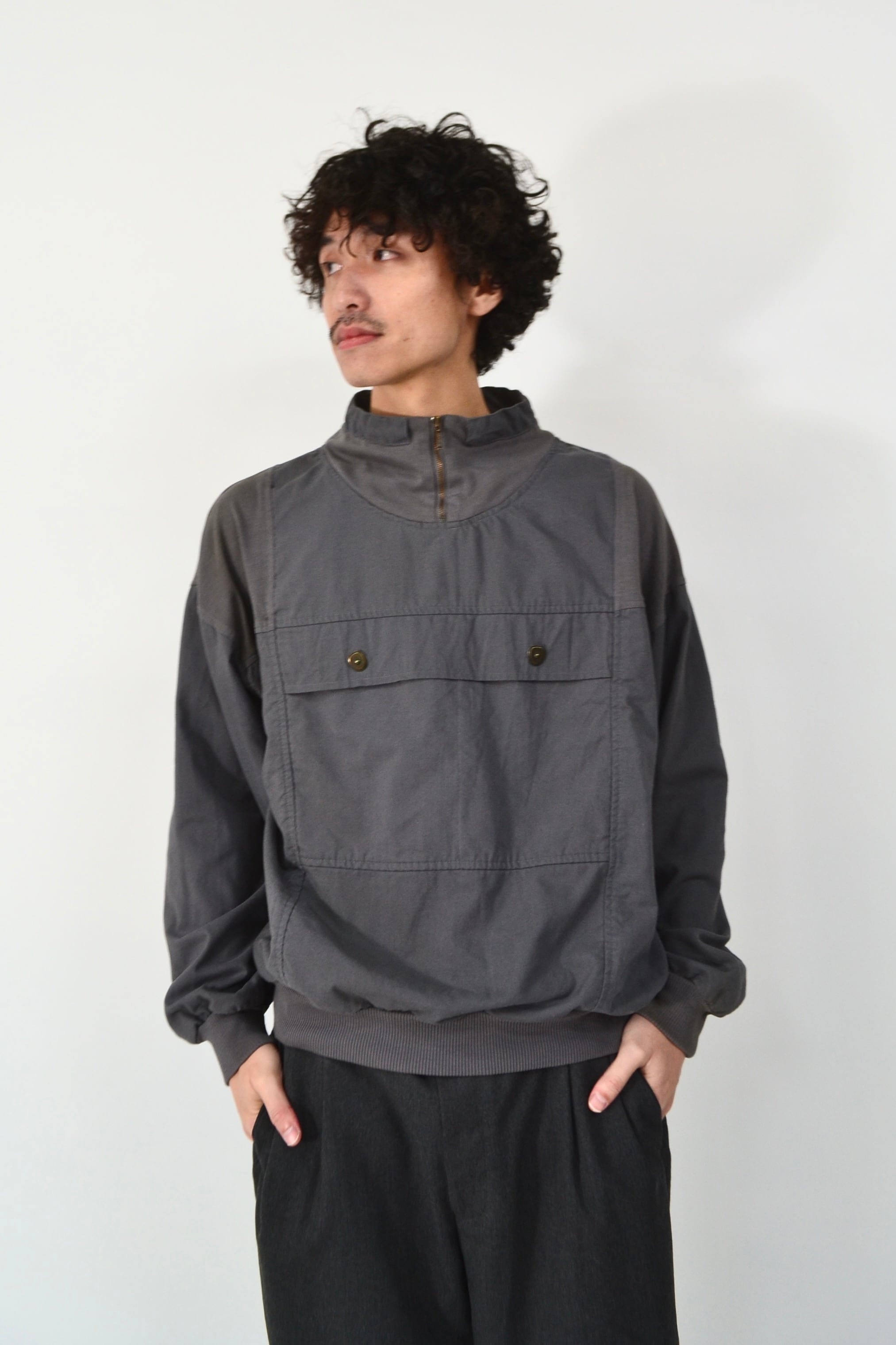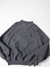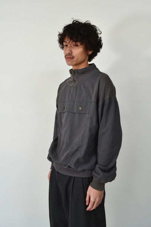 ナイロンシェルではなく、コットンポリ系のマッドな質感。光を反射しないぶん、グレーの色味が立体的に見えて、ギア感より“服”として成立しているのがポイント。ハーフジップ+リブ裾の仕様は、風を逃がしにくく、当時のアウトドアとスウェットの中間的発想がそのまま残っています。今見ると、テックでもヴィンテージでもない、ちょっと宙に浮いたバランスが逆に新鮮。