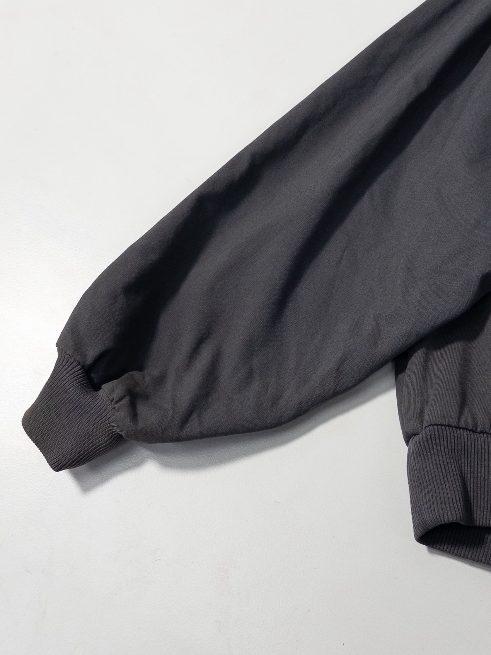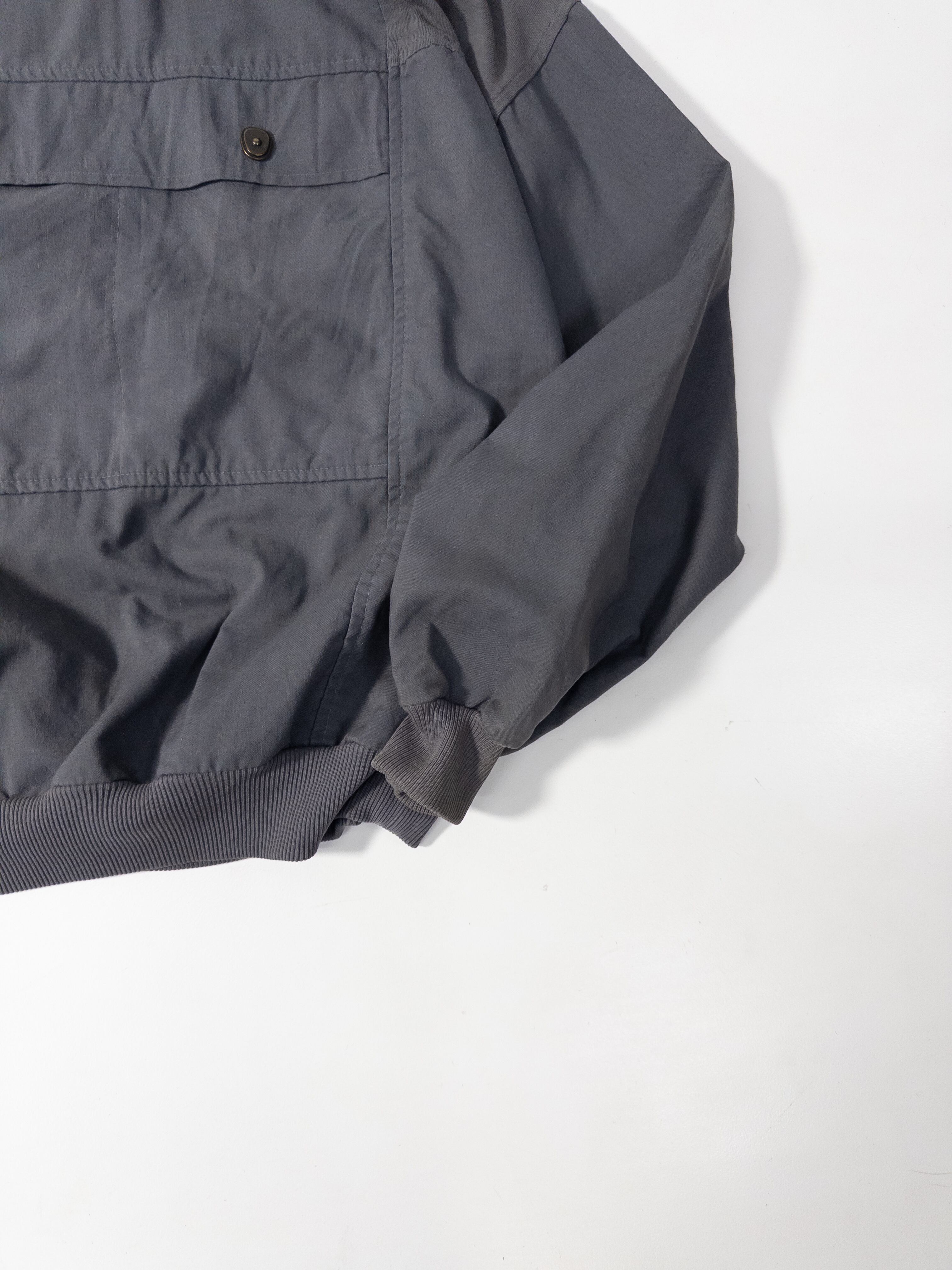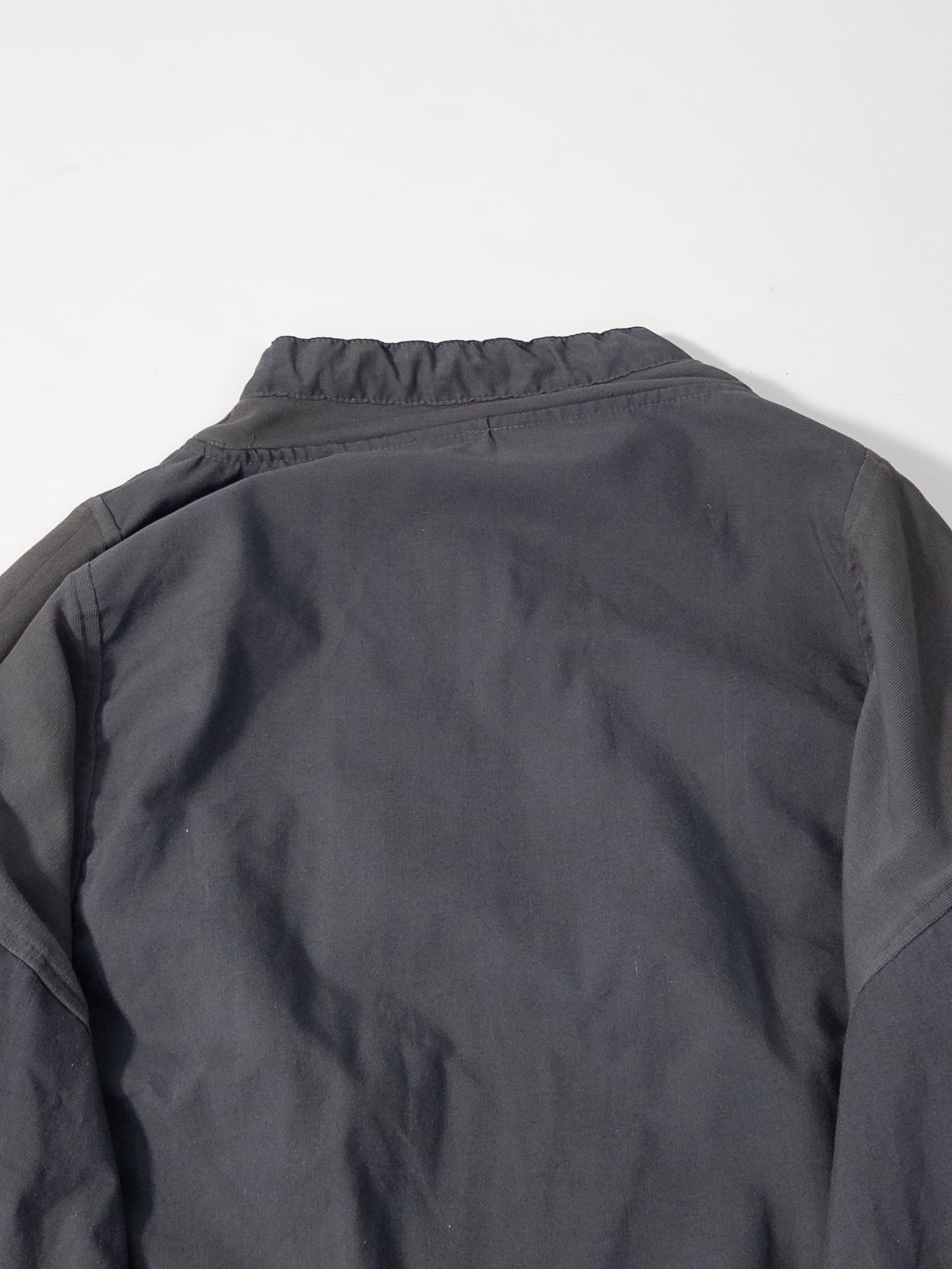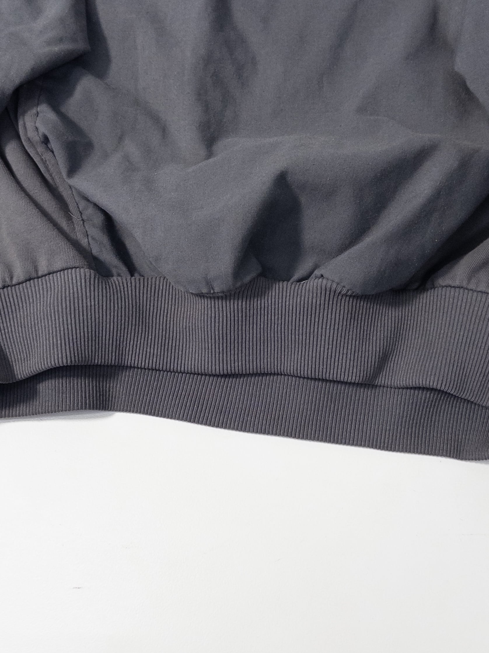 ナイロンシェルではなく、コットンポリ系のマッドな質感。光を反射しないぶん、グレーの色味が立体的に見えて、ギア感より“服”として成立しているのがポイント。ハーフジップ+リブ裾の仕様は、風を逃がしにくく、当時のアウトドアとスウェットの中間的発想がそのまま残っています。今見ると、テックでもヴィンテージでもない、ちょっと宙に浮いたバランスが逆に新鮮。