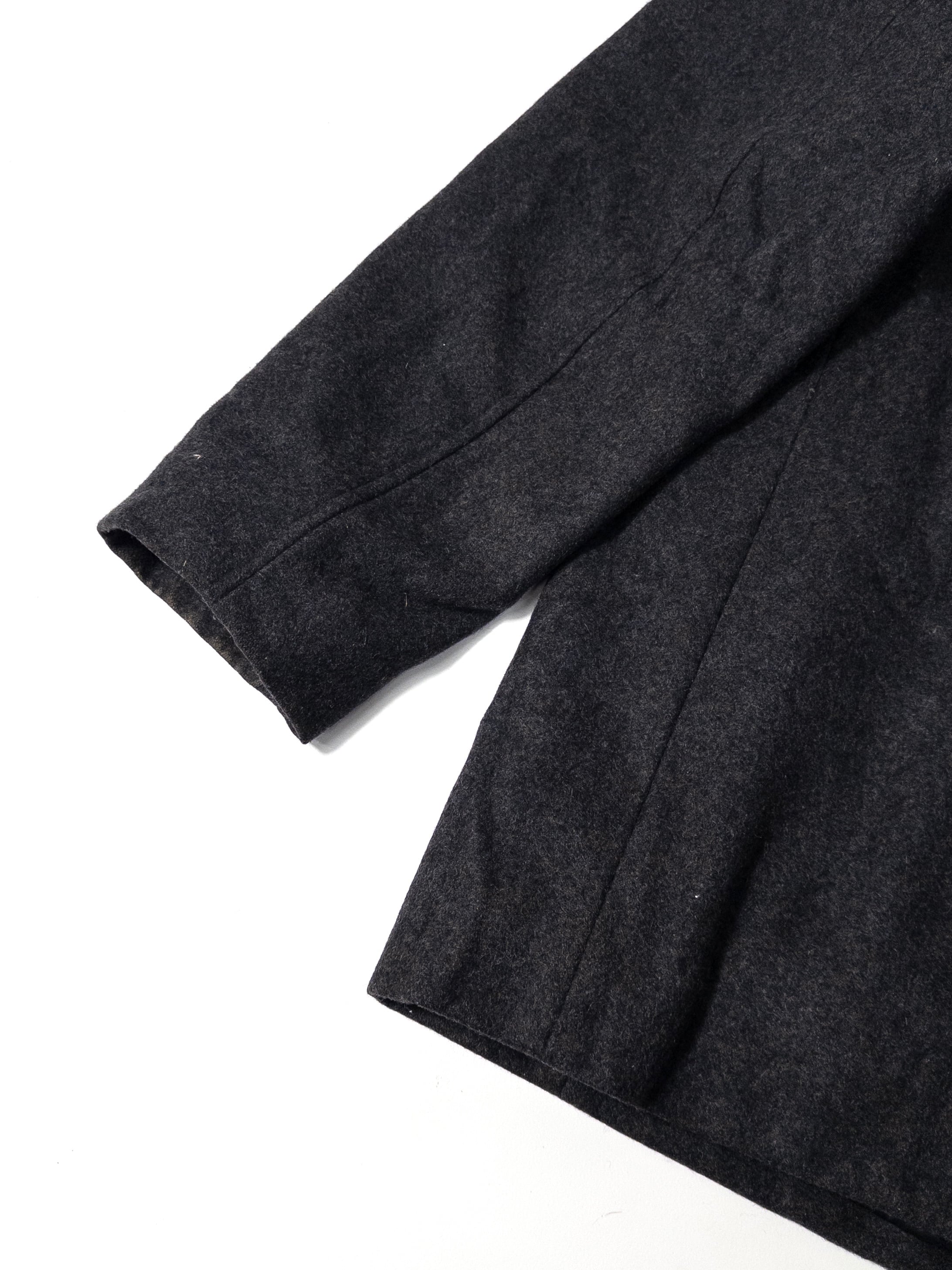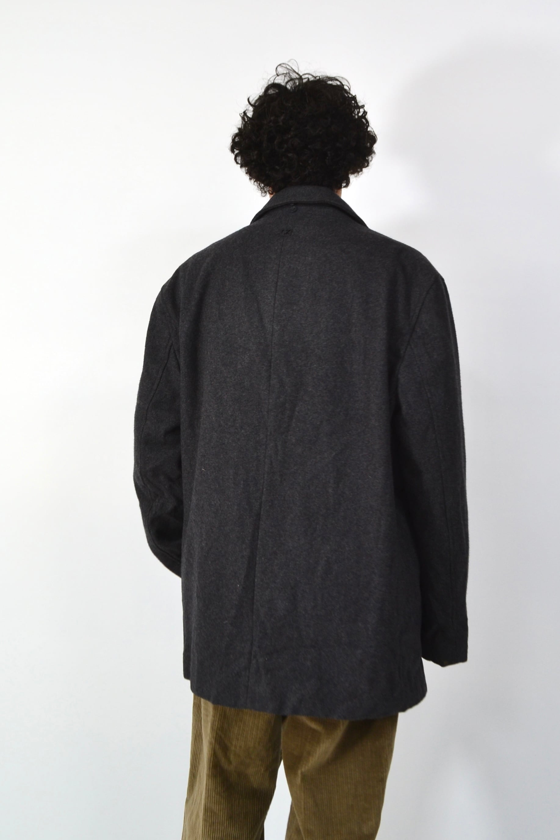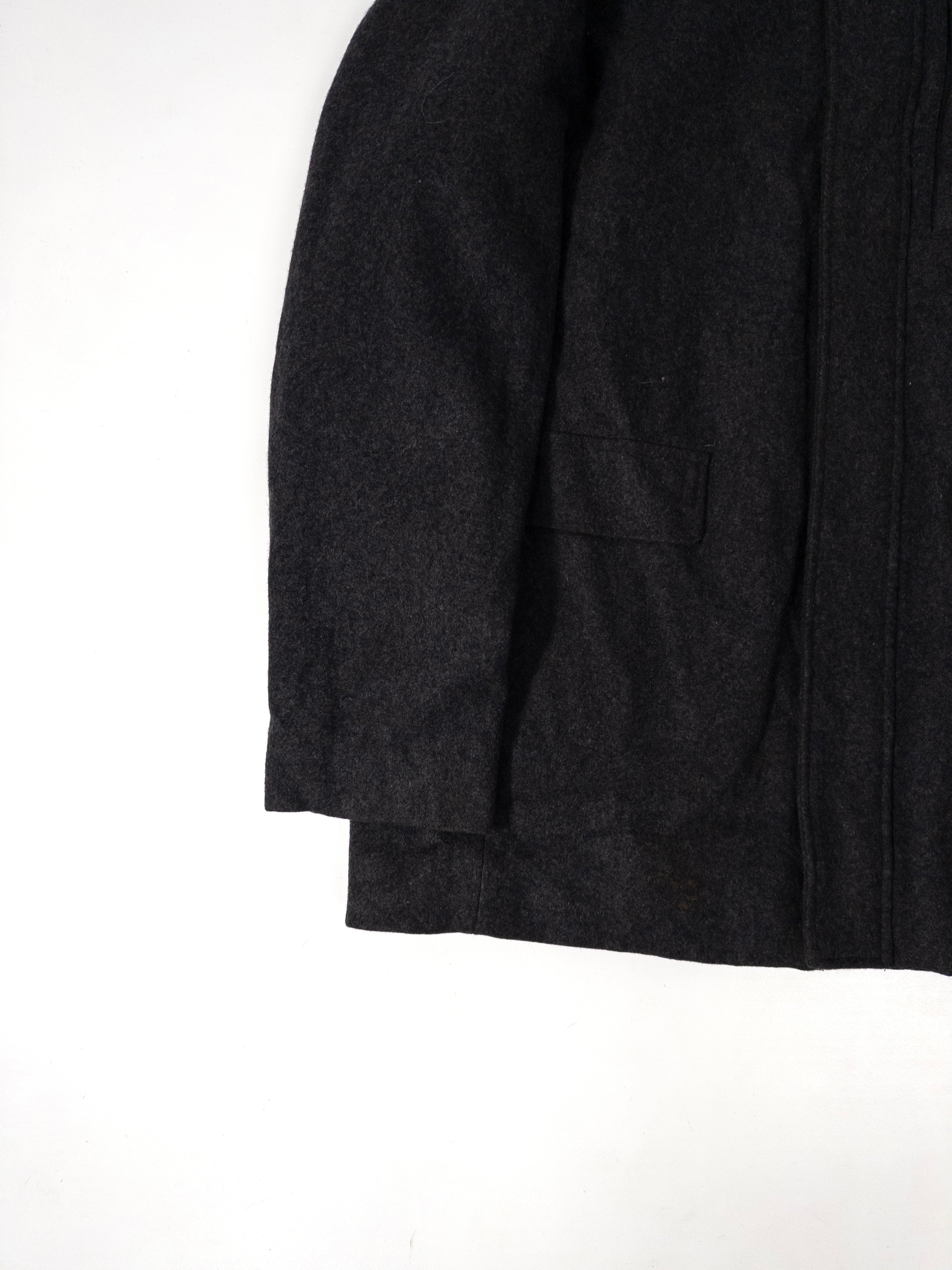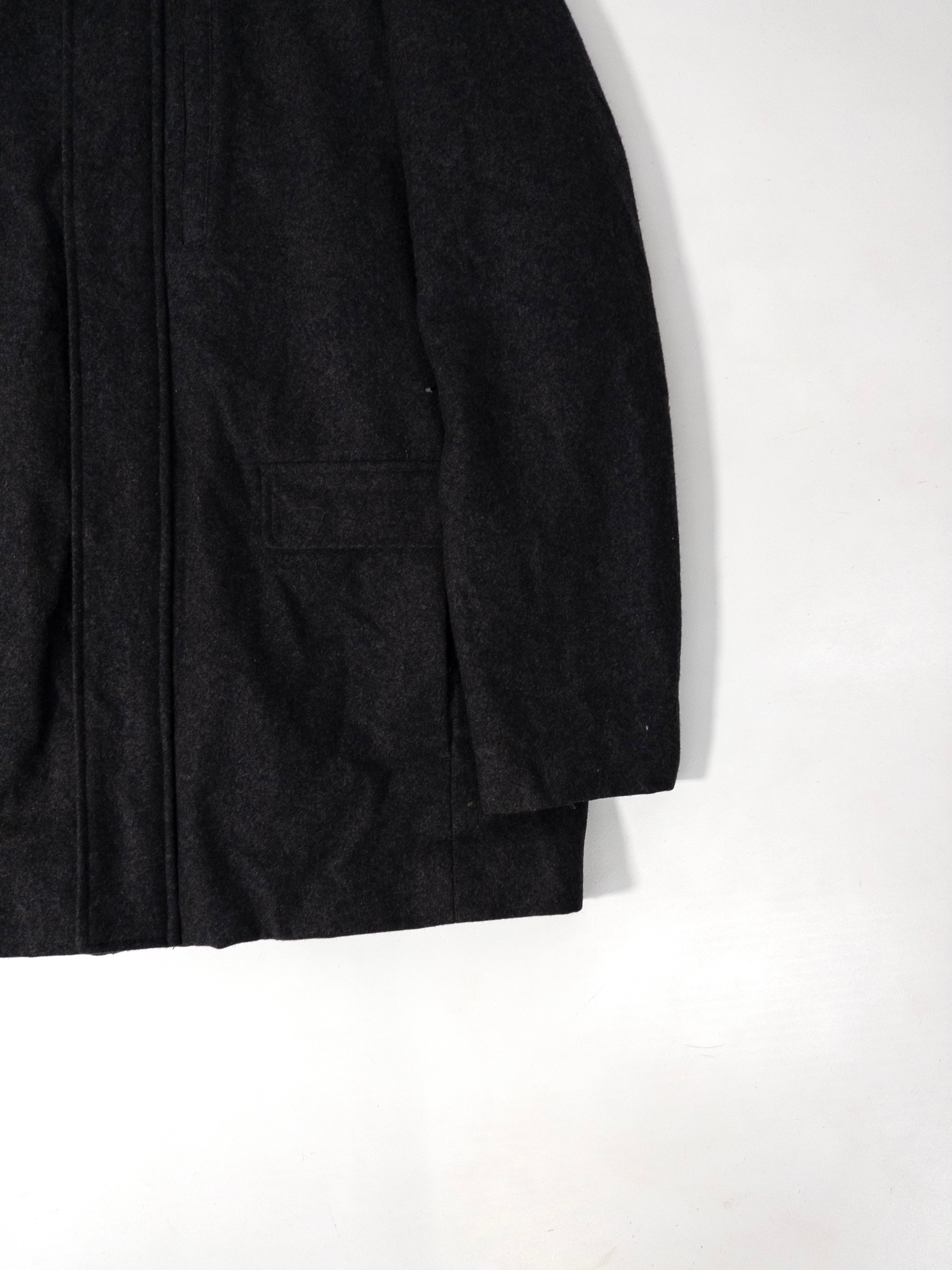 表地はメルトン寄りだけど硬すぎず、起毛感も控えめ。黒ではなく、チャコールに近い深い色味なのがポイントで、光の当たり方で表情が変わる。中は総キルティングで、コートほど重くないのにしっかり保温性がある。