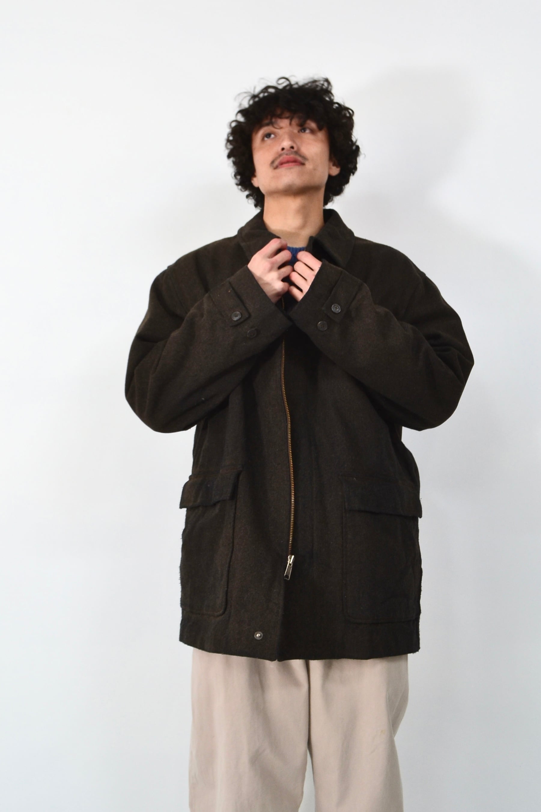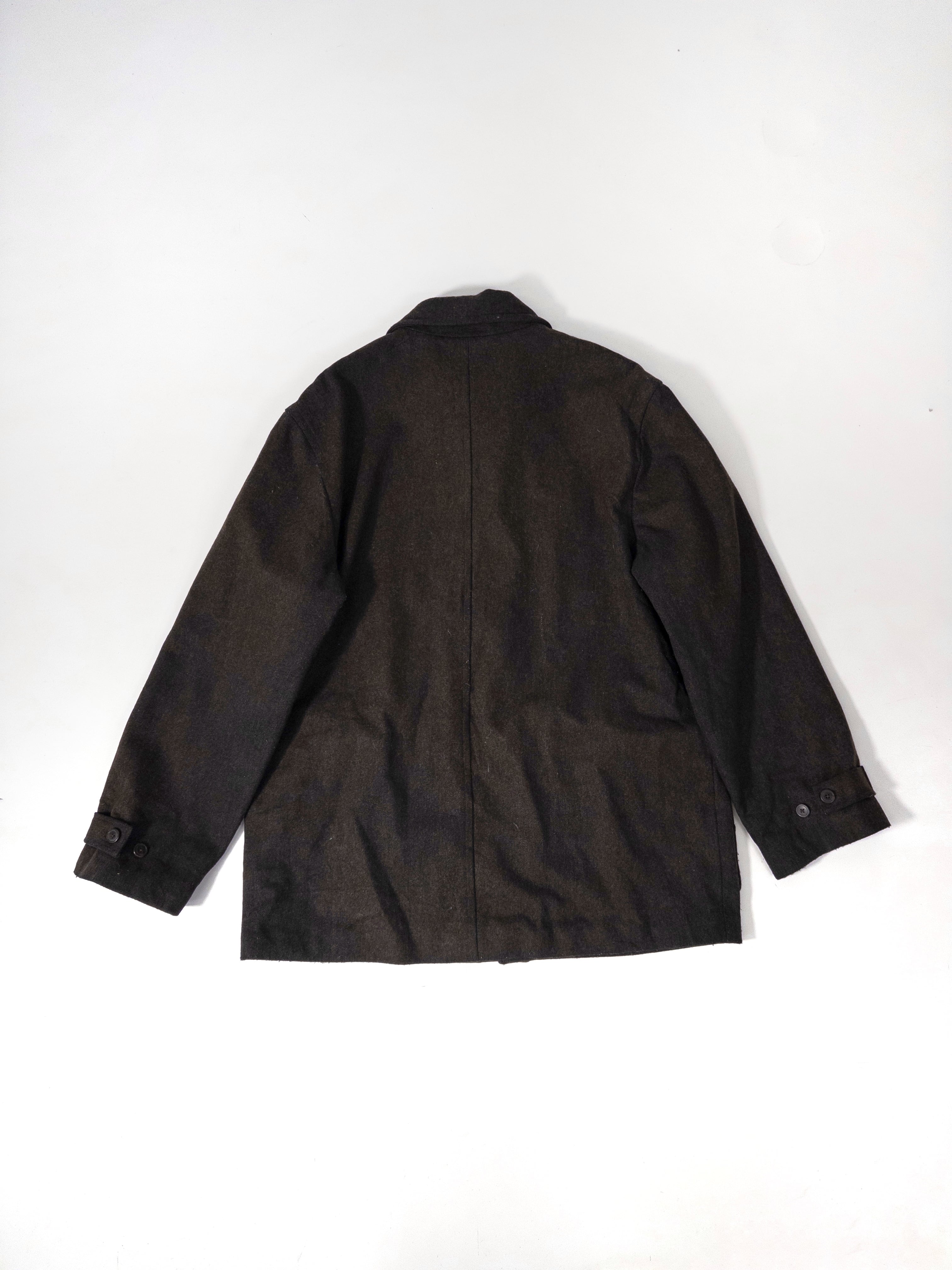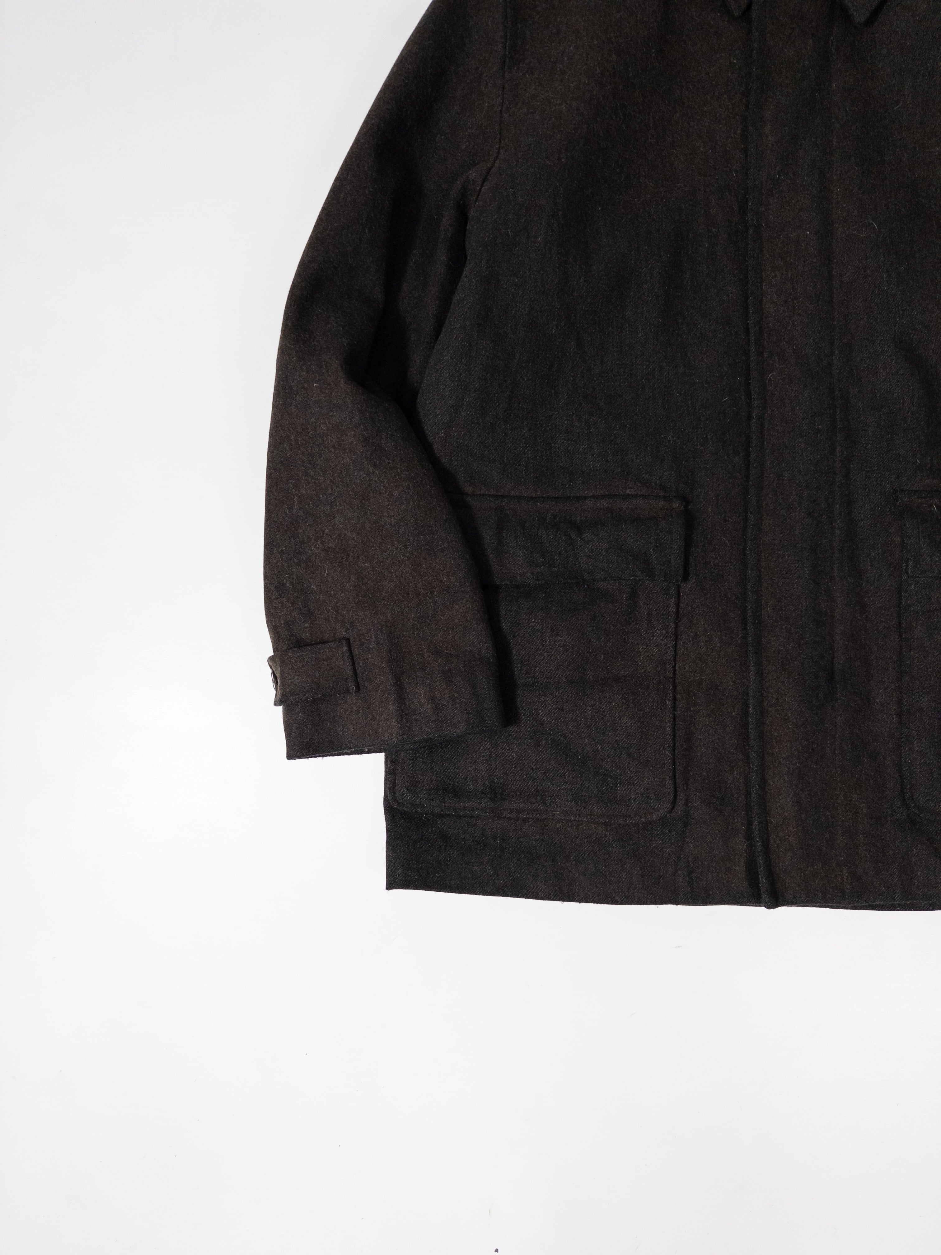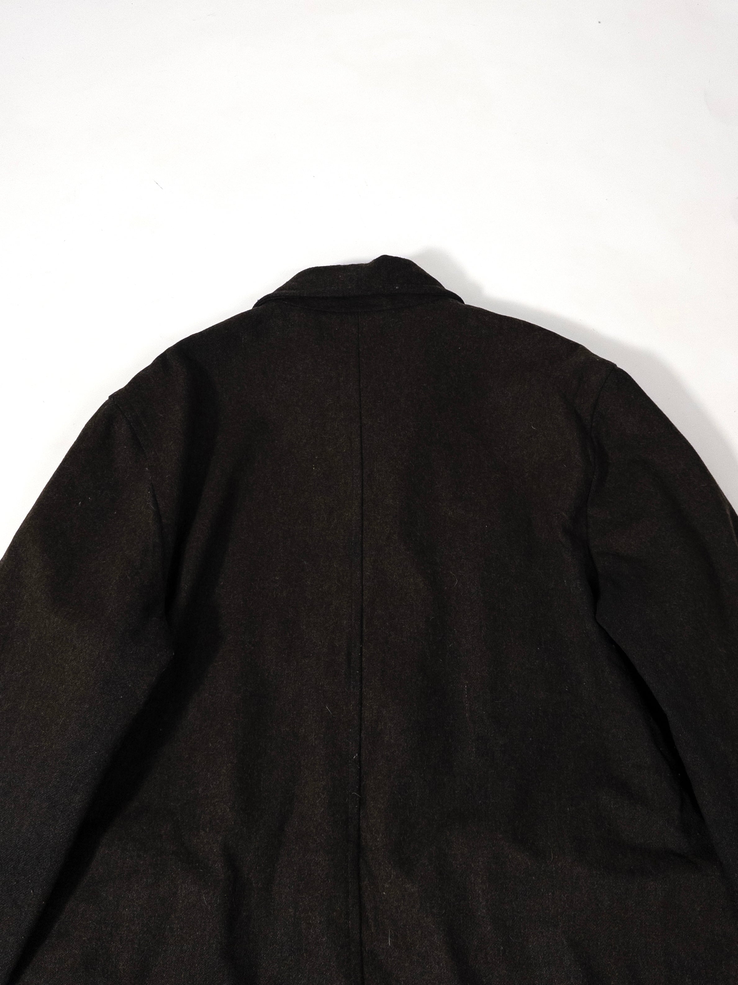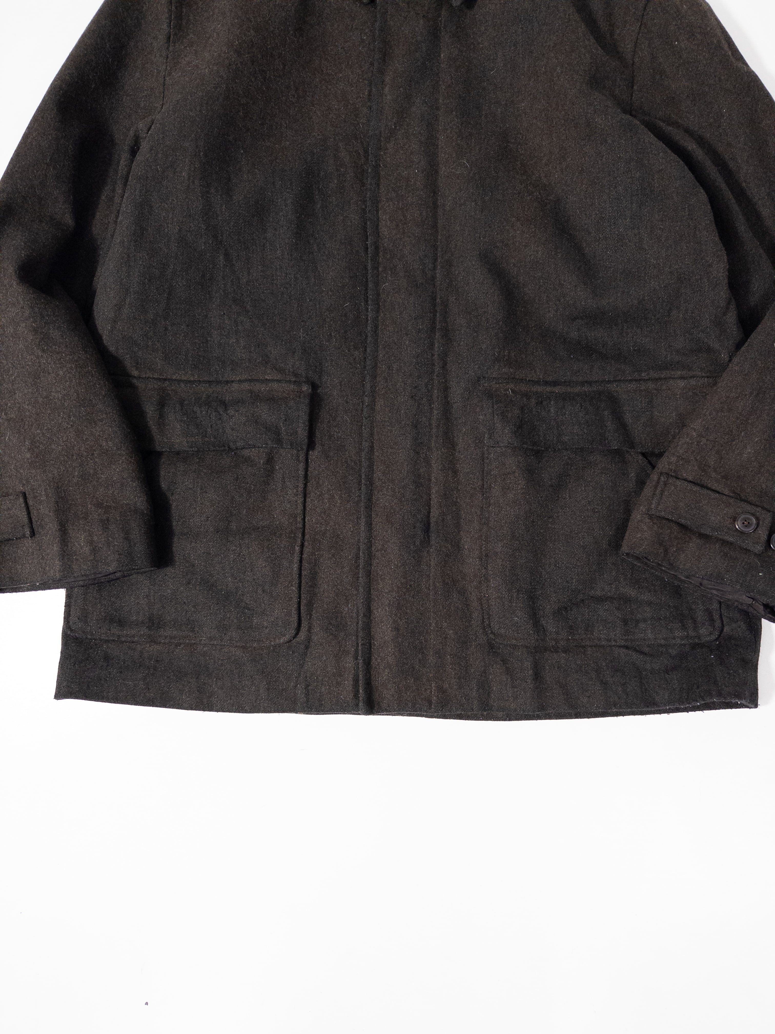 表地は起毛感のあるウール混。完全なメルトンほど硬くなく、少しラフで空気を含むような質感が特徴。インナーには薄く中綿が入っていて、見た目以上に軽く、コート未満・アウター以上のちょうどいい立ち位置。