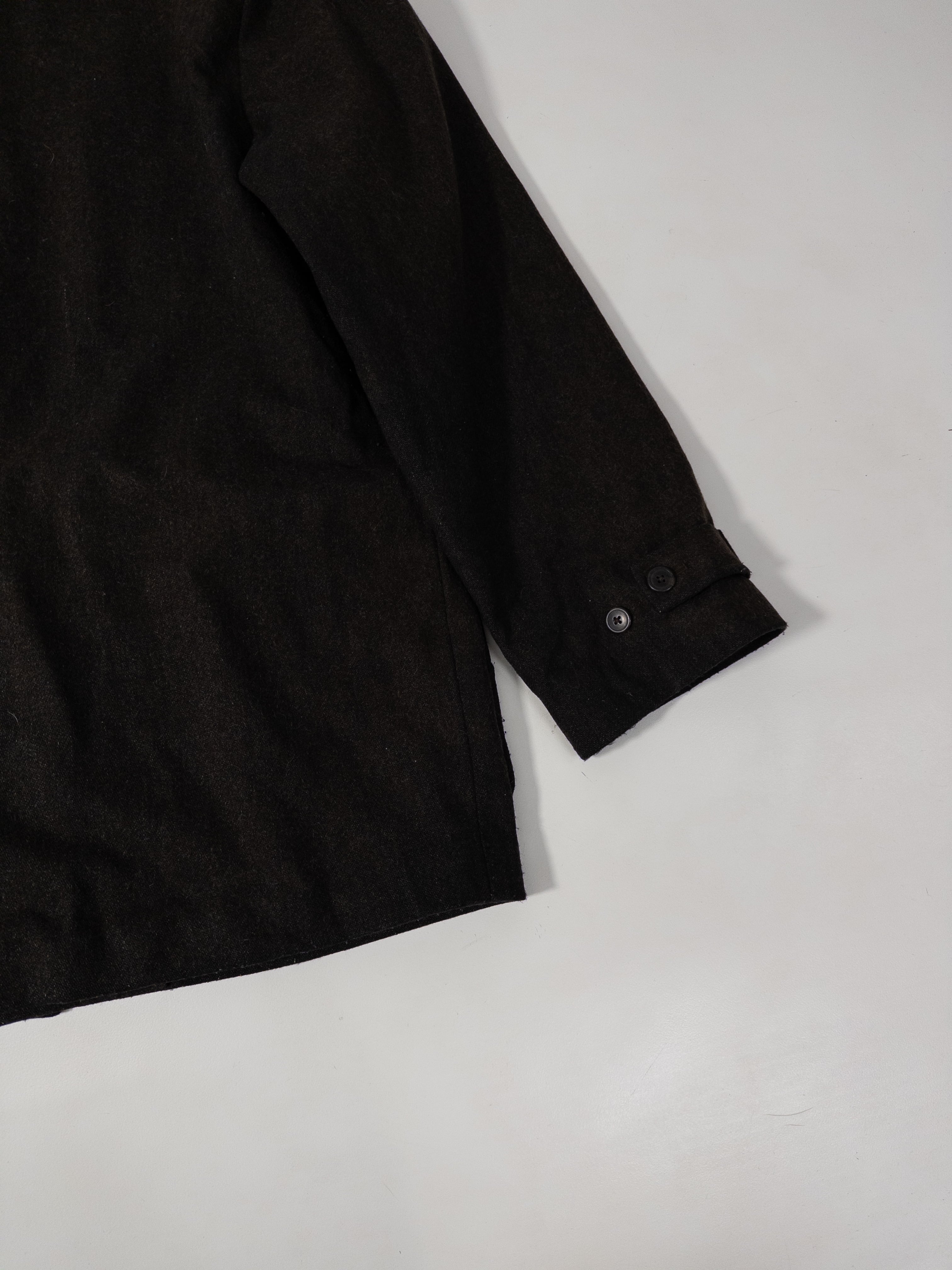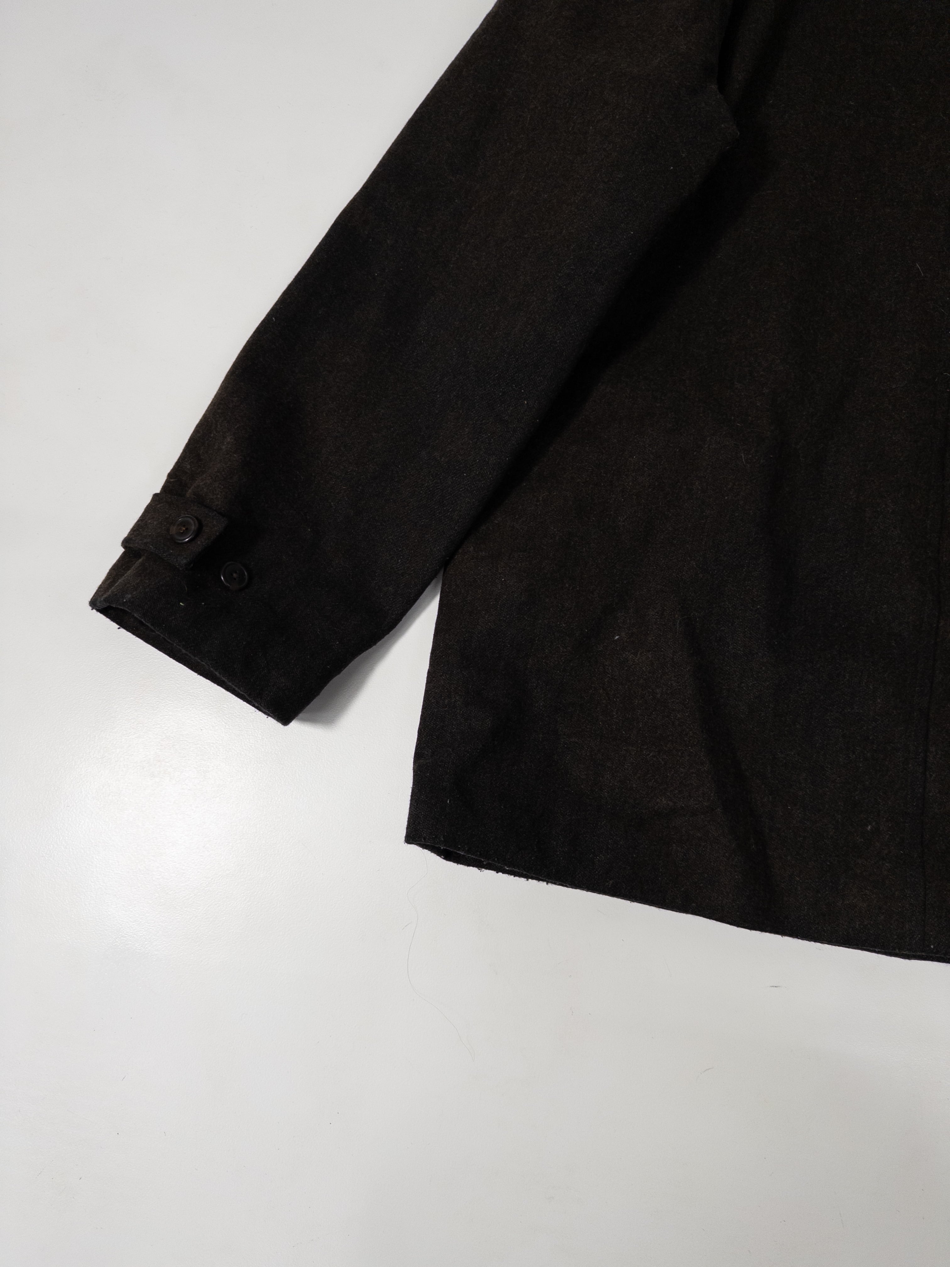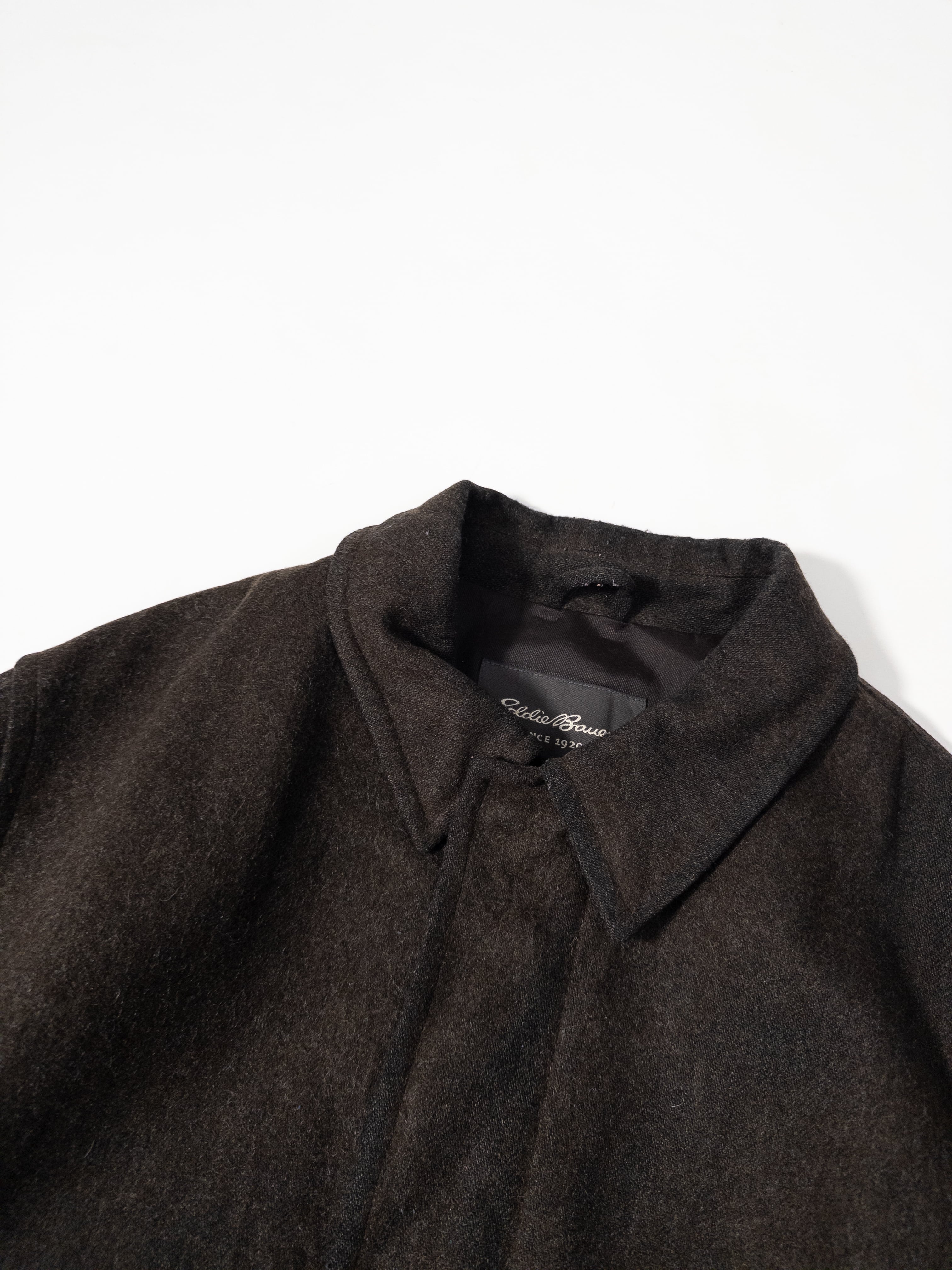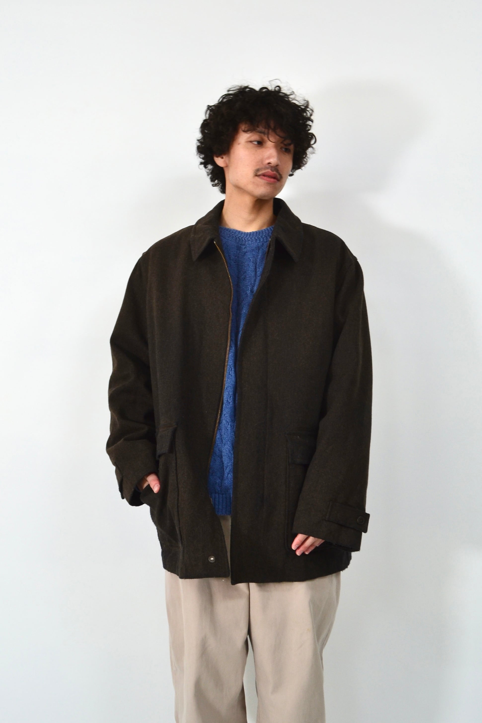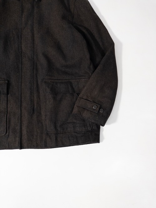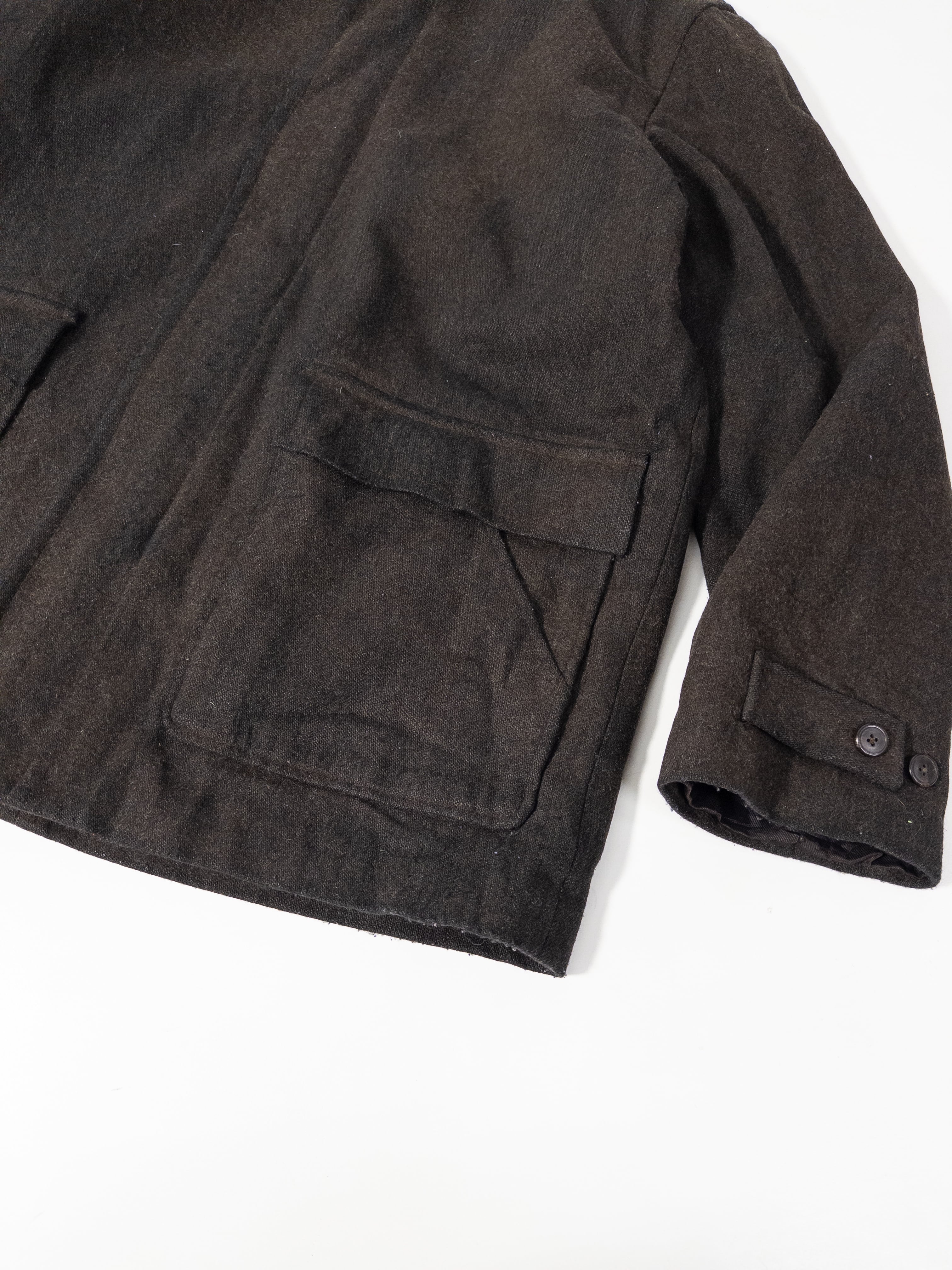 表地は起毛感のあるウール混。完全なメルトンほど硬くなく、少しラフで空気を含むような質感が特徴。インナーには薄く中綿が入っていて、見た目以上に軽く、コート未満・アウター以上のちょうどいい立ち位置。