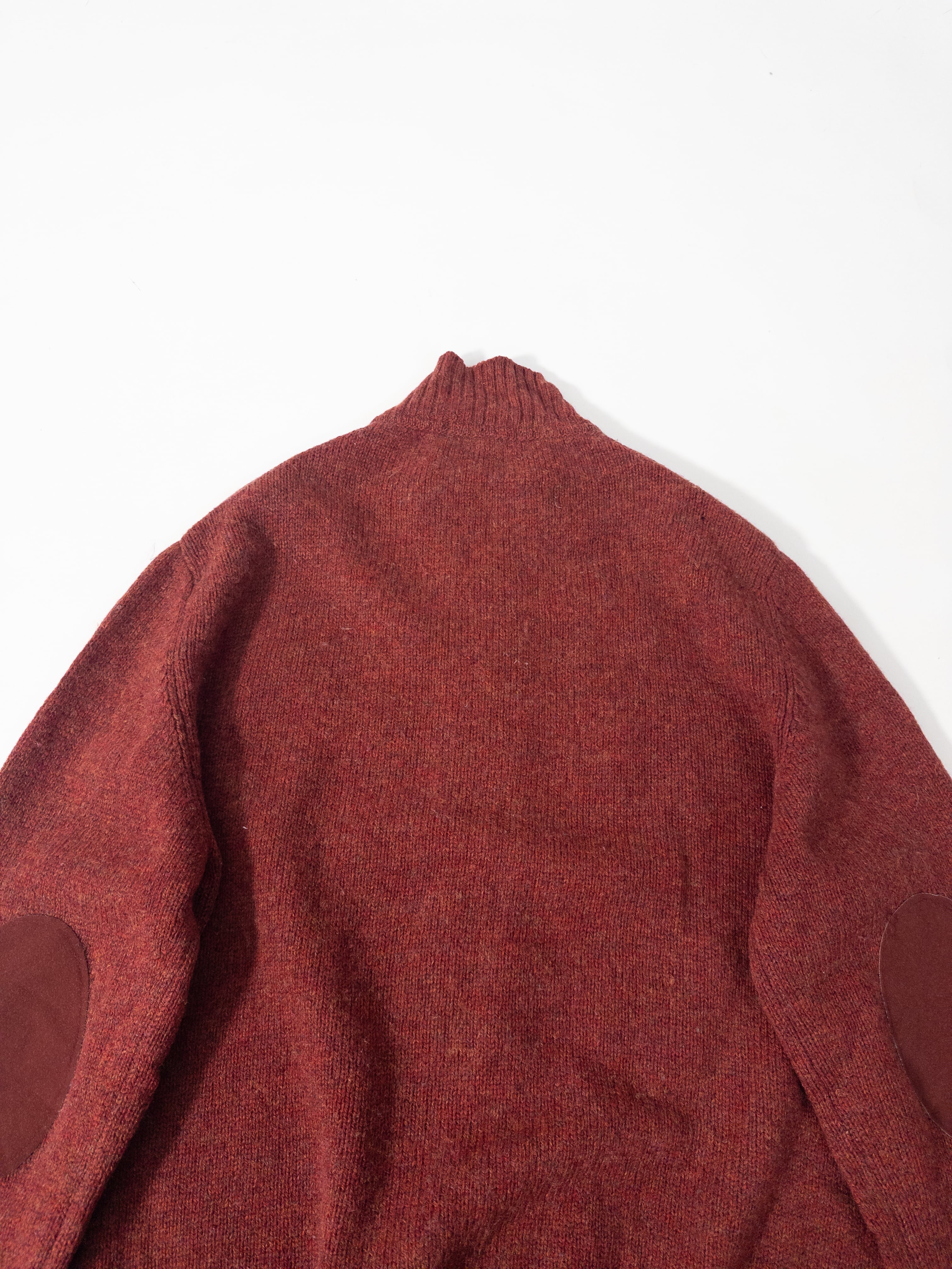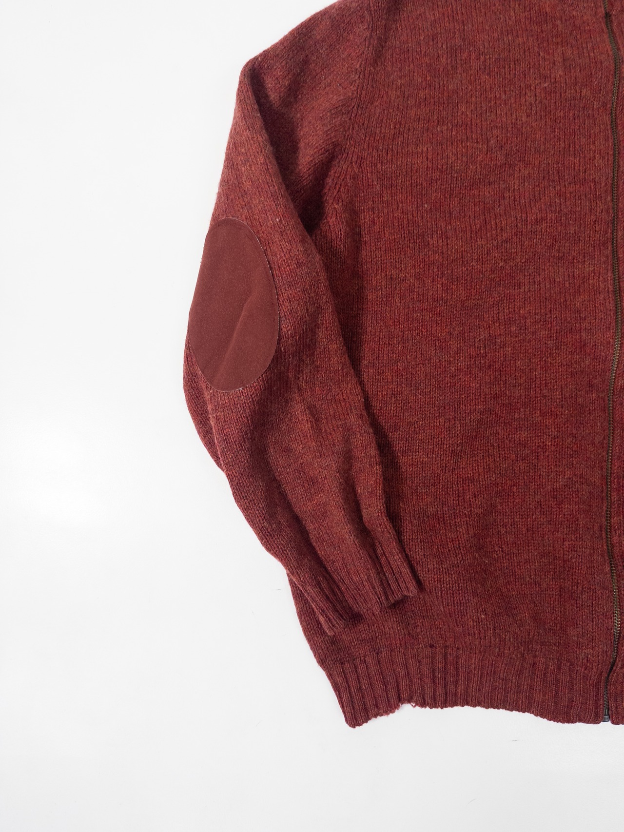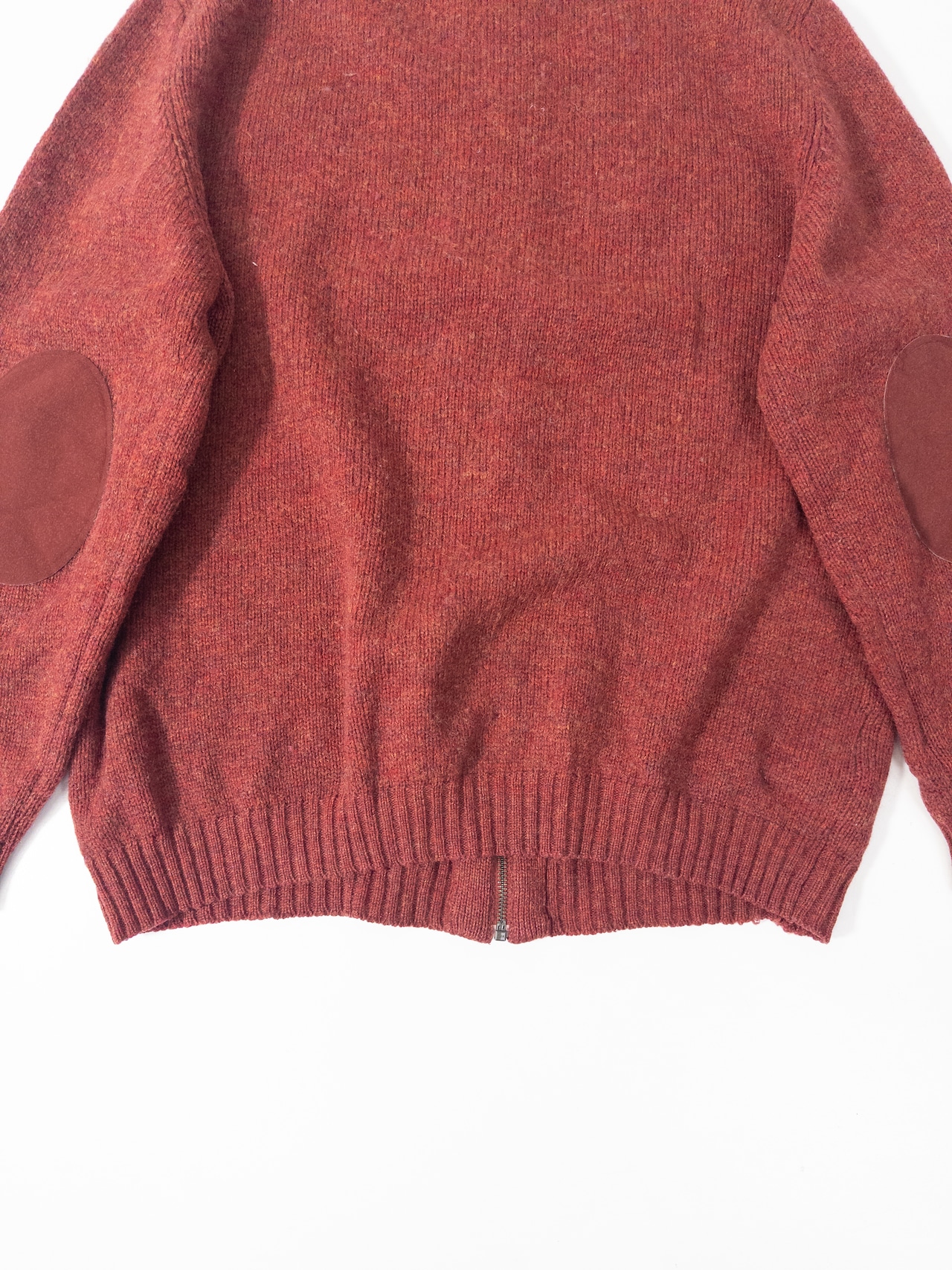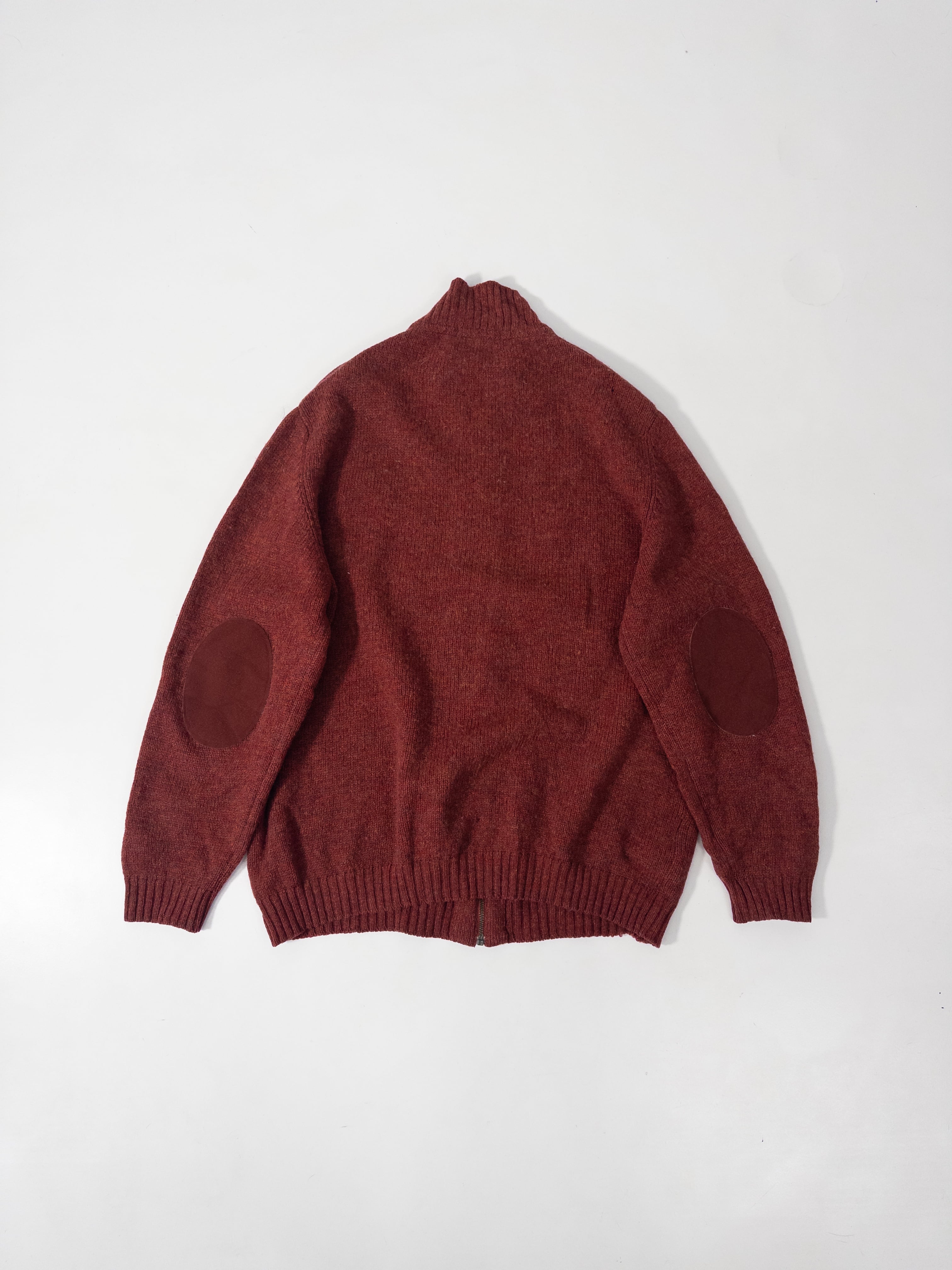 スタンドカラー+フルジップ+エルボーパッチという構成は、明らかに「羽織り」として設計されたニット。