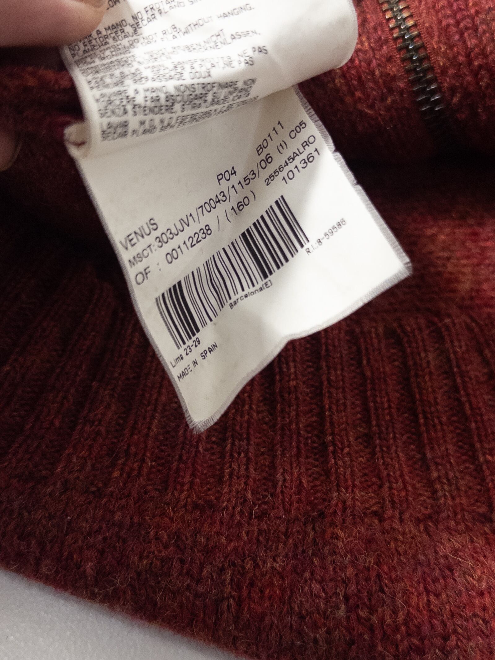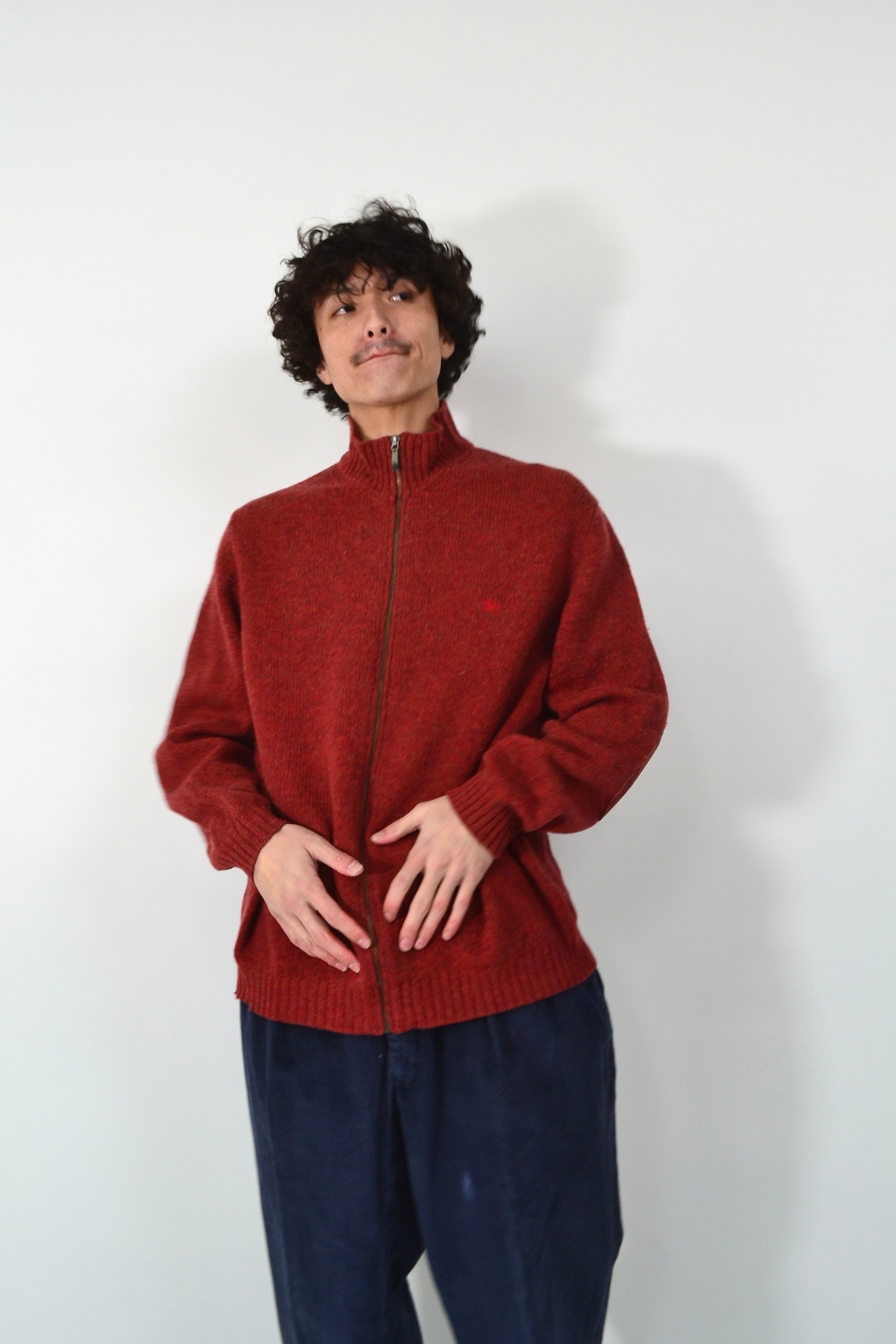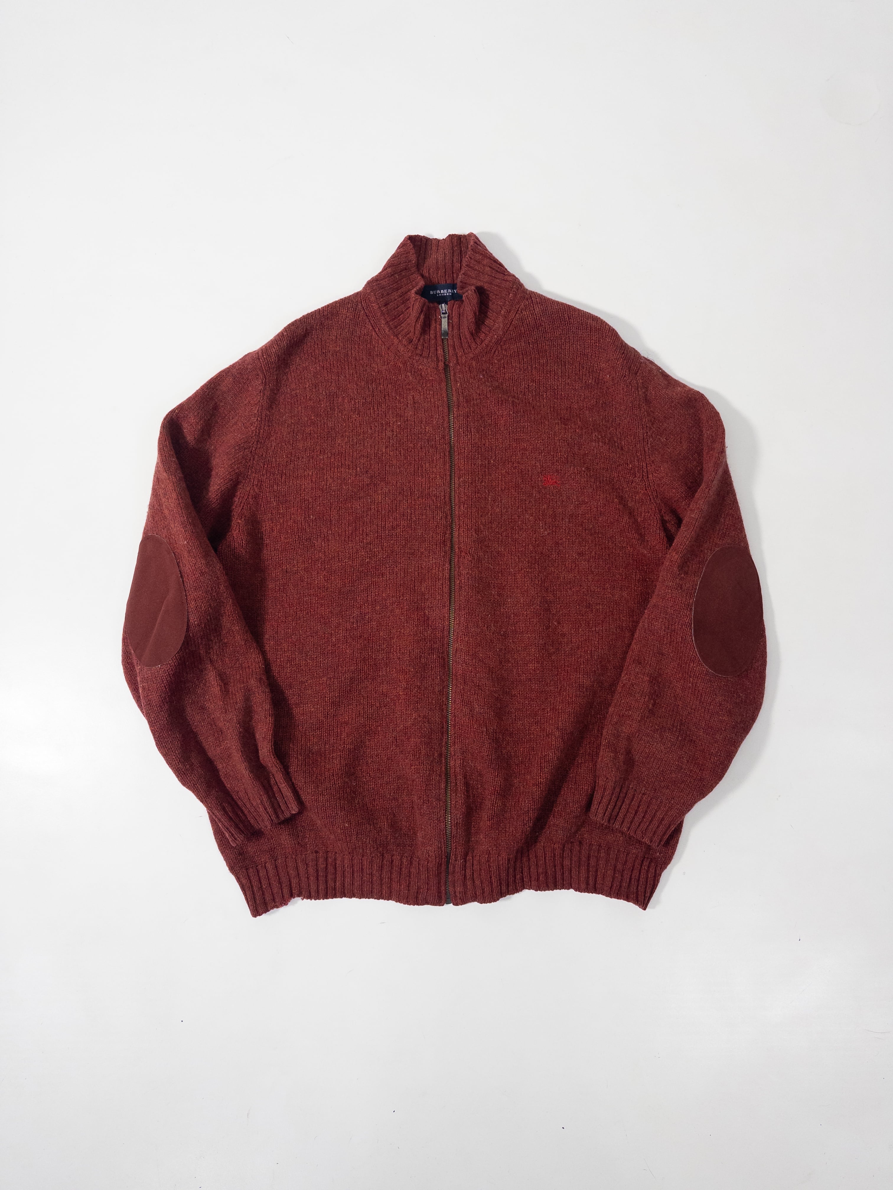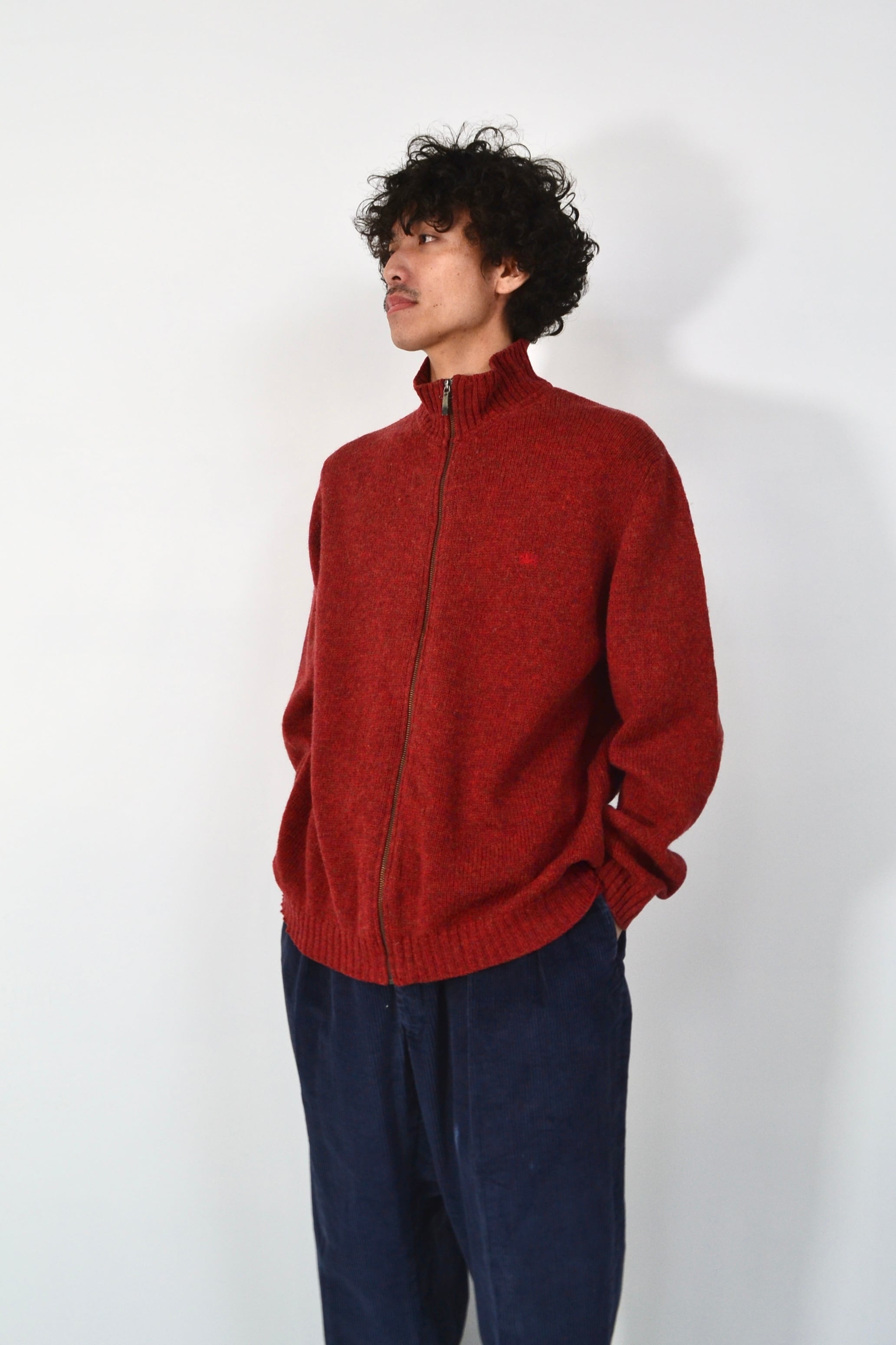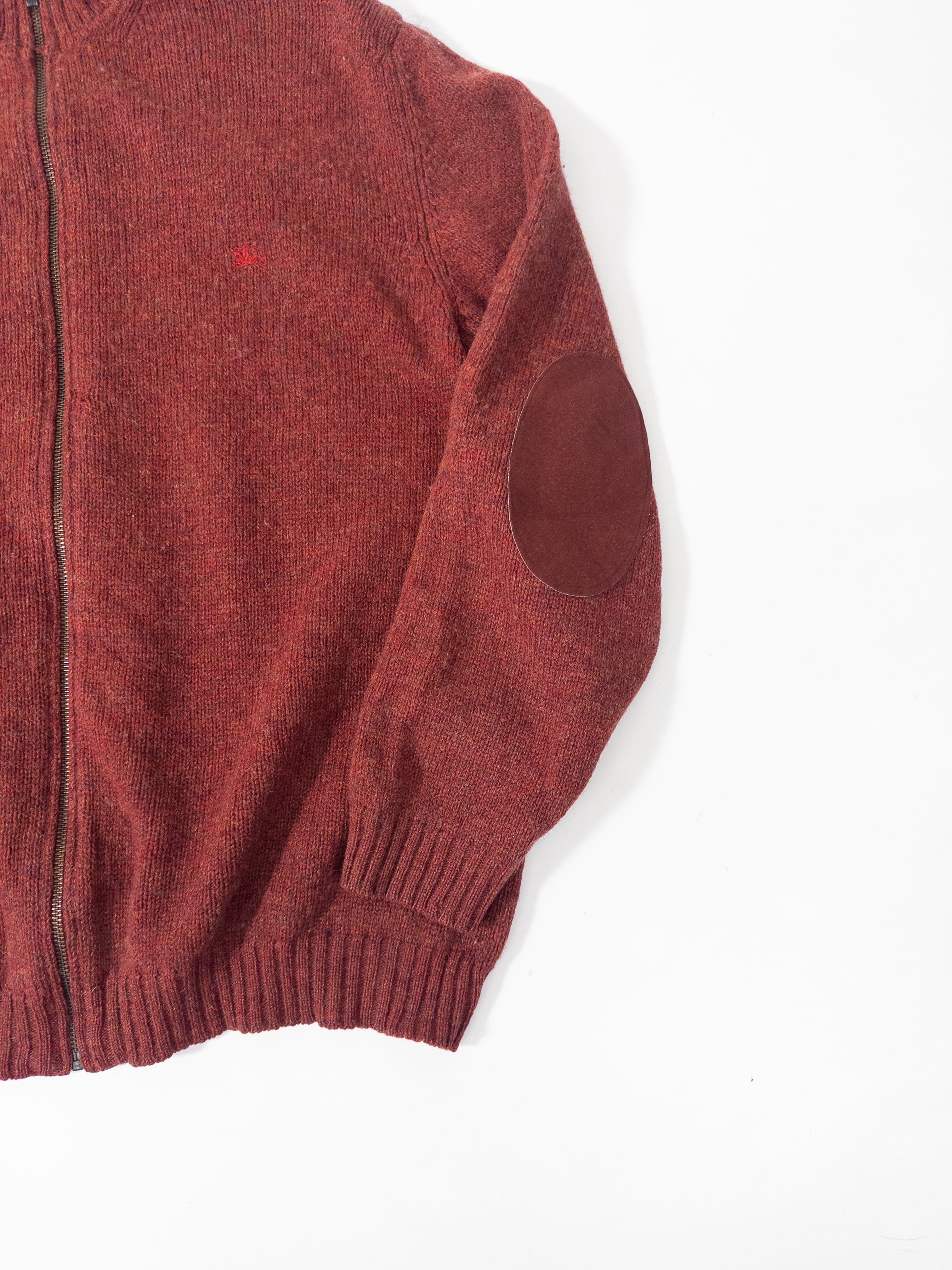 スタンドカラー+フルジップ+エルボーパッチという構成は、明らかに「羽織り」として設計されたニット。