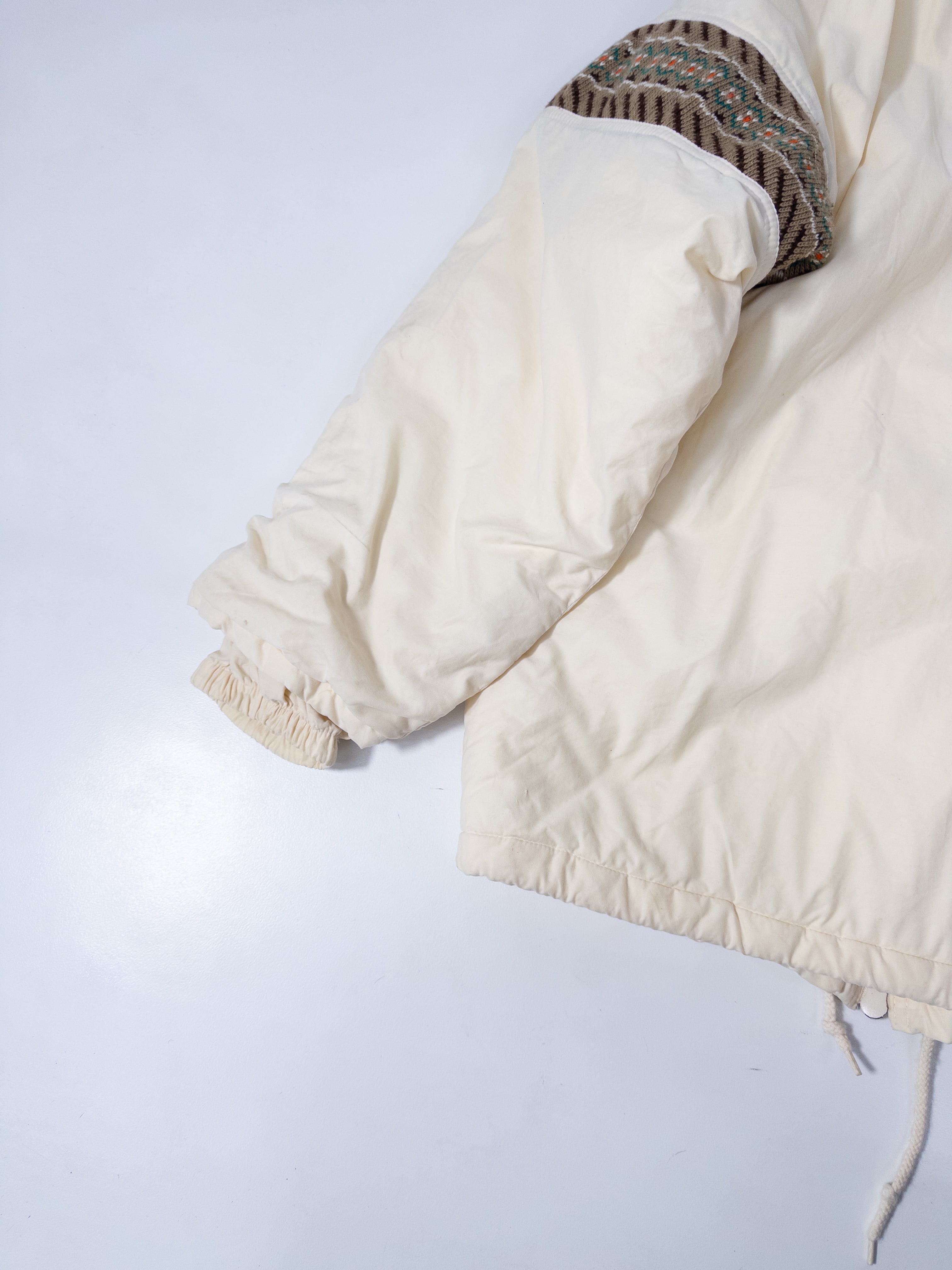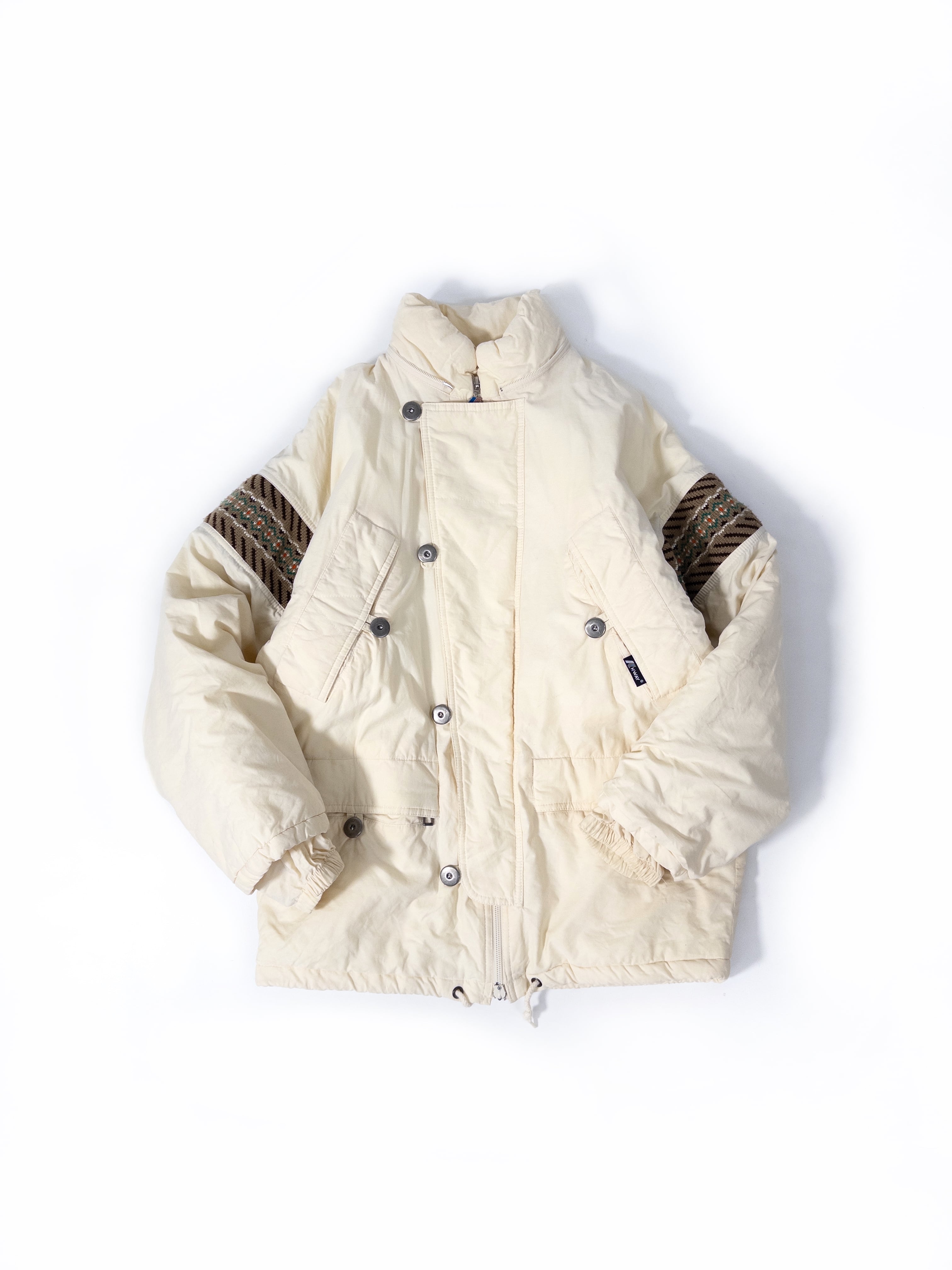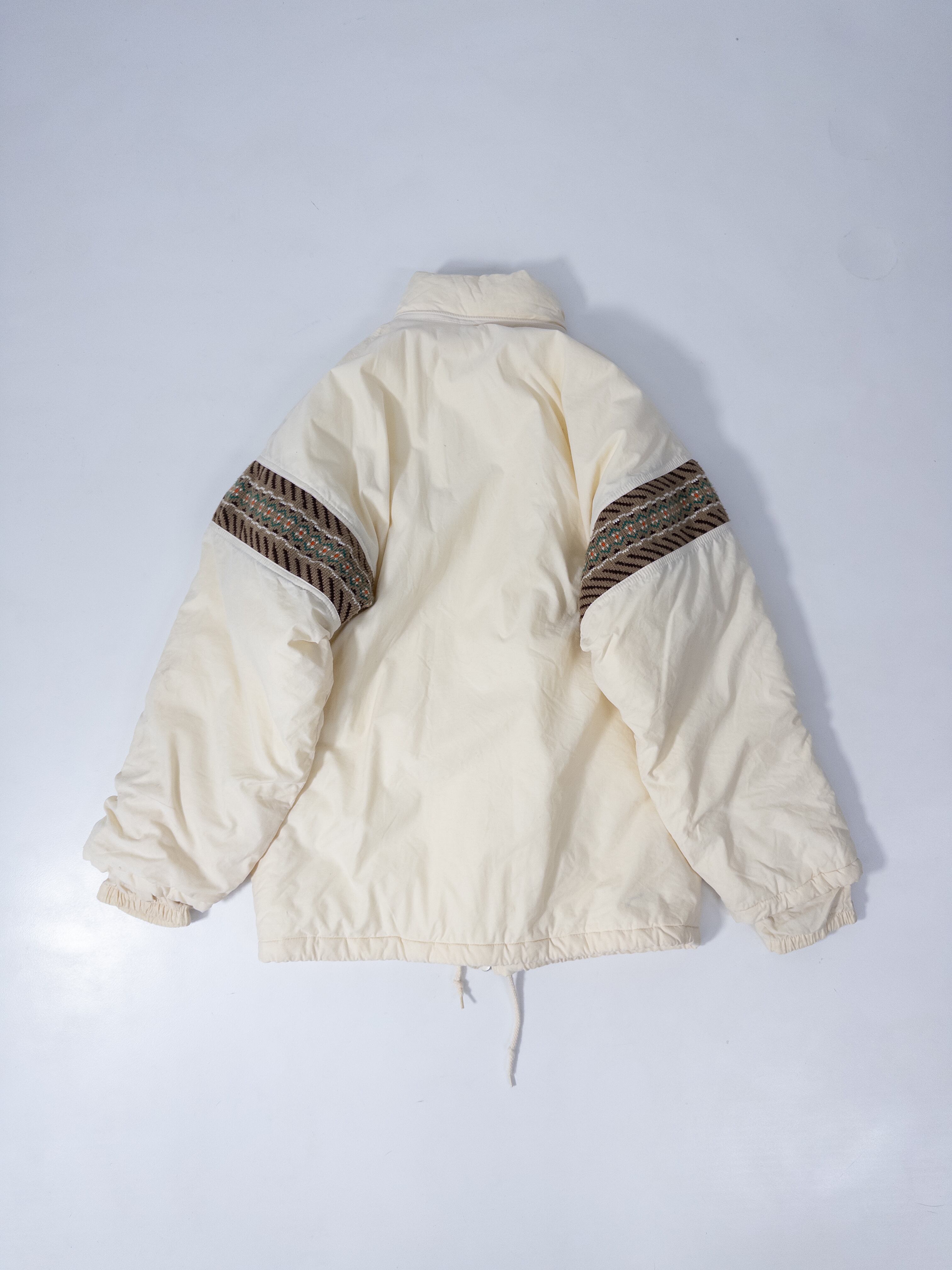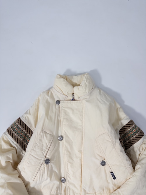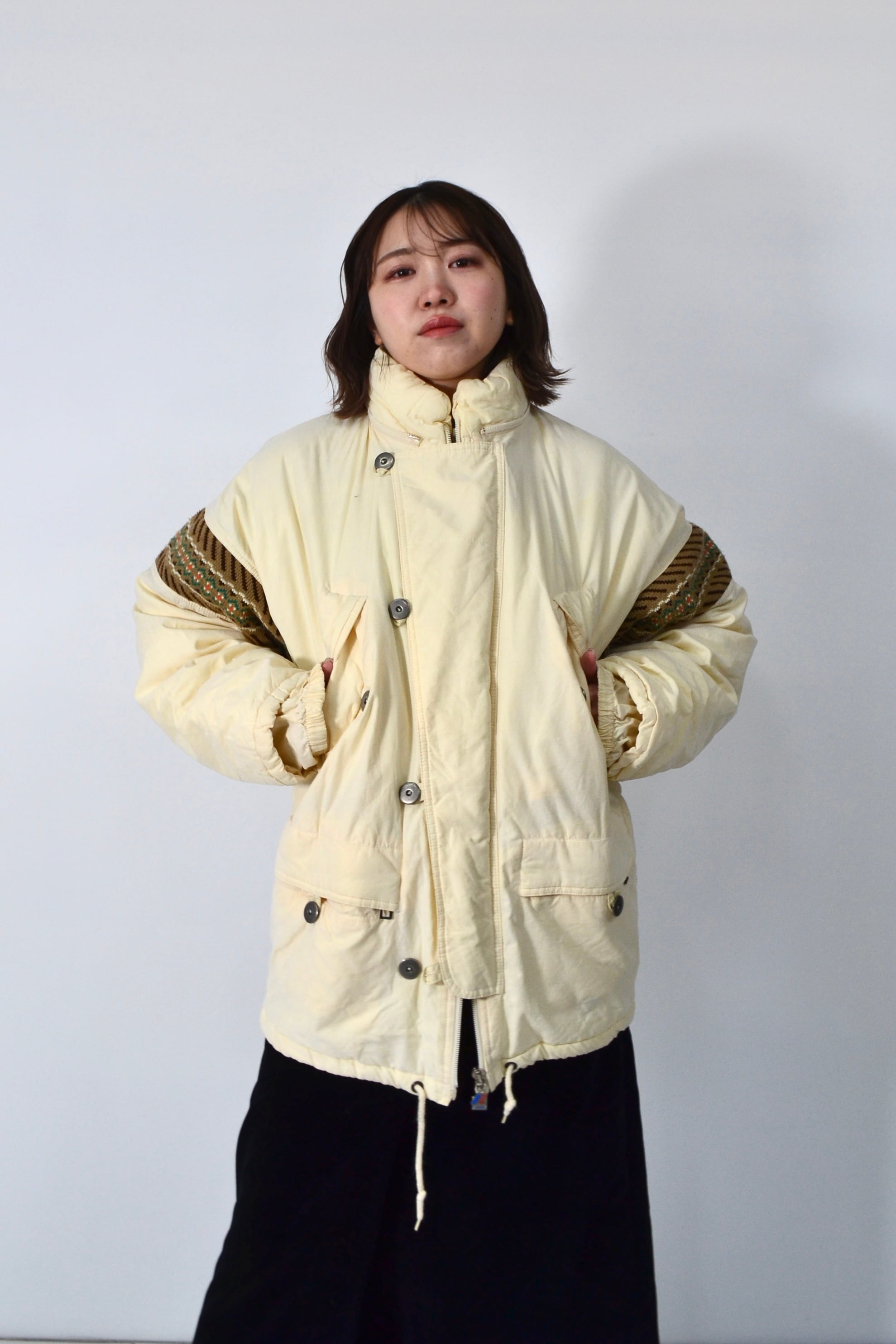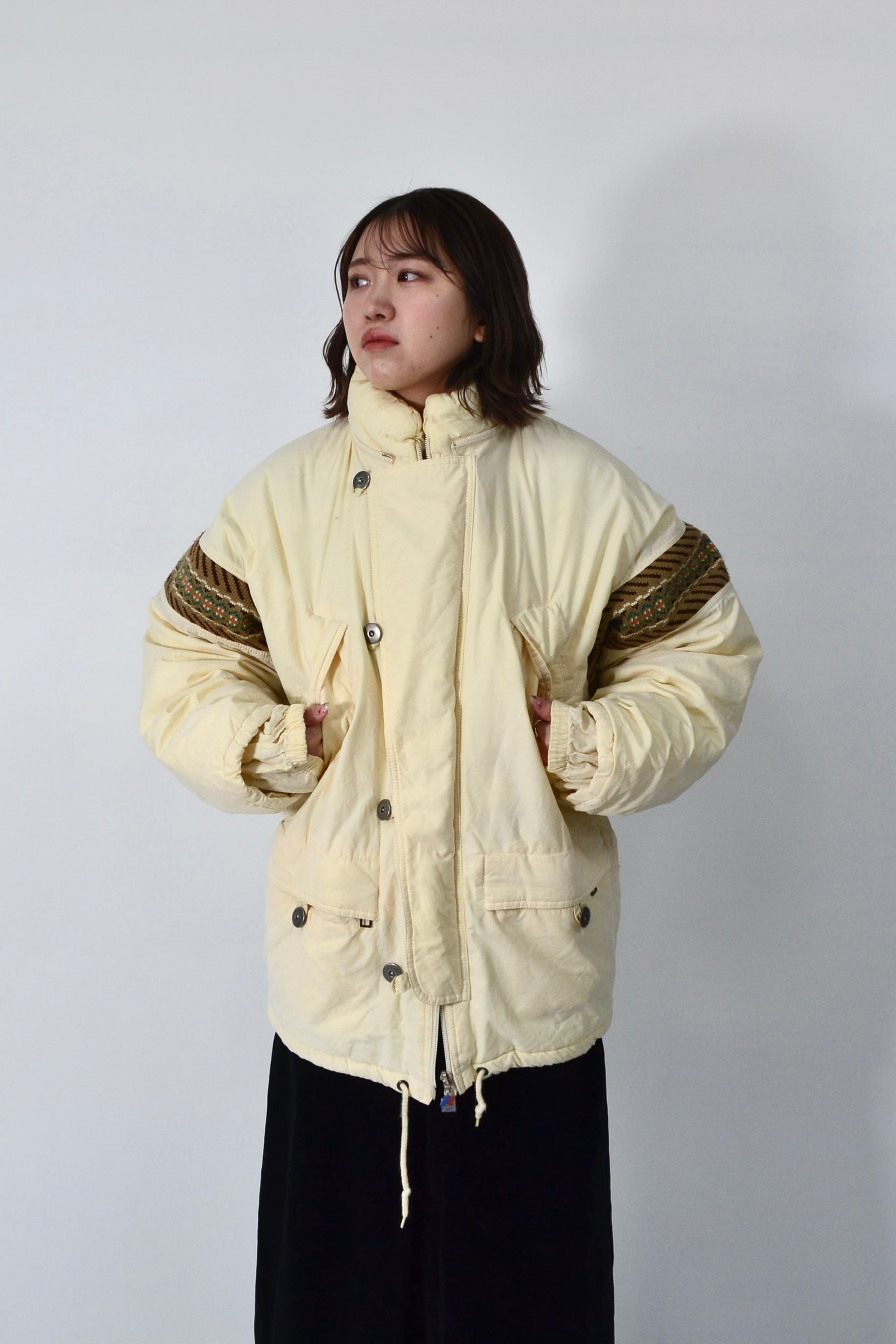 スポーティな中綿ジャケットに、どこか民族感のあるムードが重なってます。