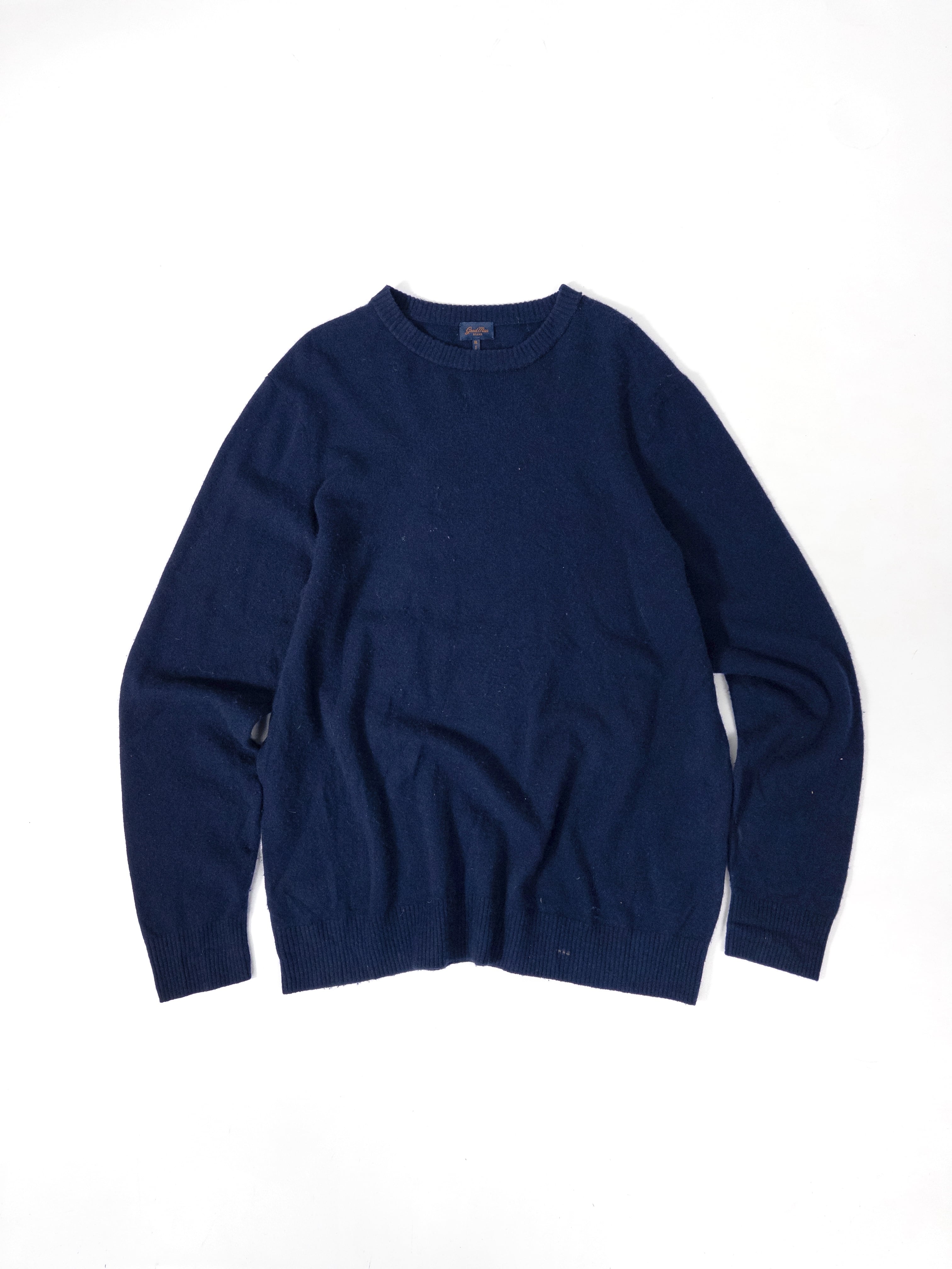 Good Manのクルーネックカシミヤ。タグからも分かる通りリサイクルカシミヤ100%で、いわゆる軽いハイゲージとは違って、ちゃんと厚みがあってふわっと空気を含むタイプ。触るとすぐ分かるやつです。