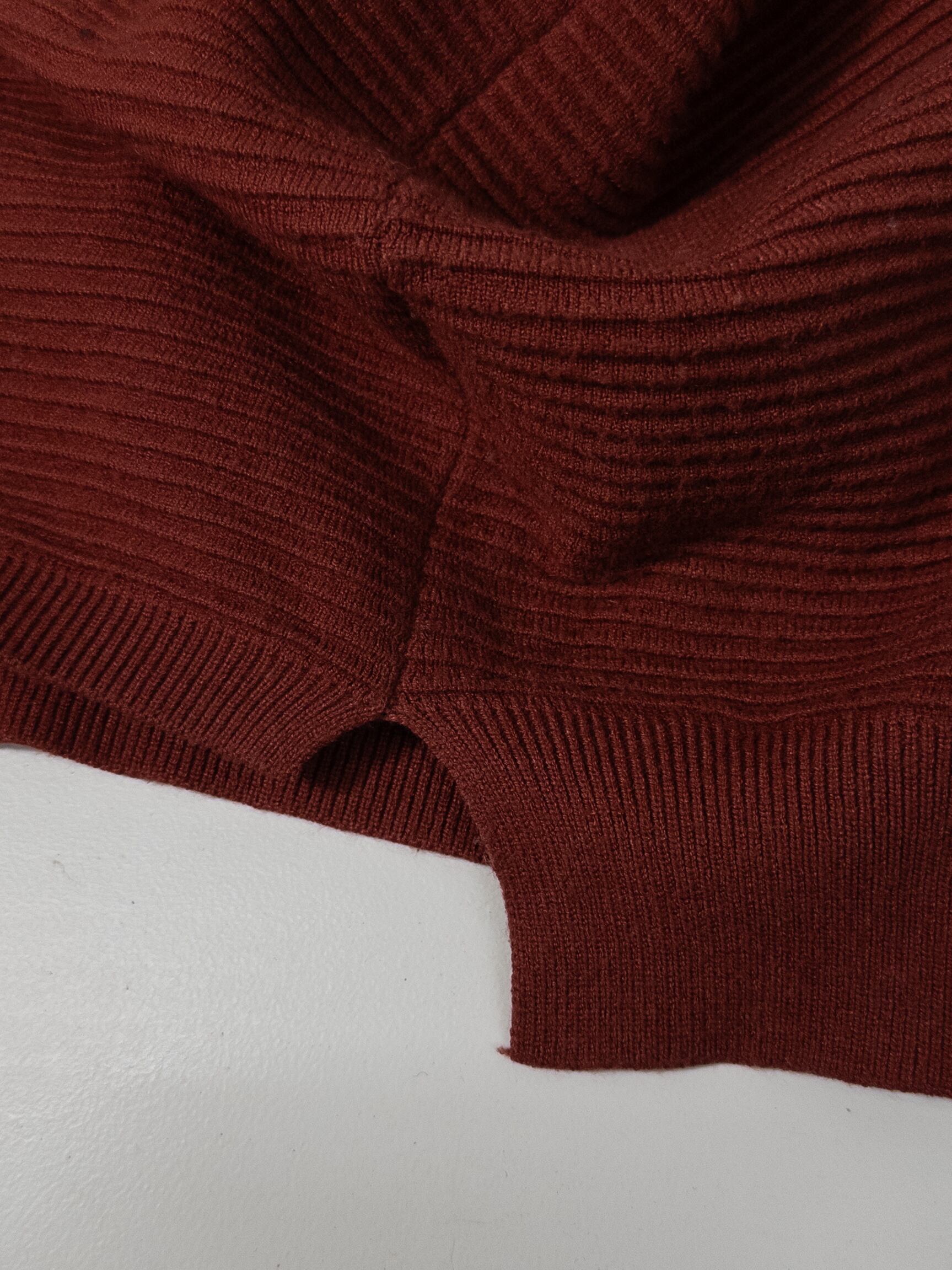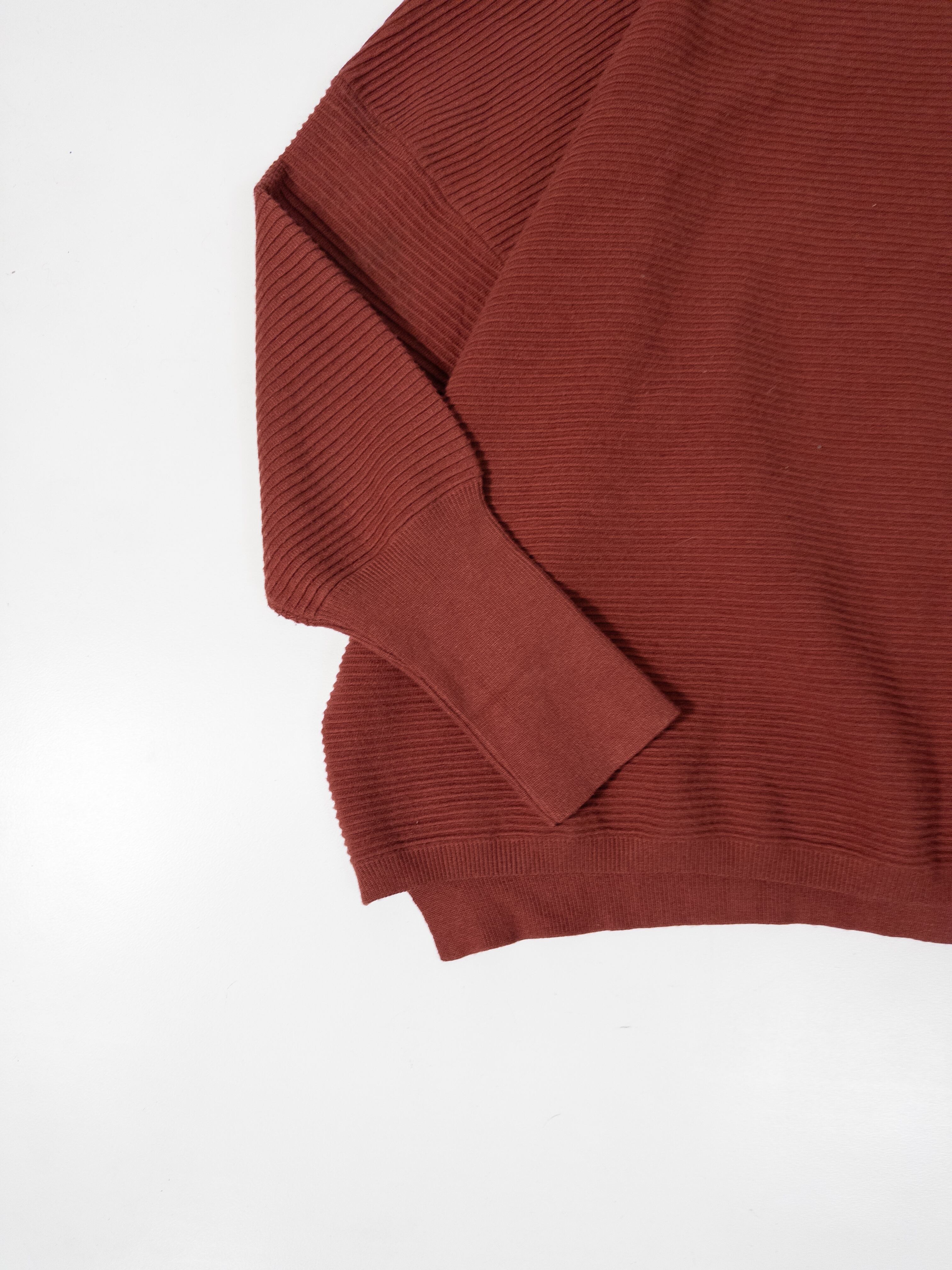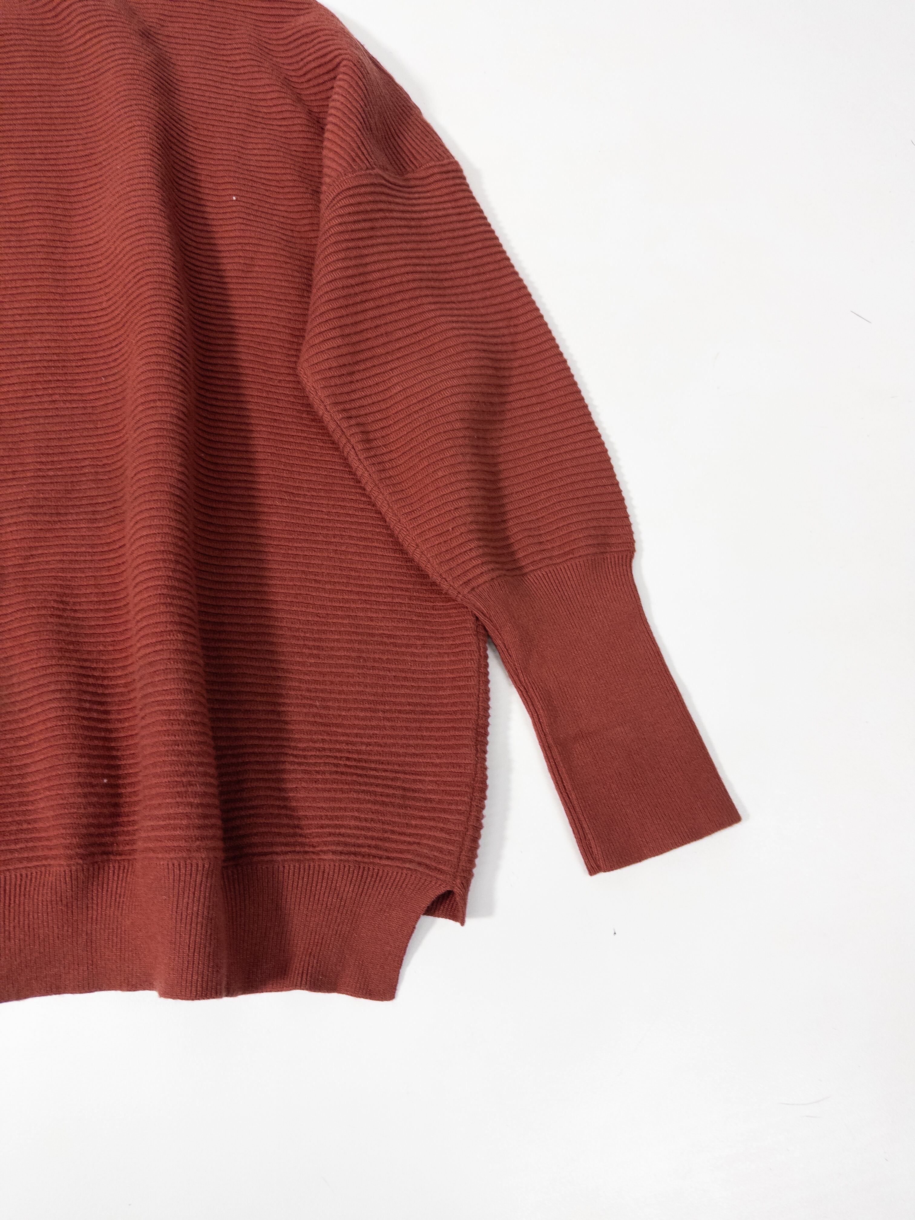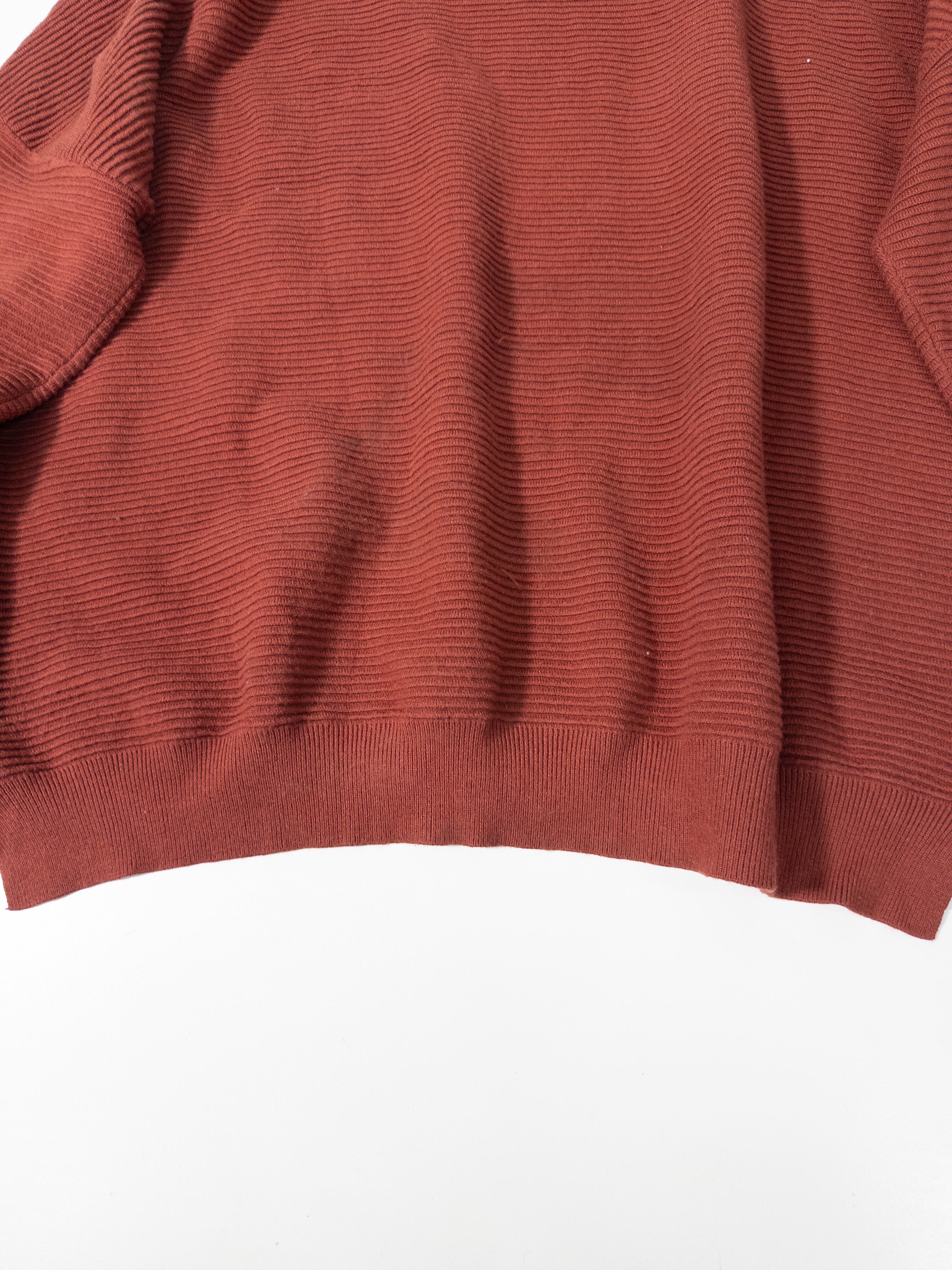 くすみオレンジのリブニットプルオーバー。