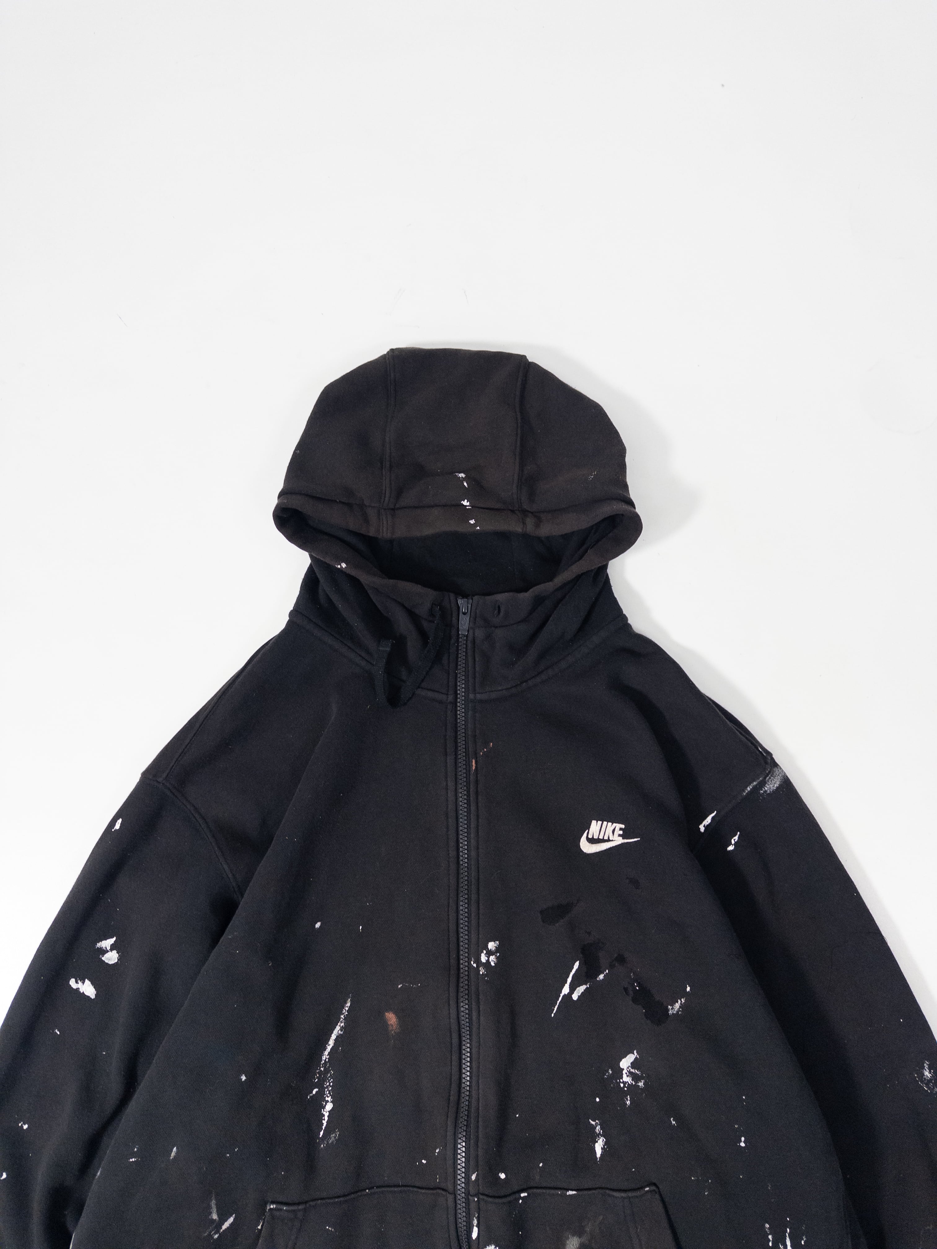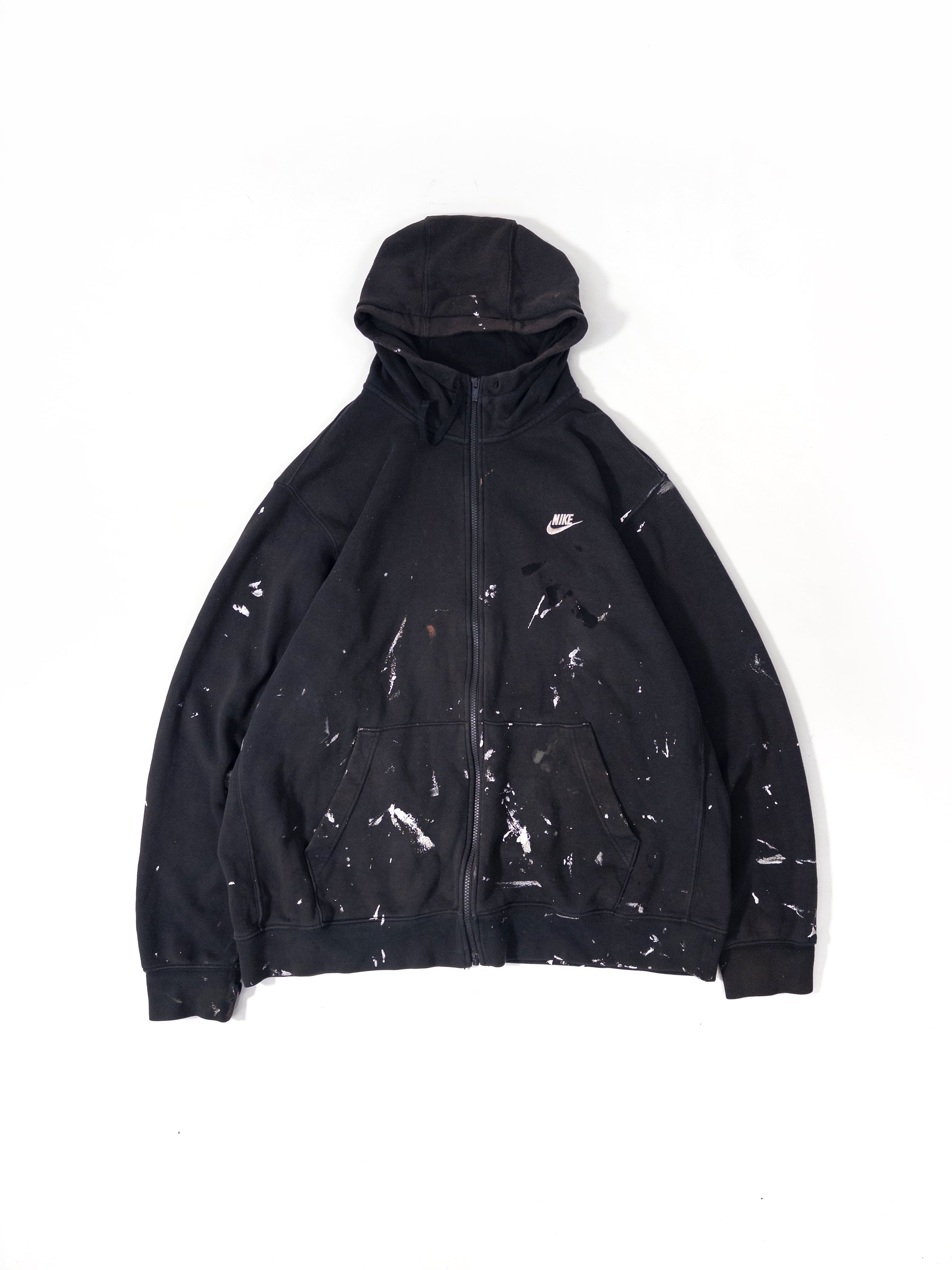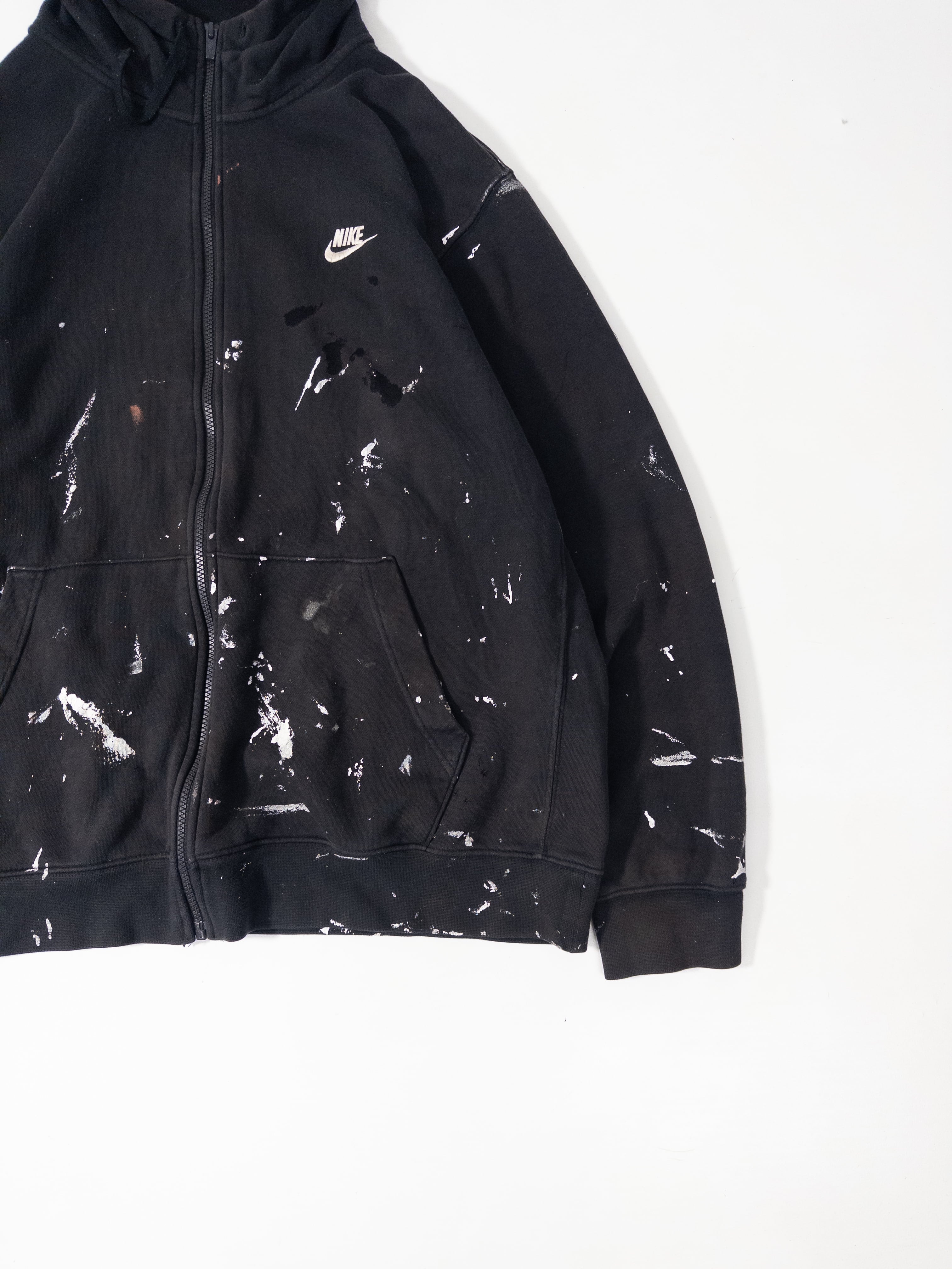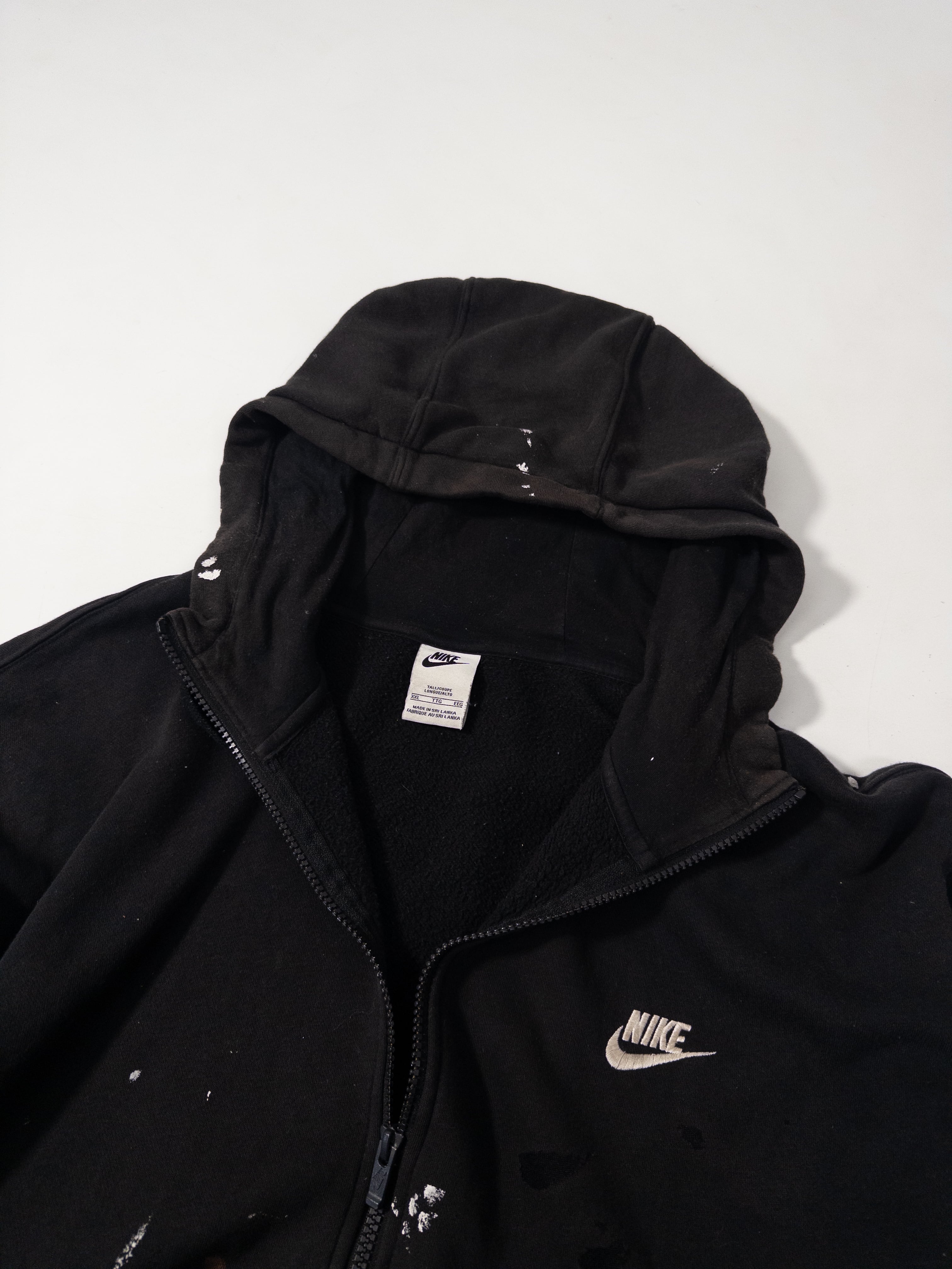 胸のワンポイントスウッシュだけのミニマルなベースに、作業痕のような白ペイントと、袖にうっすら残るブラウン系の色移り。
