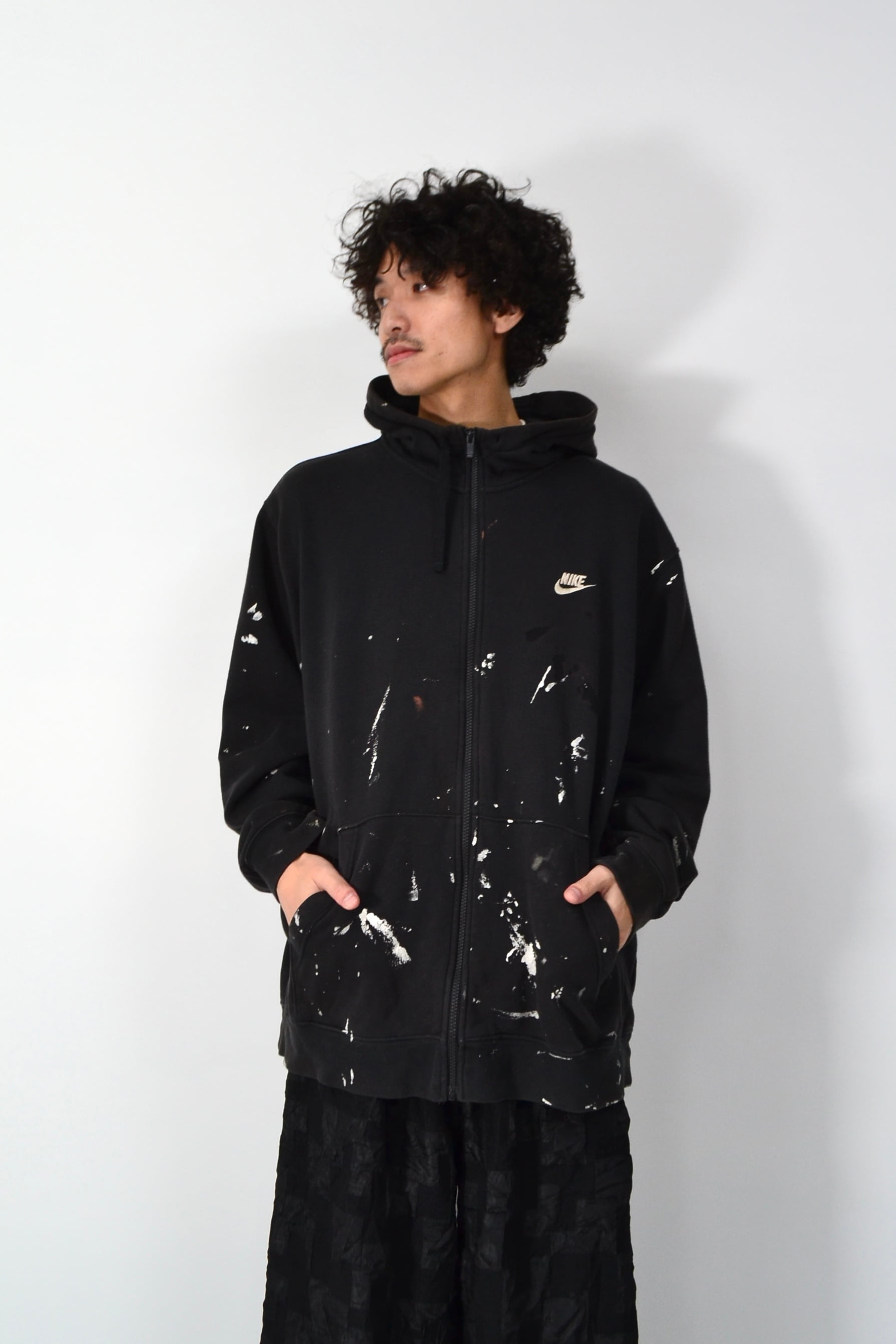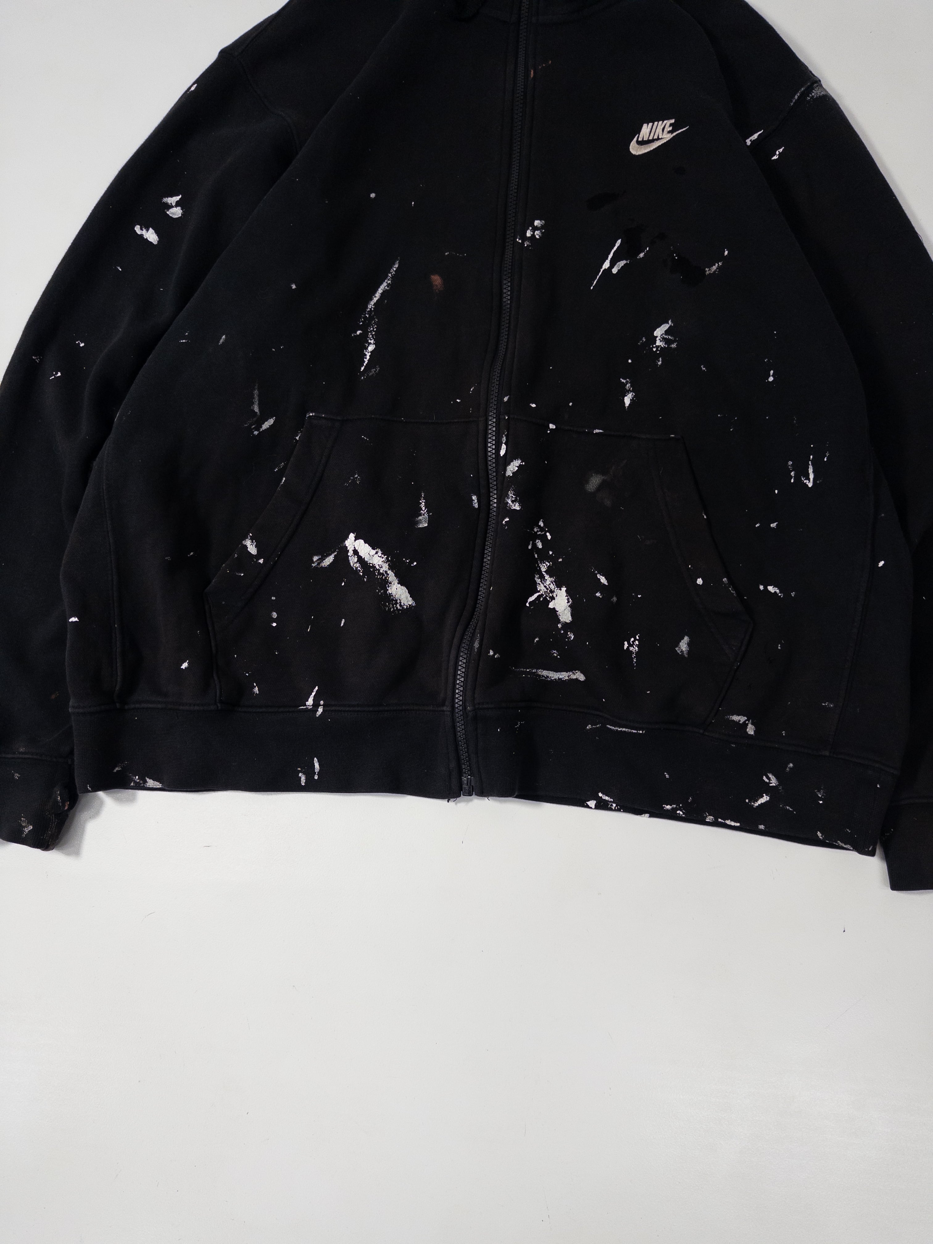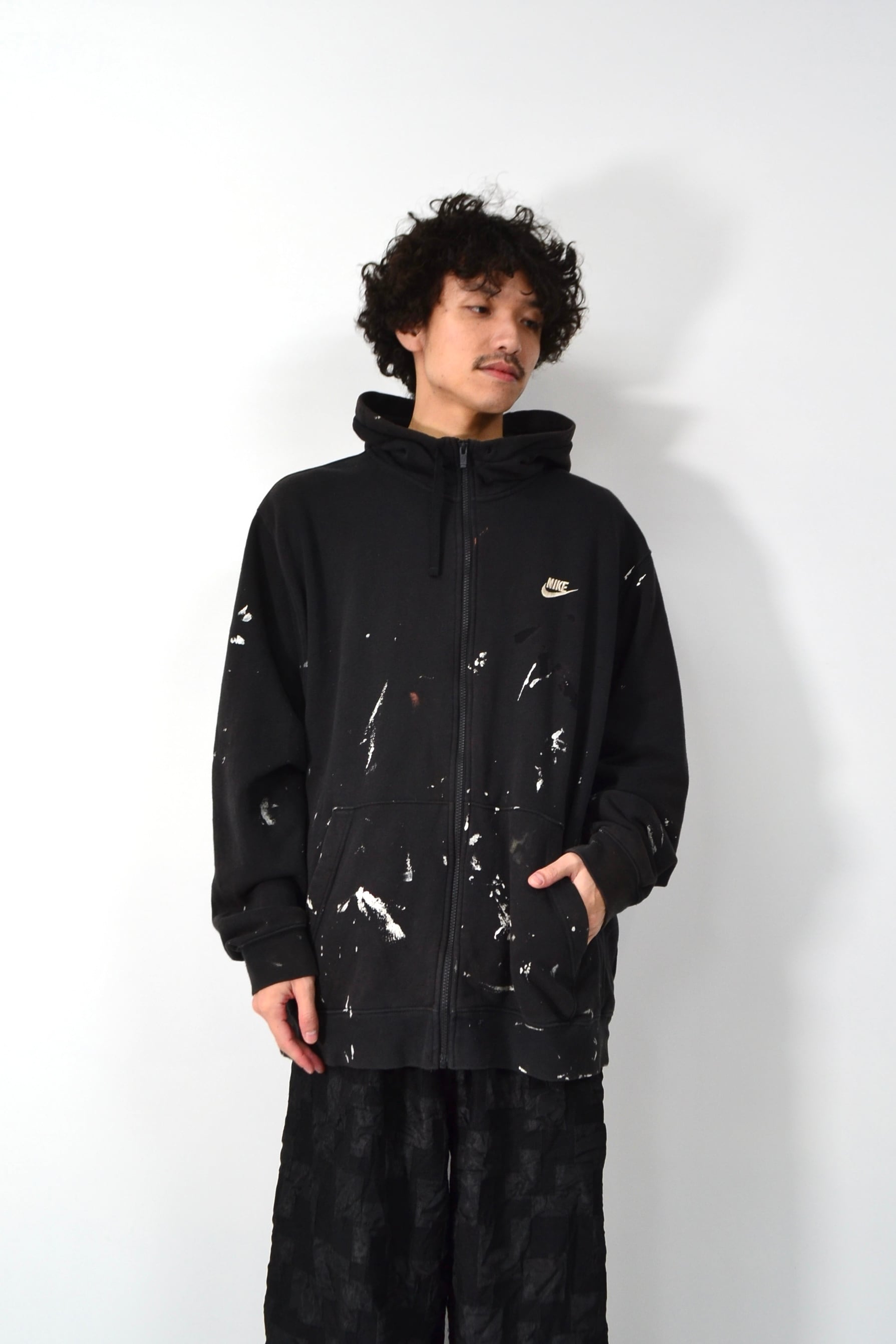 胸のワンポイントスウッシュだけのミニマルなベースに、作業痕のような白ペイントと、袖にうっすら残るブラウン系の色移り。