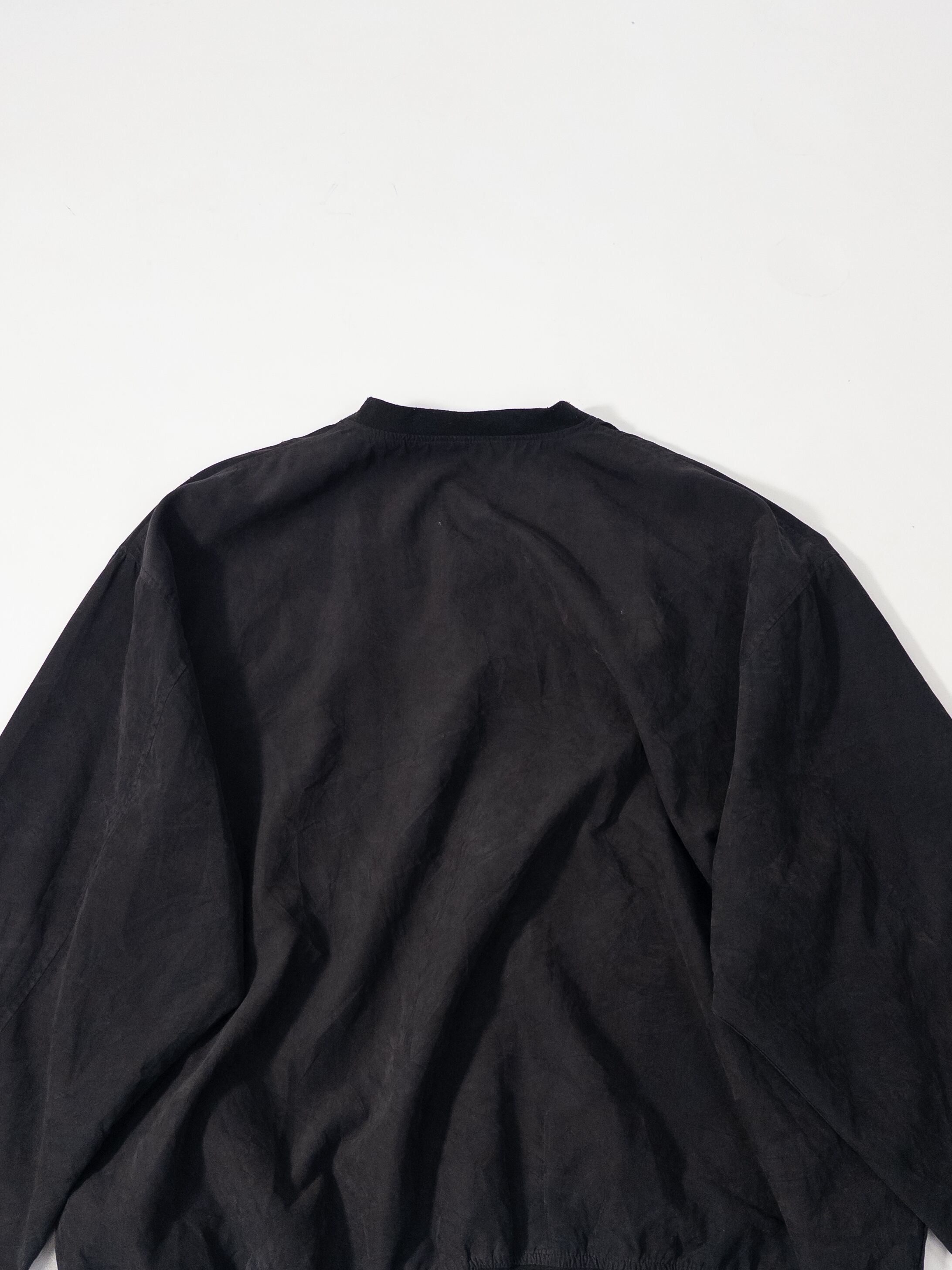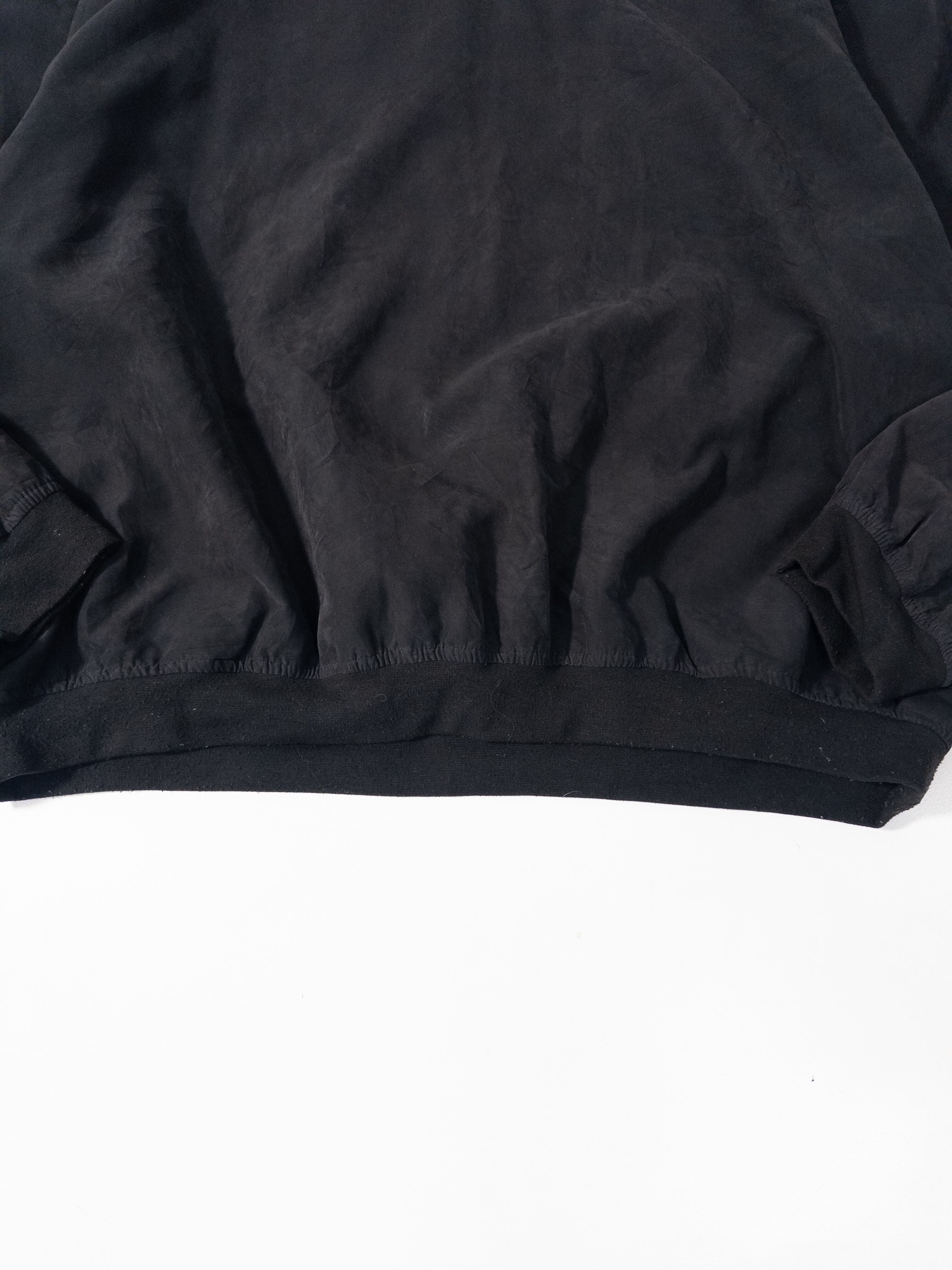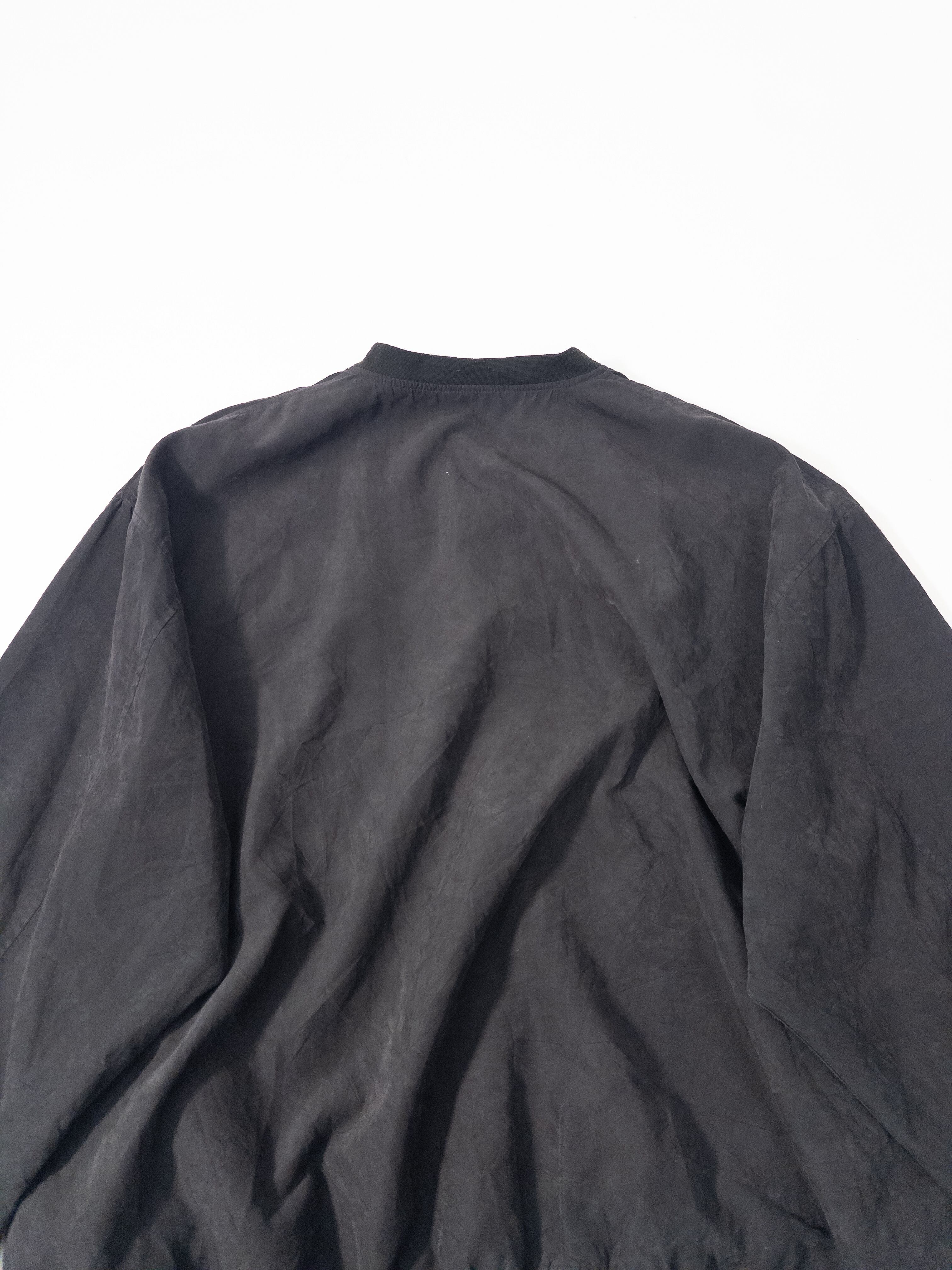 シェルはポリエステル×ナイロン(85/15)の軽くて滑りのいい素材感で、スウェットほどカジュアルじゃなく、ナイロンプルオーバーほどスポーティでもない、その中間。いわゆる“風を含む系”の生地で、ドレープも出るし、着た時の落ち感がすごくきれい。