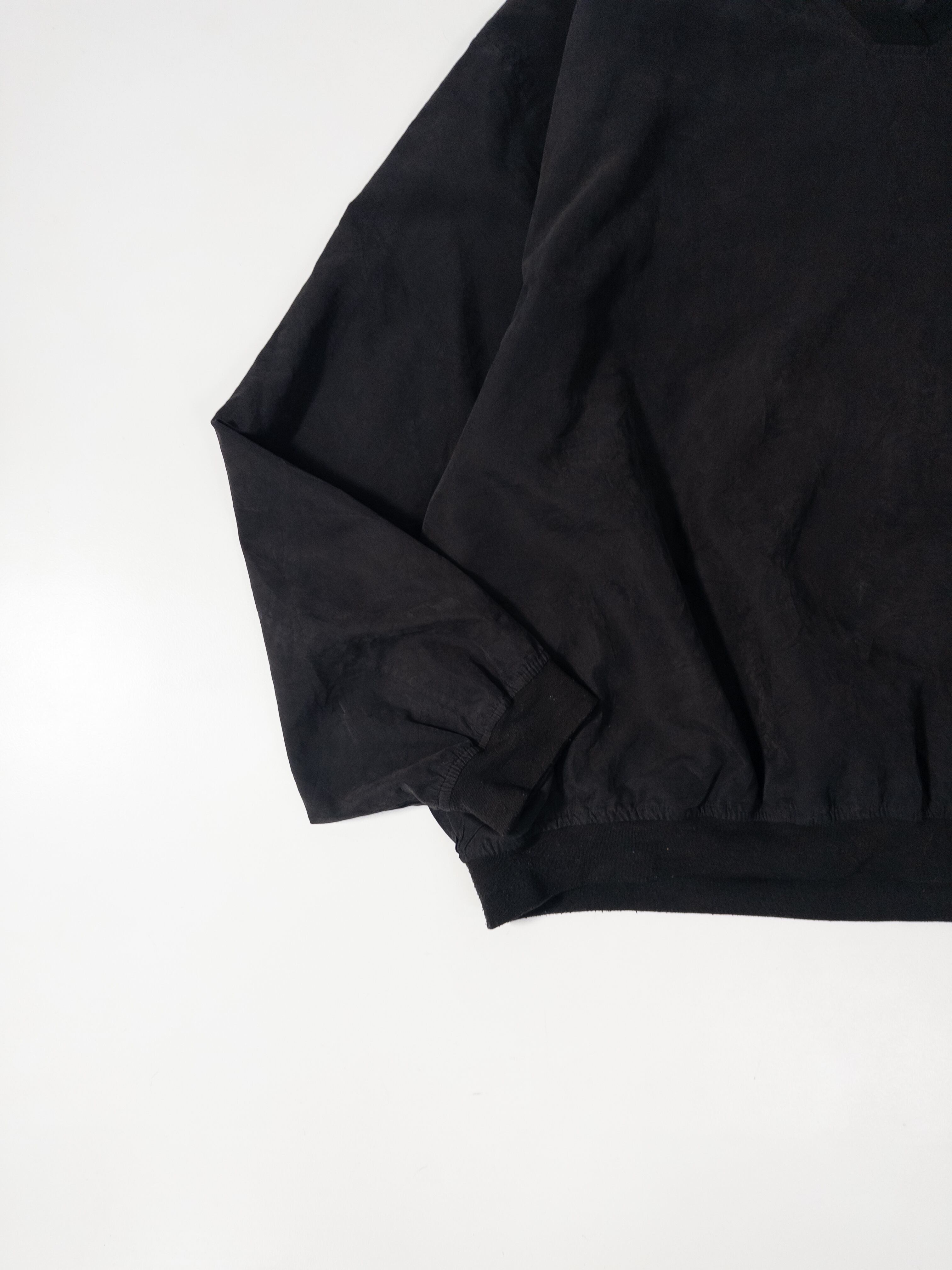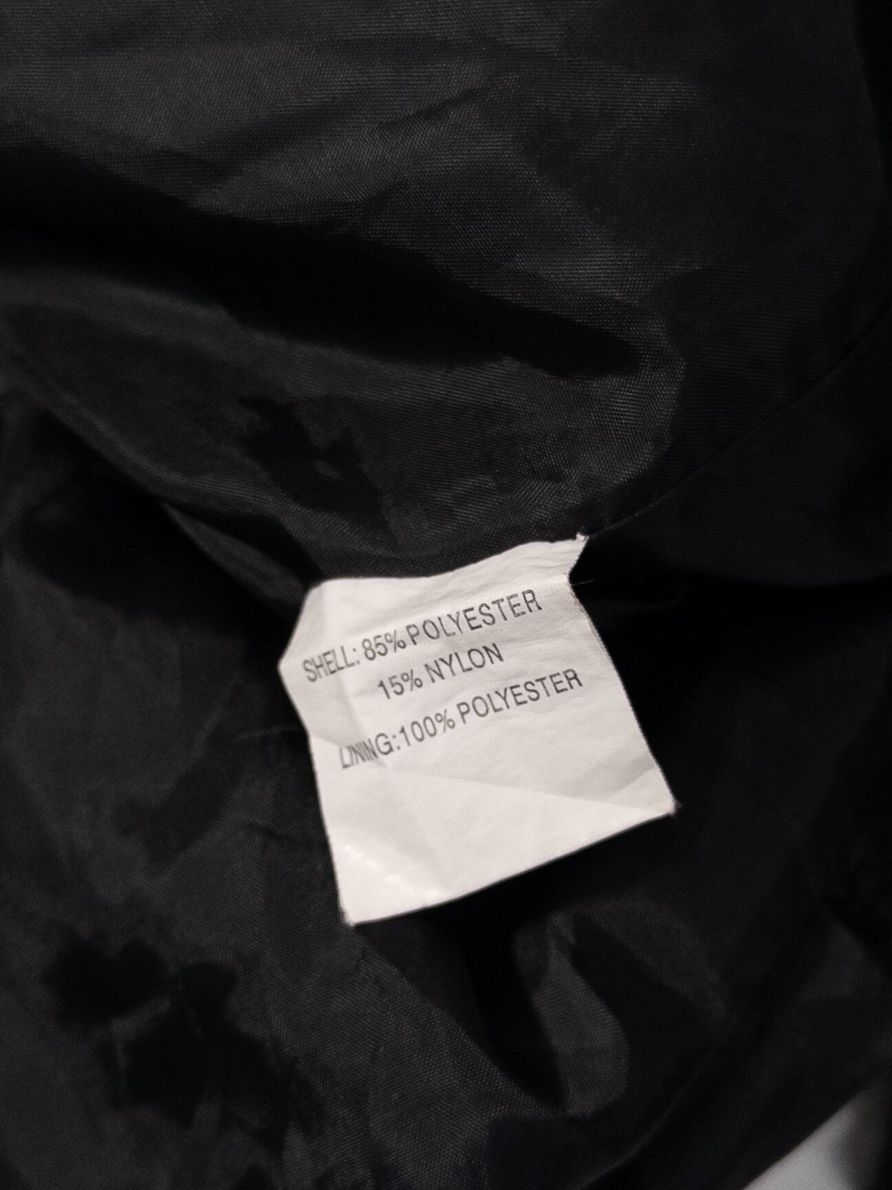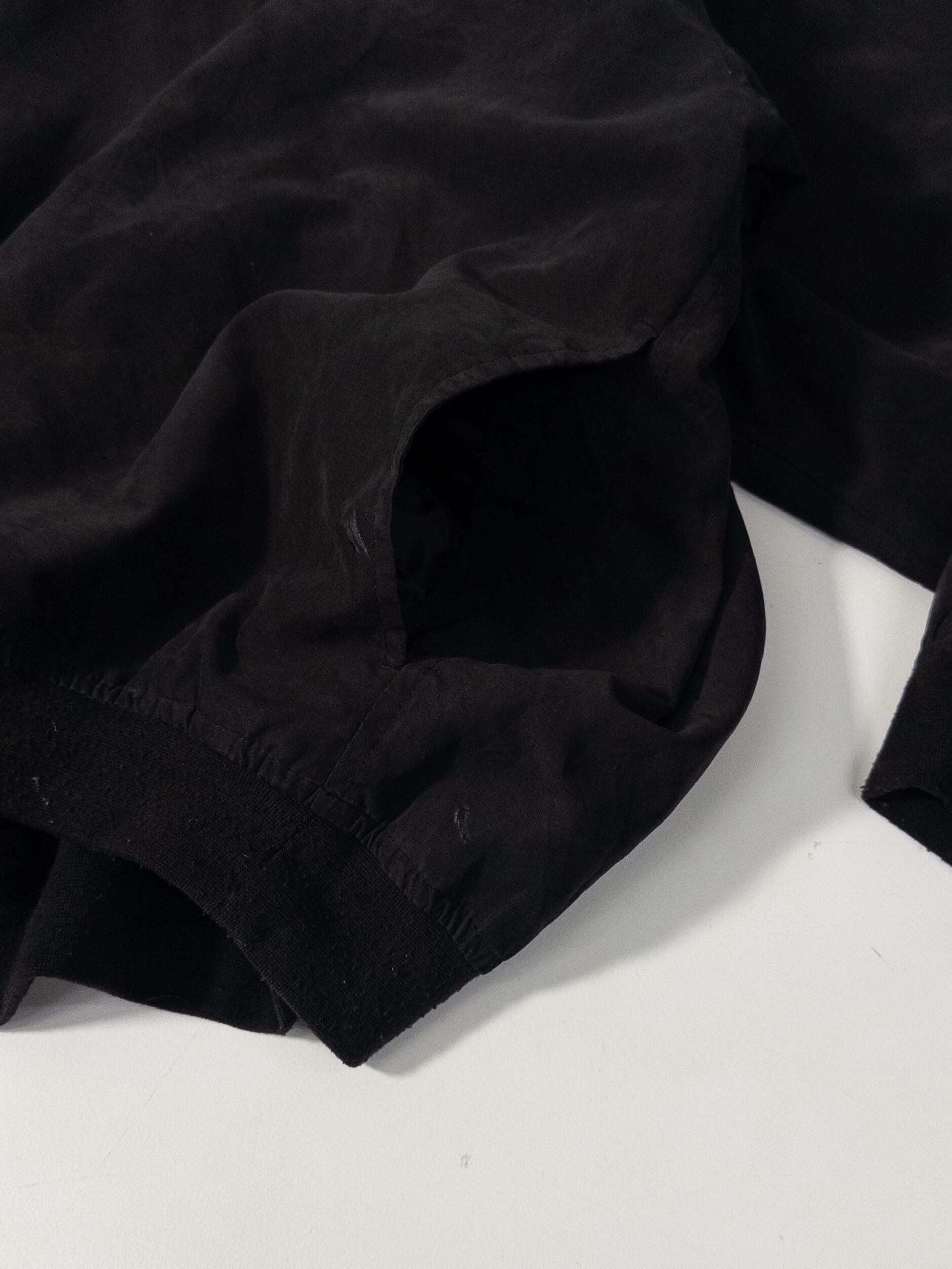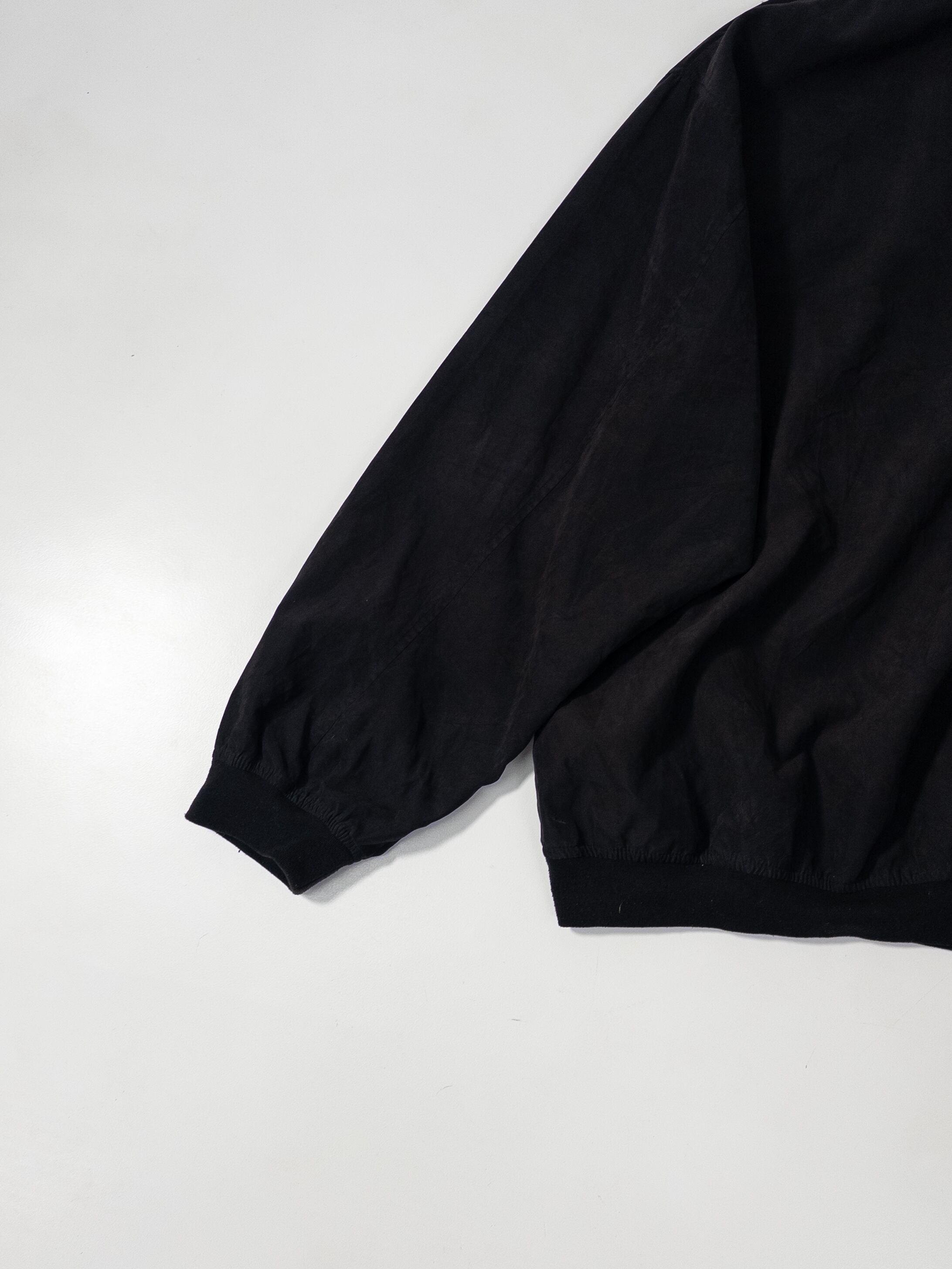 シェルはポリエステル×ナイロン(85/15)の軽くて滑りのいい素材感で、スウェットほどカジュアルじゃなく、ナイロンプルオーバーほどスポーティでもない、その中間。いわゆる“風を含む系”の生地で、ドレープも出るし、着た時の落ち感がすごくきれい。