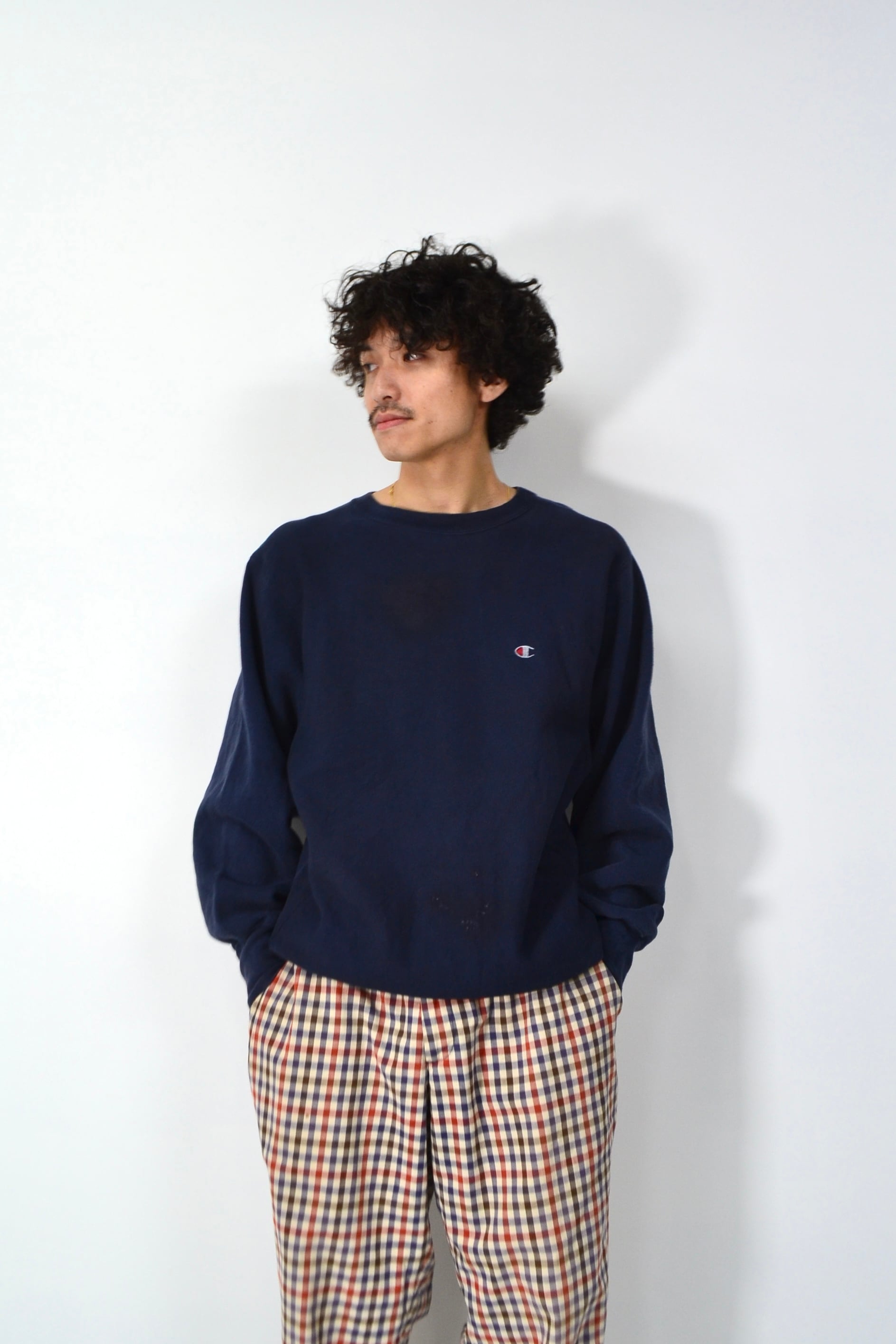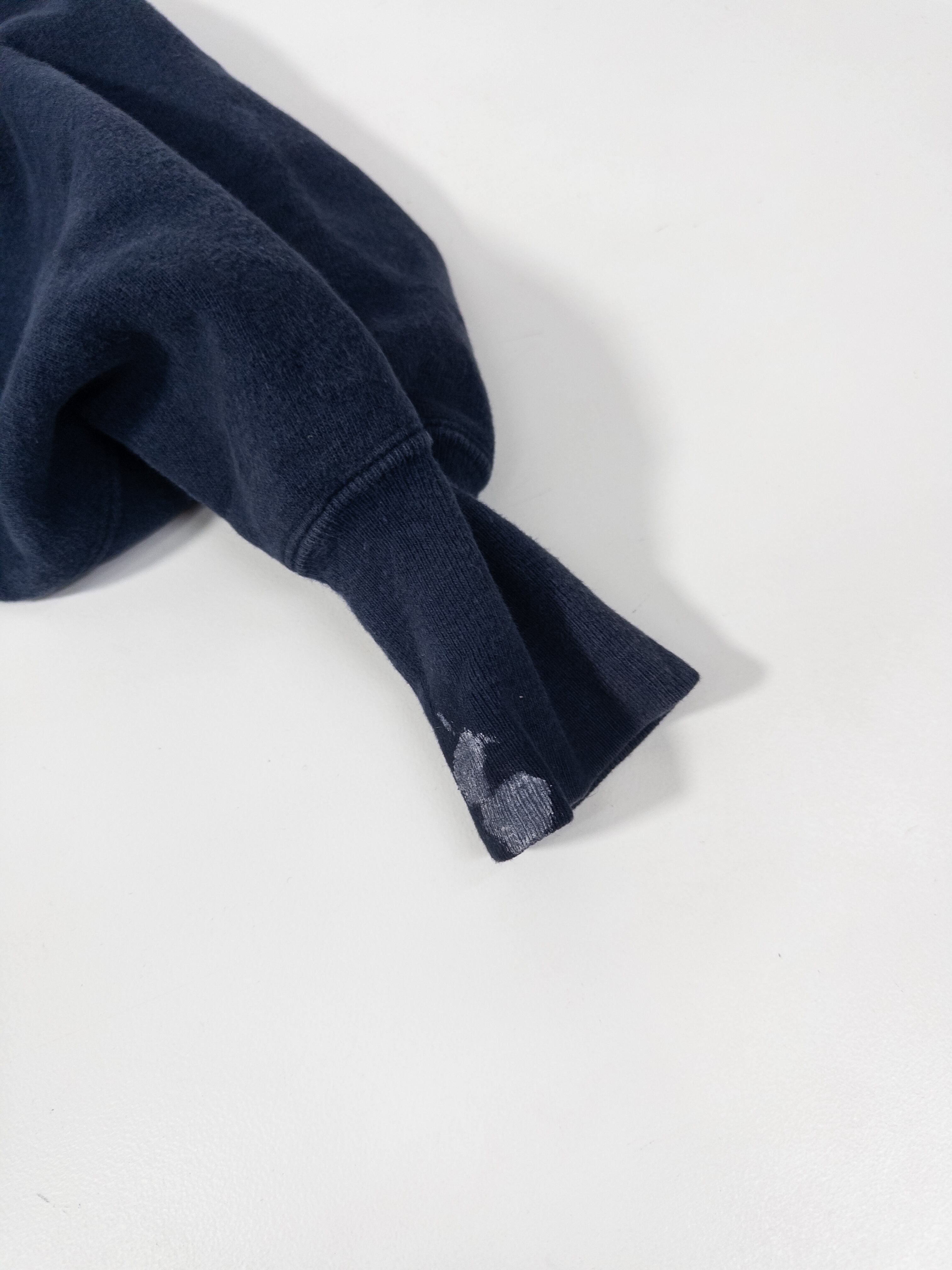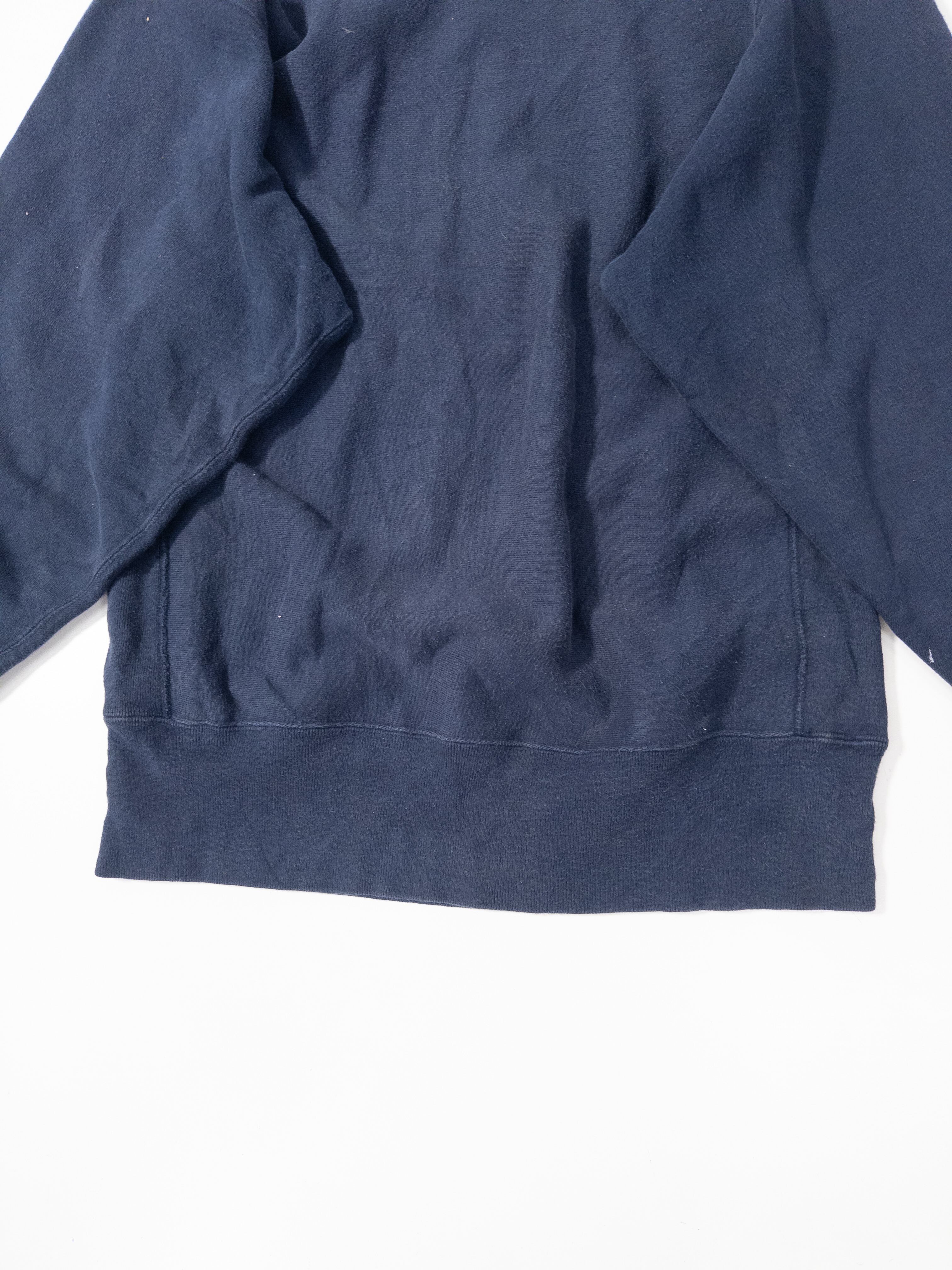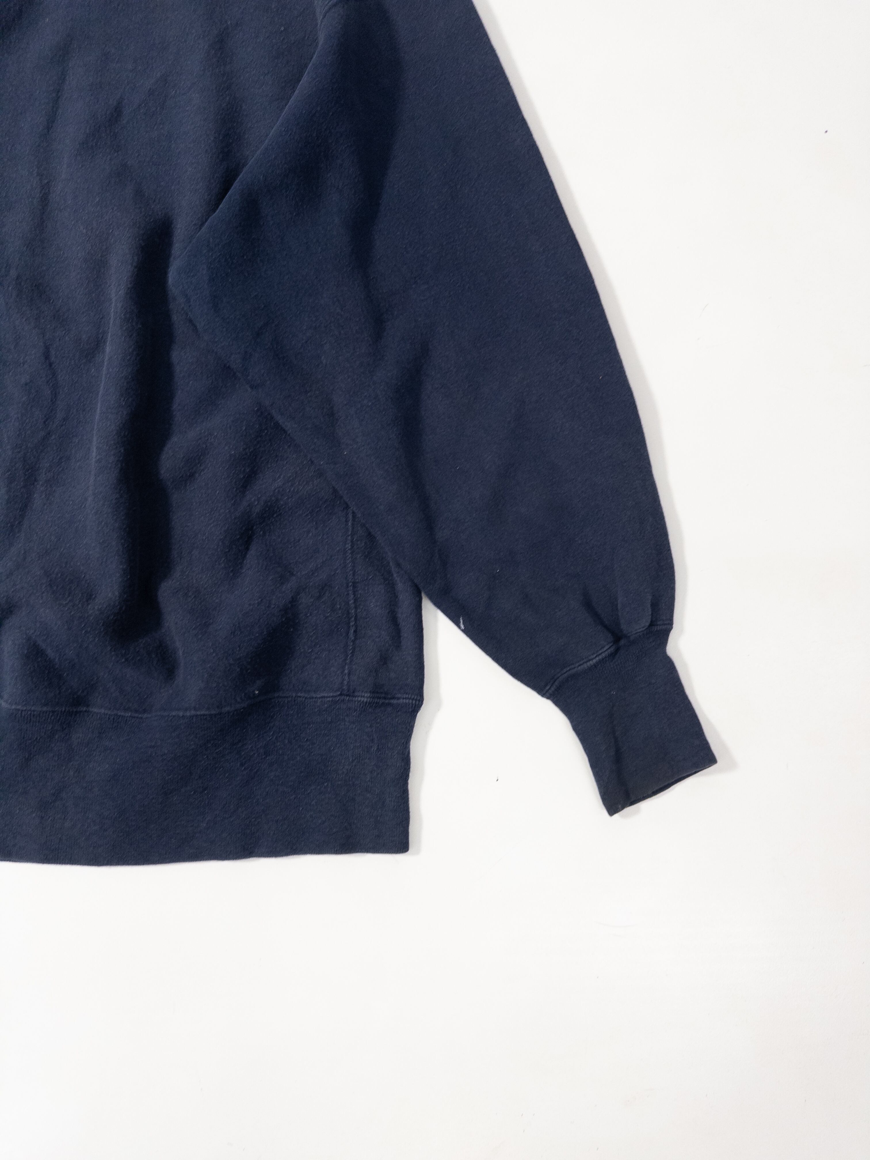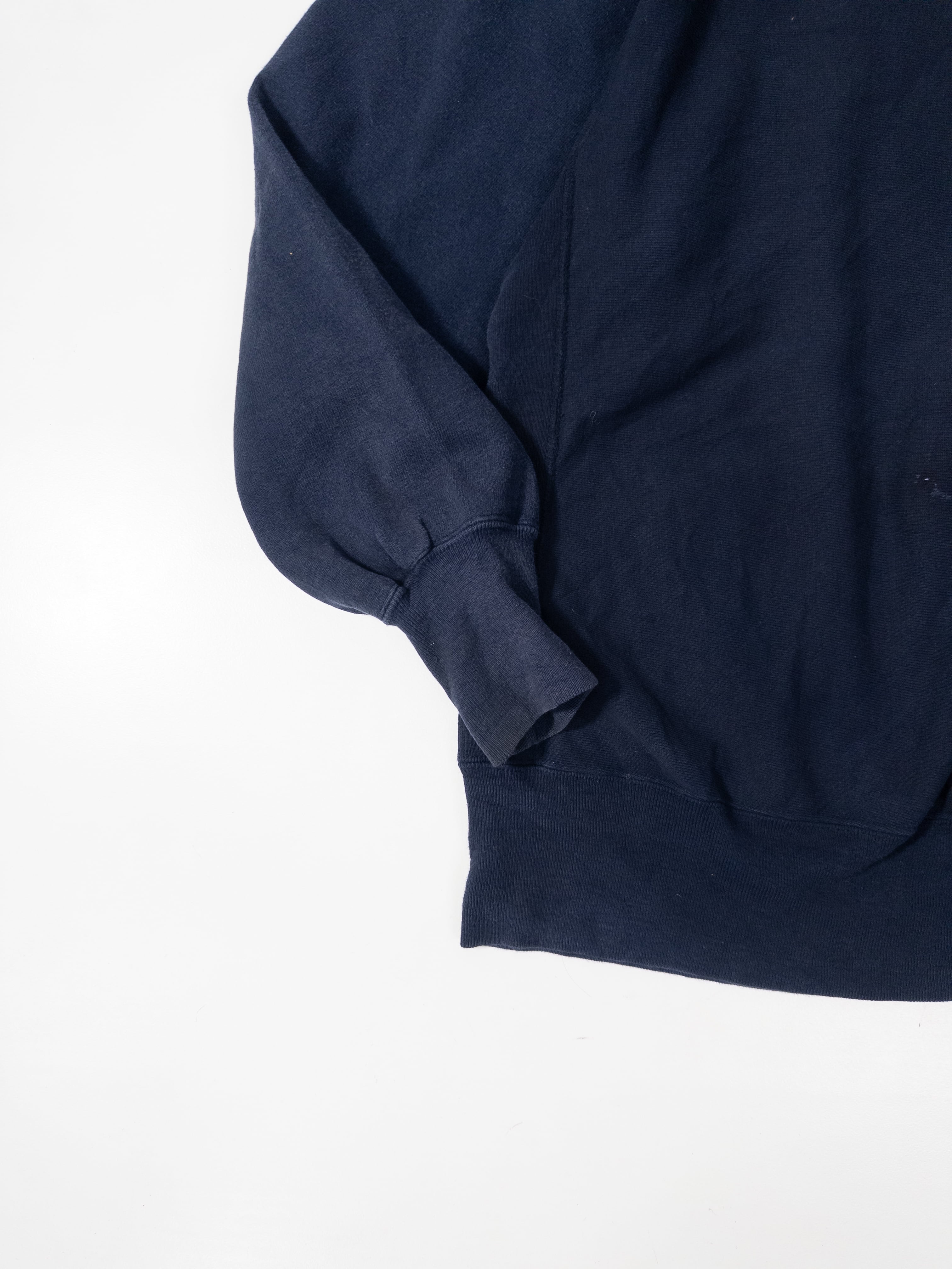 90%コットン×10%ポリのUSメイド表記、しっかり目の詰まったリバースウィーブらしい肉感で、着るとストンと落ちるあの独特のシルエット。ネイビーのフェードも程よく入ってて、新品には出せない奥行きがあります。