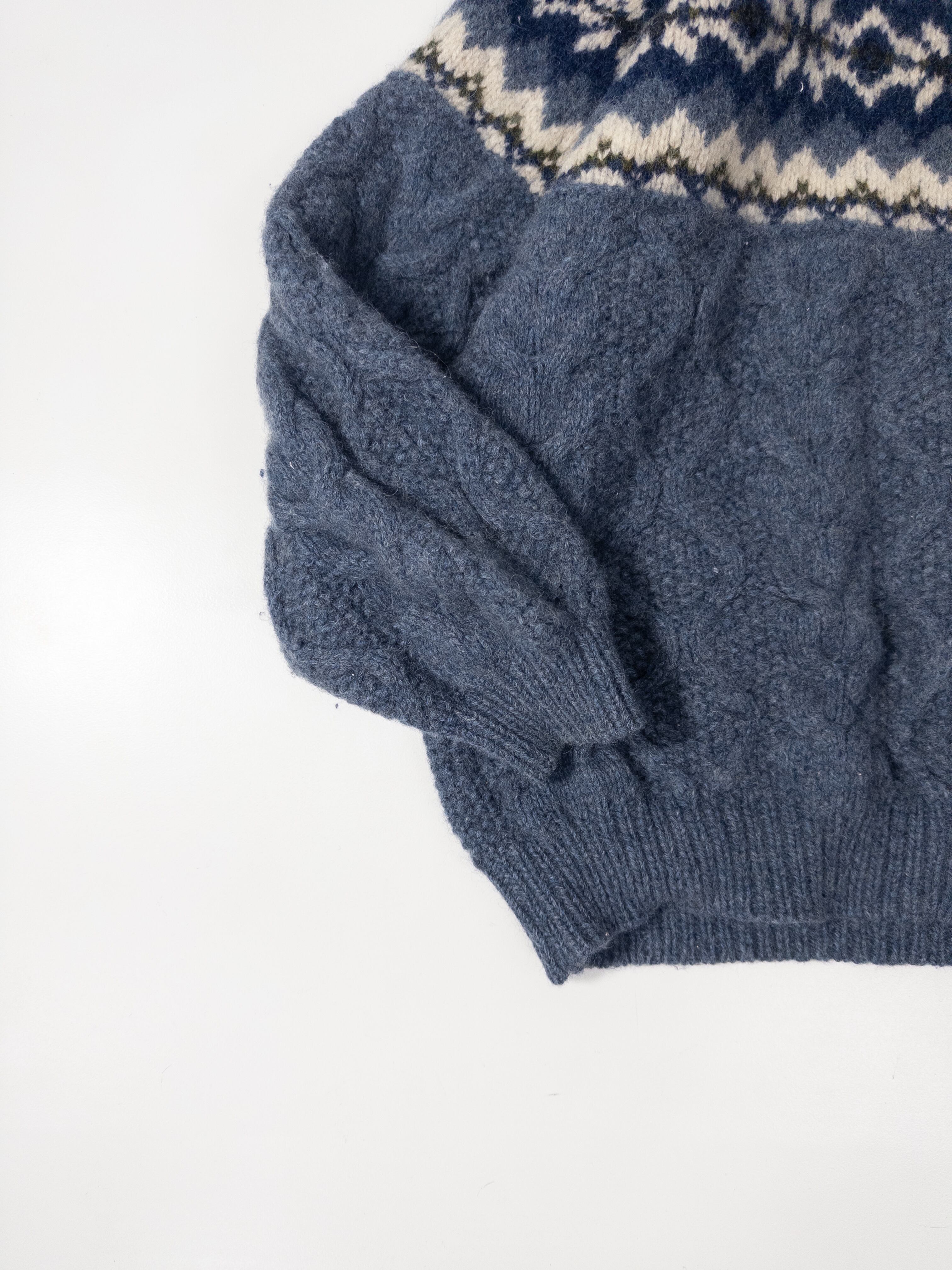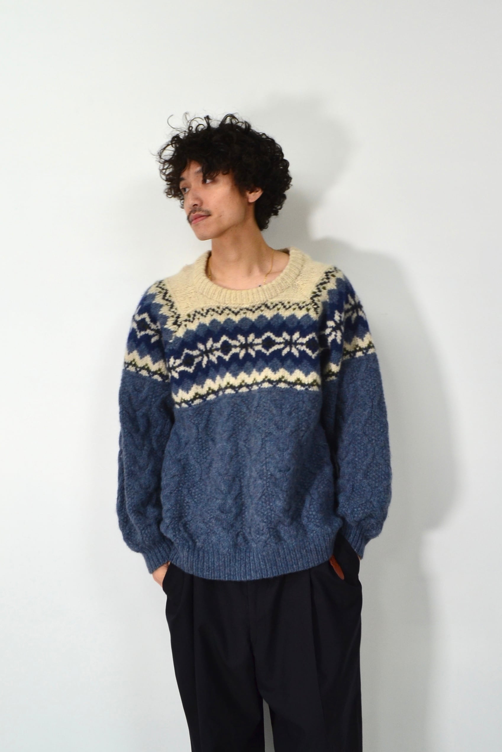 上はアイボリー×ネイビーの伝統的な配色、下はスモーキーなブルーグレーのケーブル編みで切り替えられていて、柄ニットなのにどこか落ち着いた空気感があります。