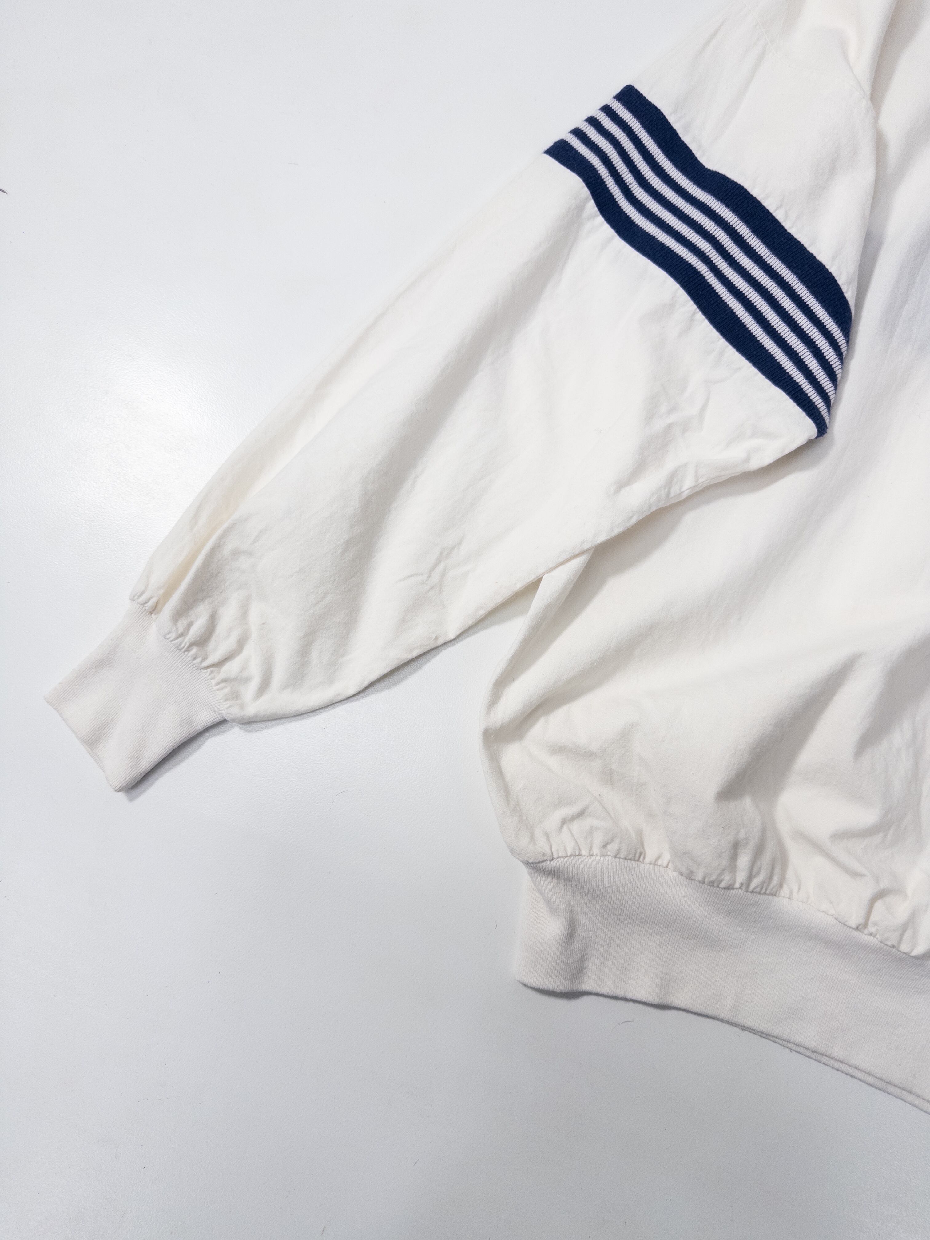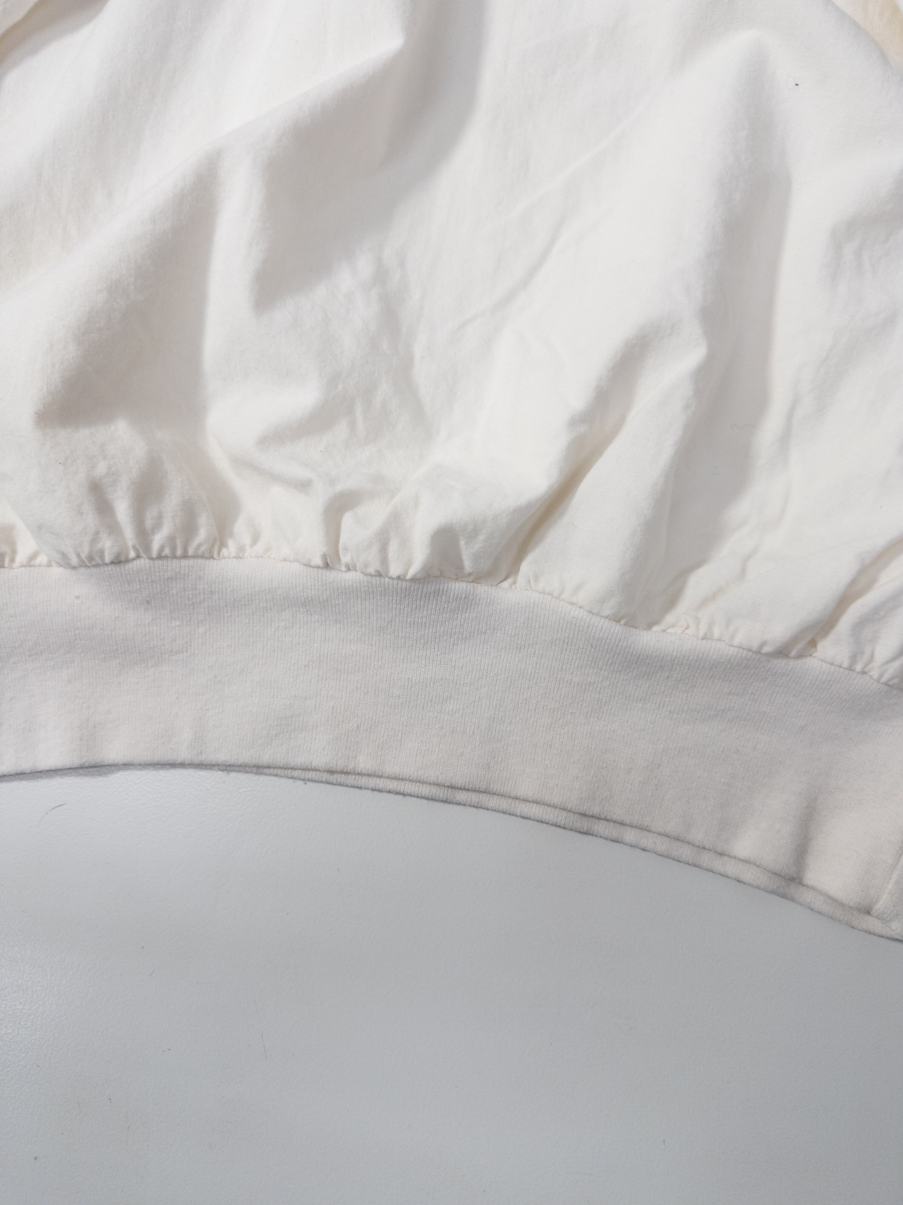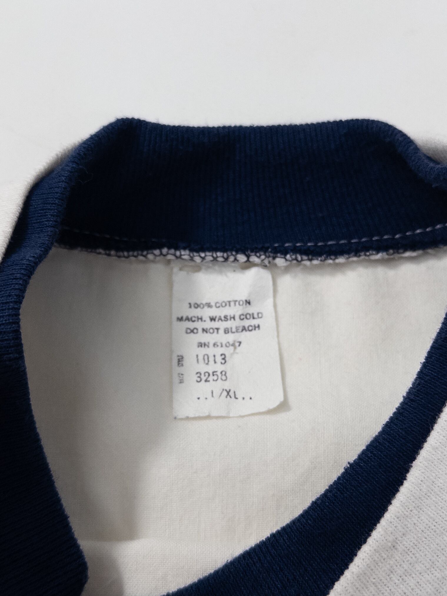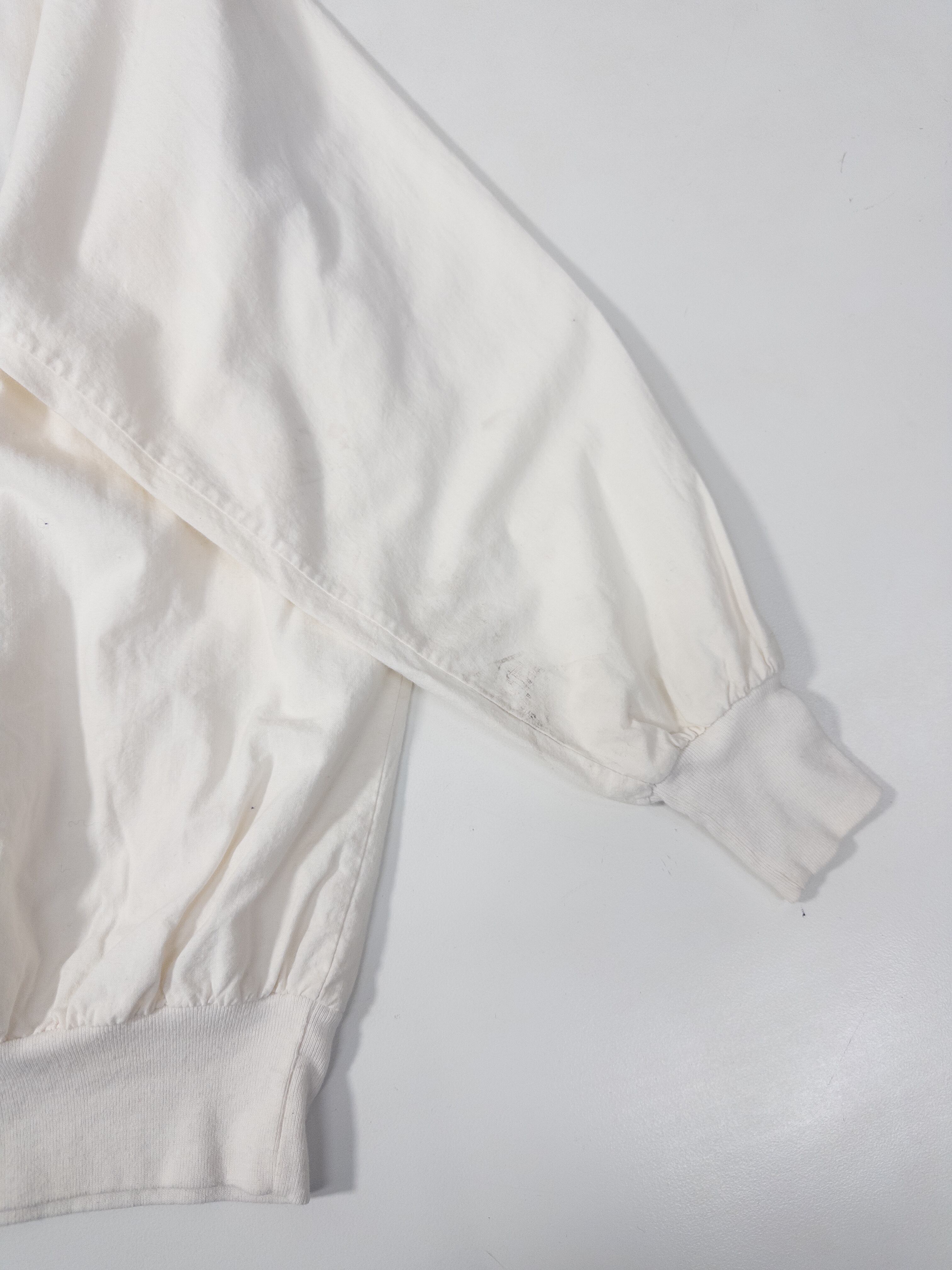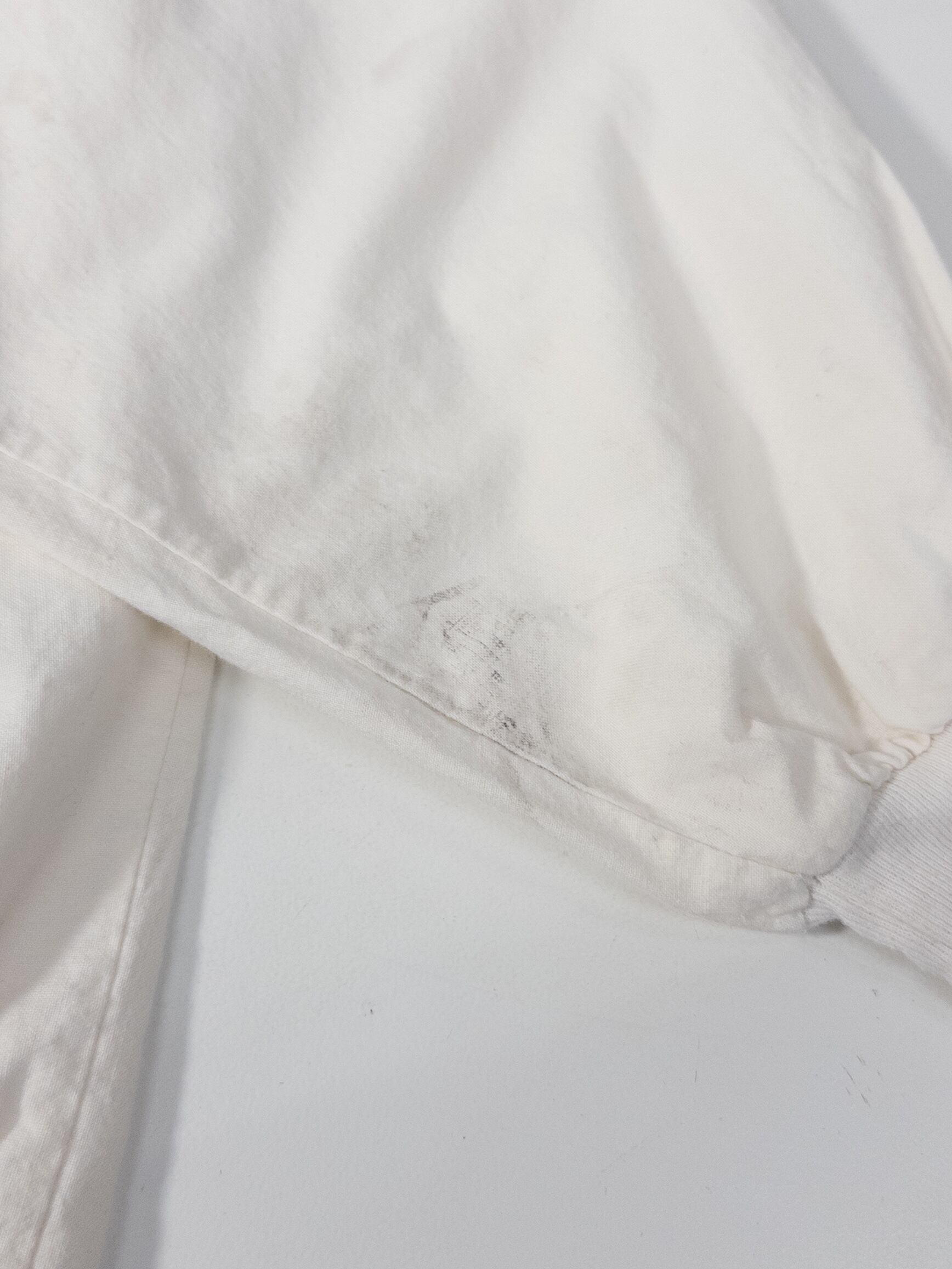薄手じゃなく、ちゃんと肉感あるスウェット生地で、着ると自然に丸みの出るシルエット。リブもまだしっかりしてて、古着にありがちなヨレ感は少なめ。首元のネイビートリムも効いてて、白スウェット特有の“間の抜け感”が出ないのも地味にポイント高いです。