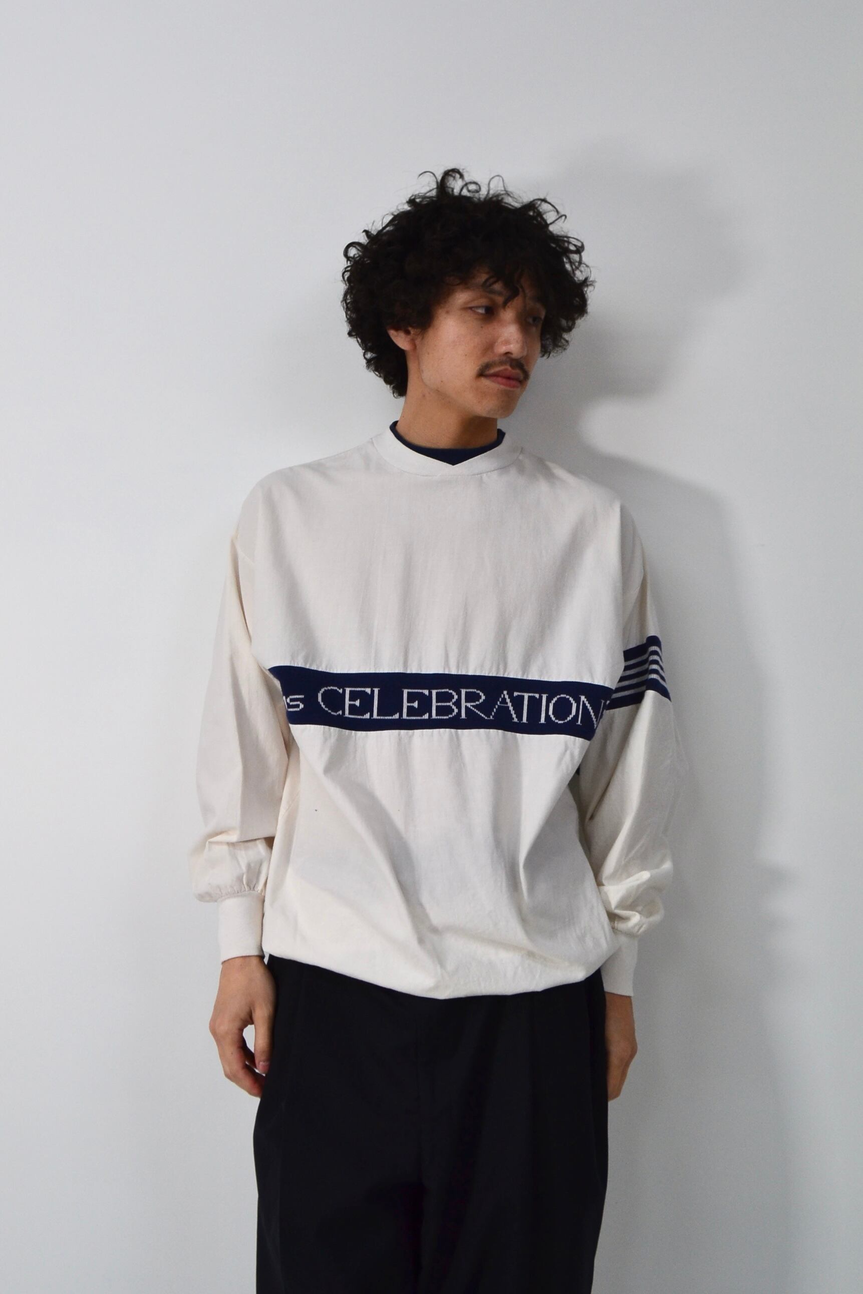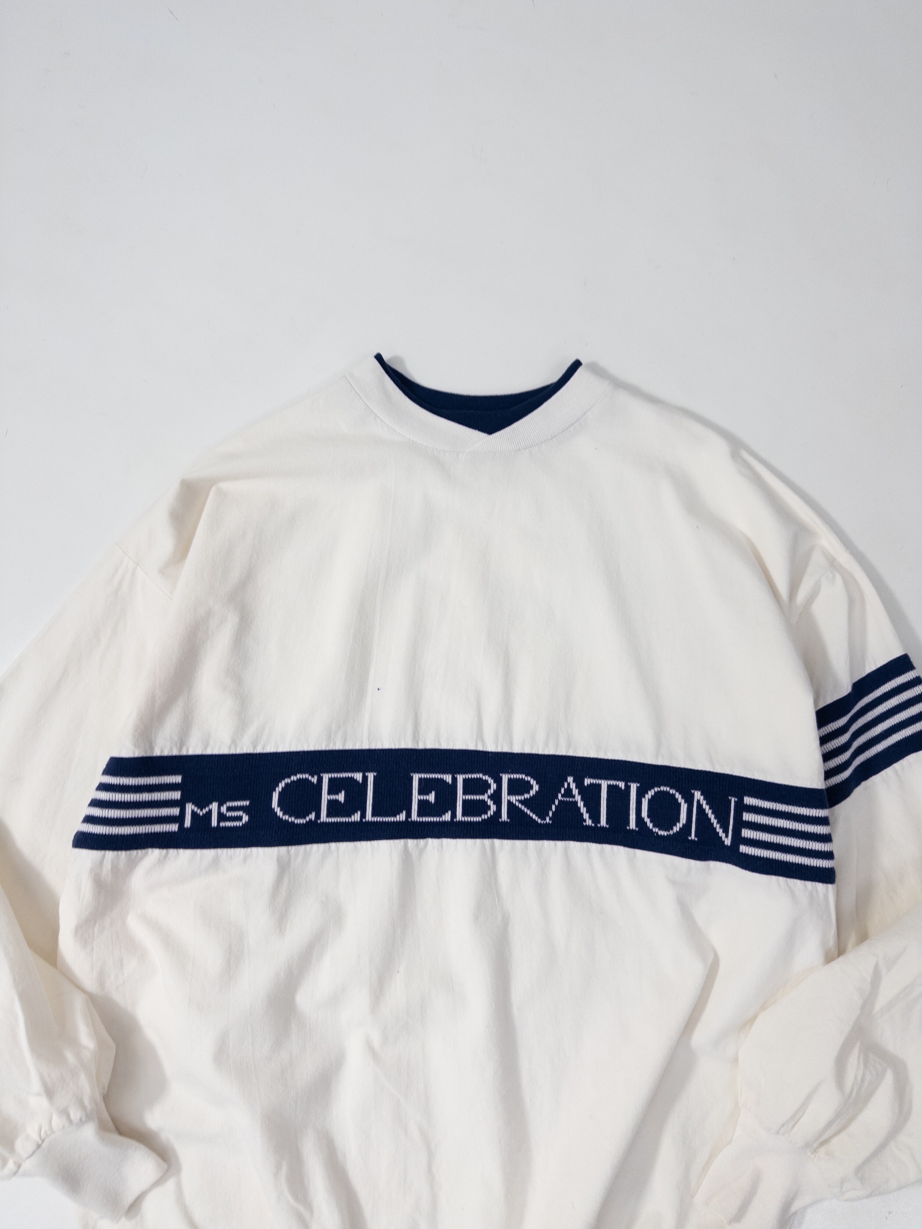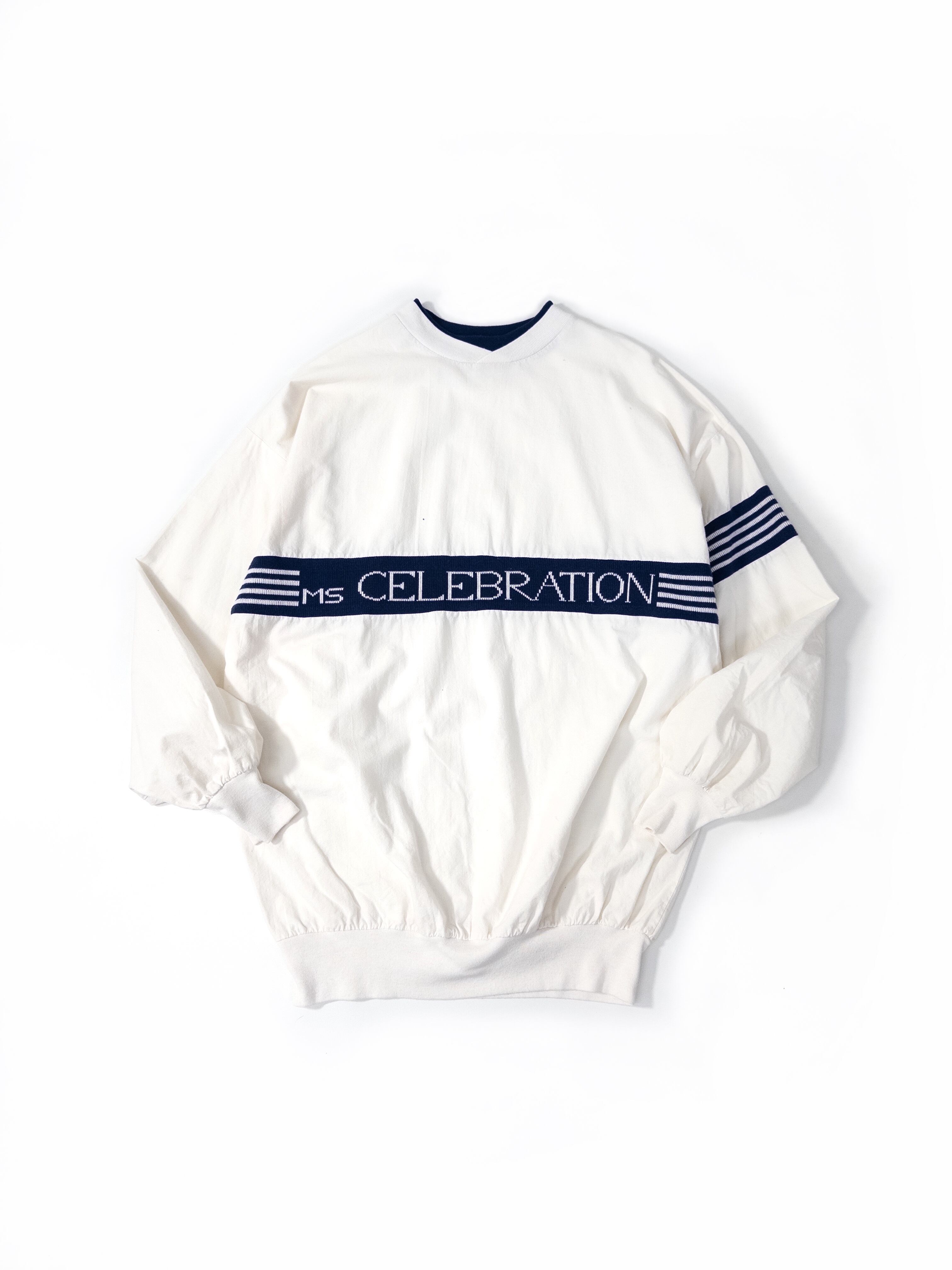 白ボディにネイビーの切り替えライン、胸に入る “CELEBRATION” の文字。