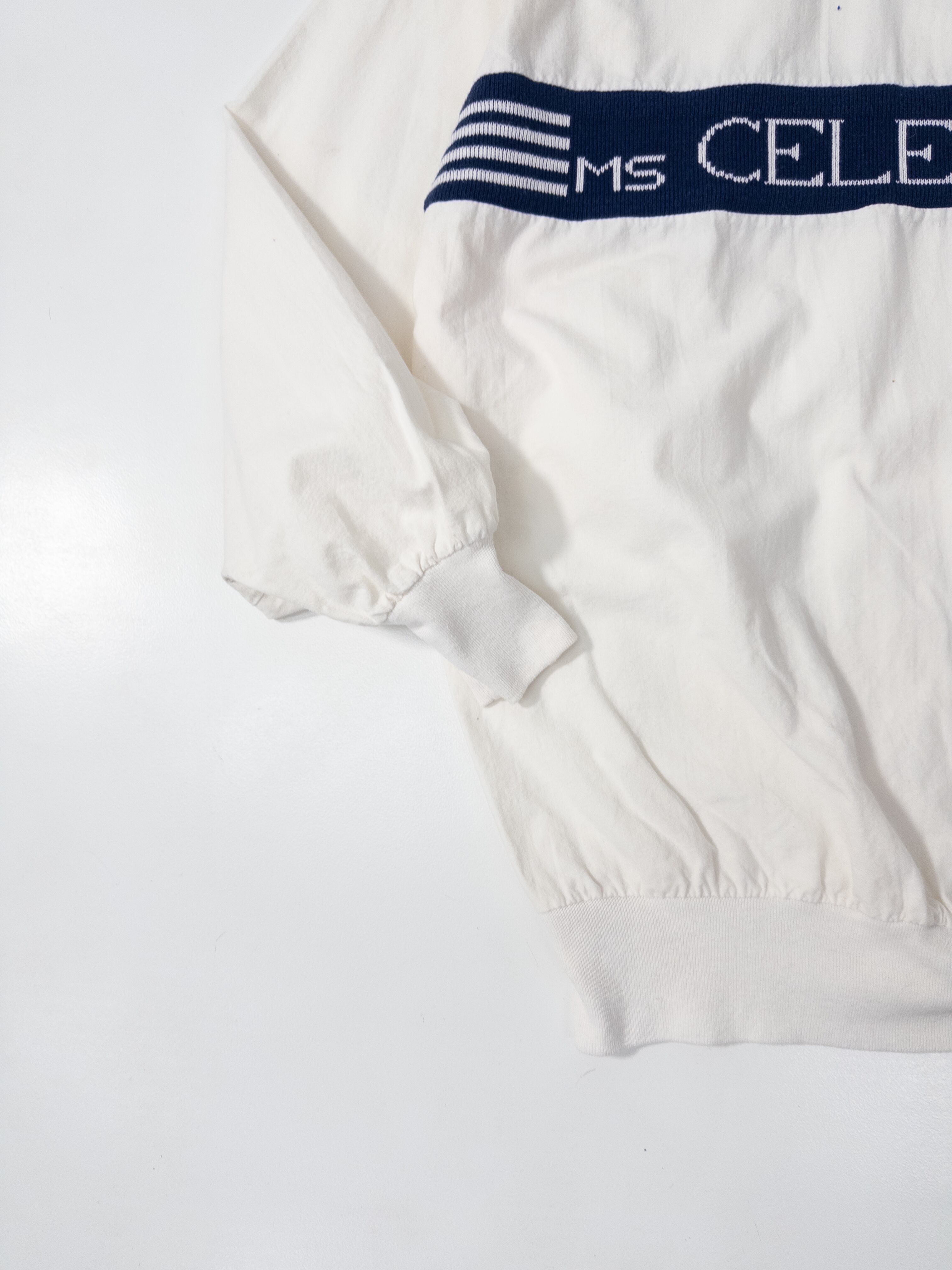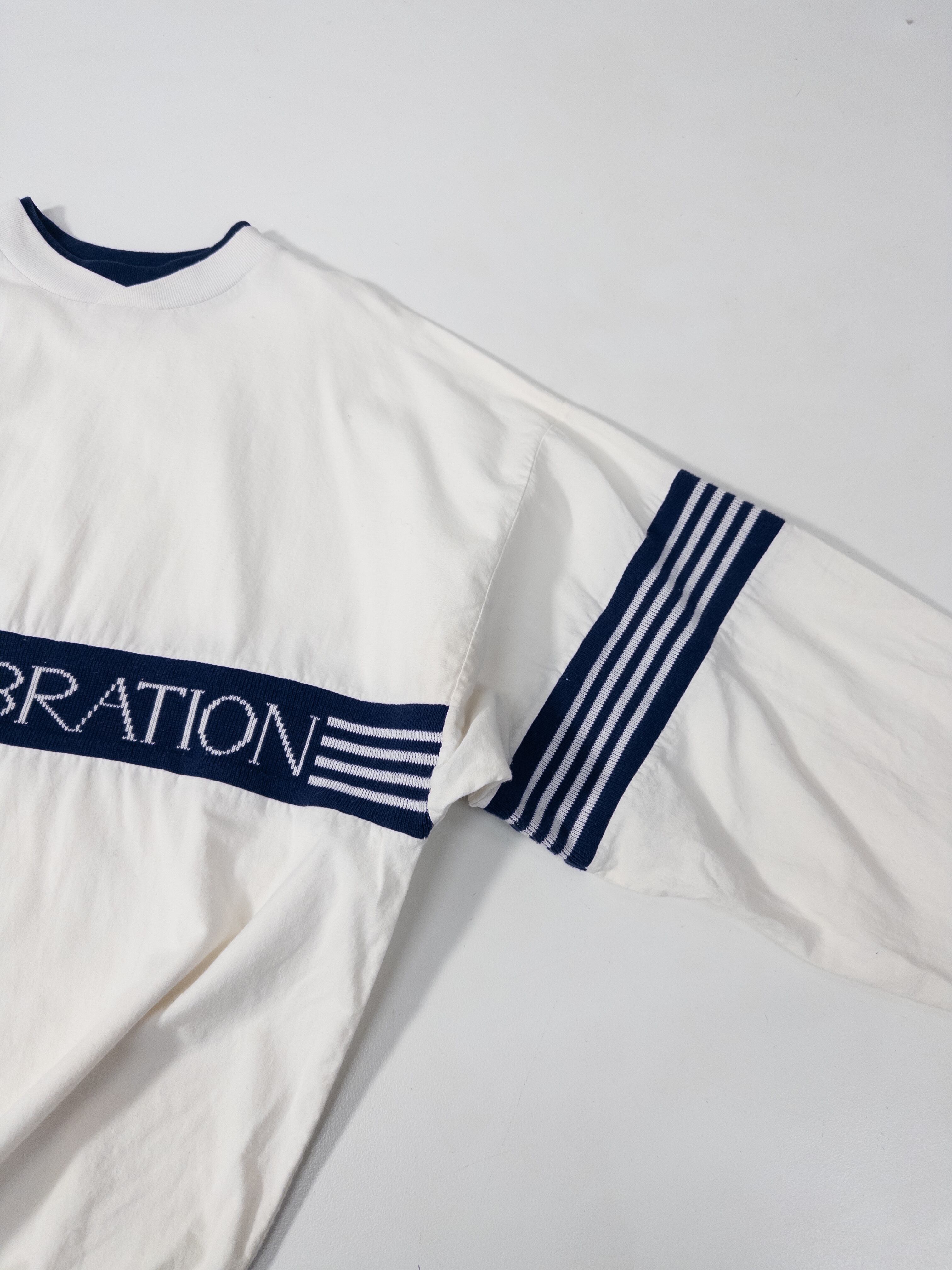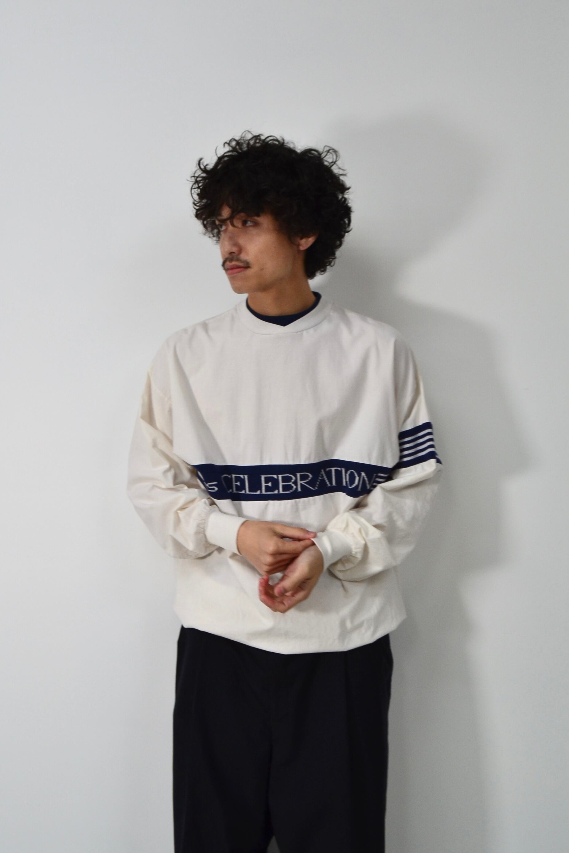 白ボディにネイビーの切り替えライン、胸に入る “CELEBRATION” の文字。