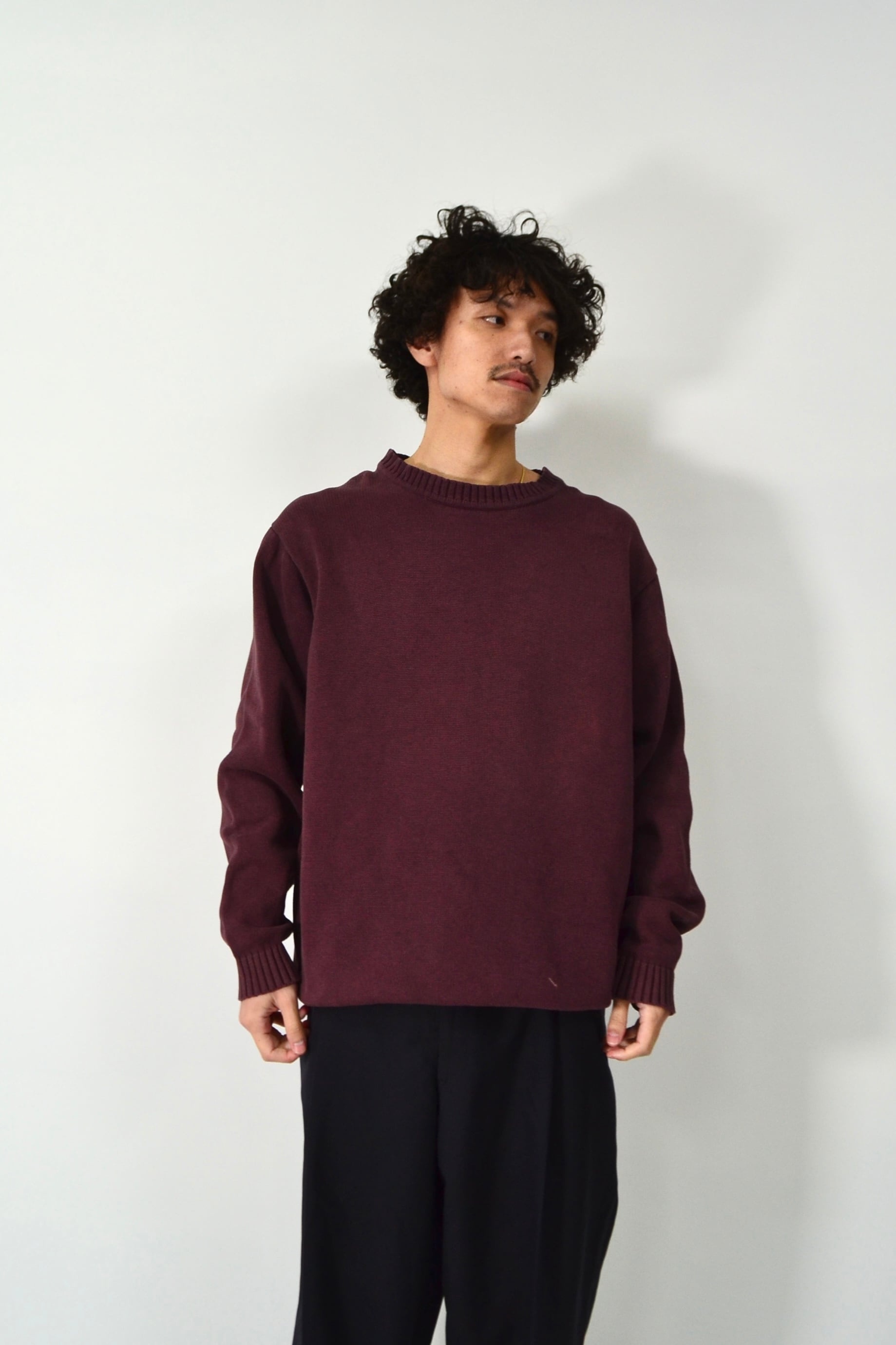 ウールみたいなチクチク感ゼロで、スウェット感覚で着られるニット。編みも詰まっててペラくないから、1枚でも成立するし、インナー使いも◎