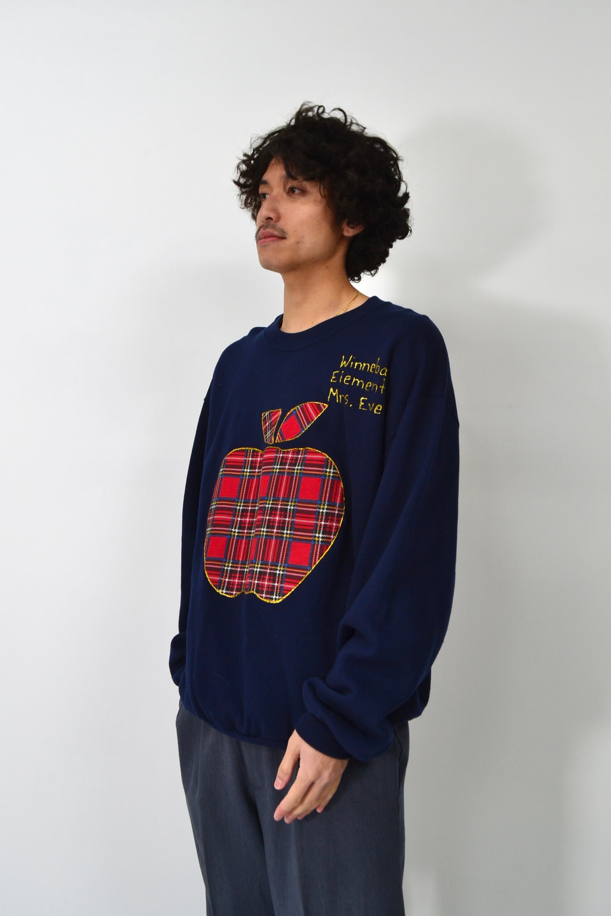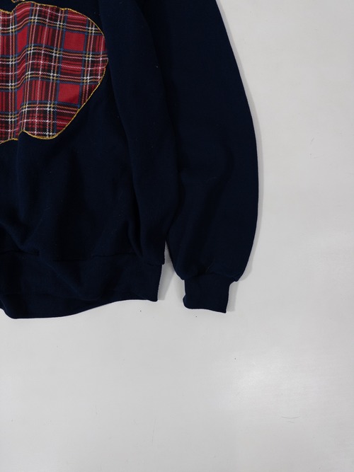 スクール系・クラフト系のスウェットで、ハンドメイド感のあるパッチワークが特徴の一着です。