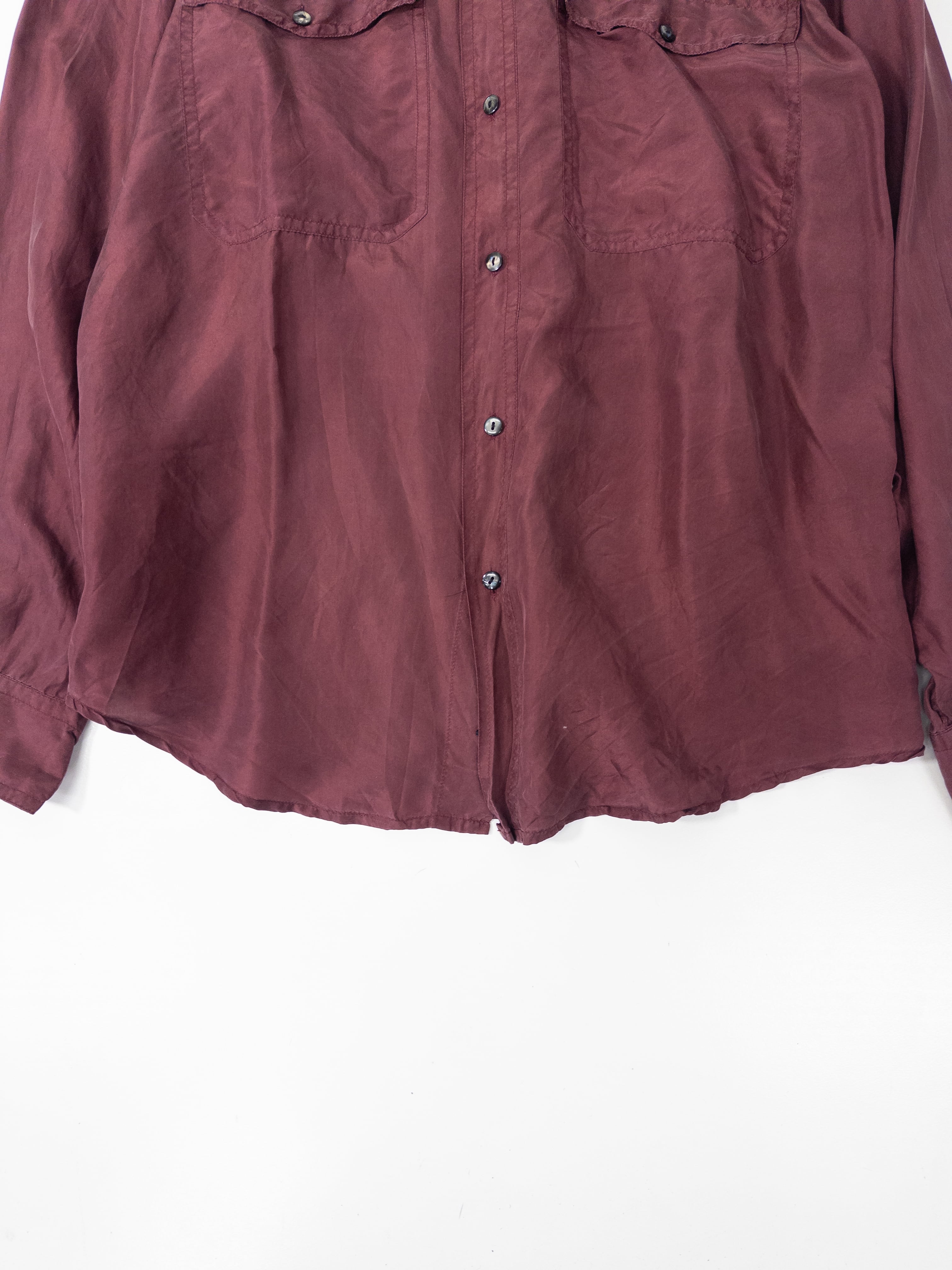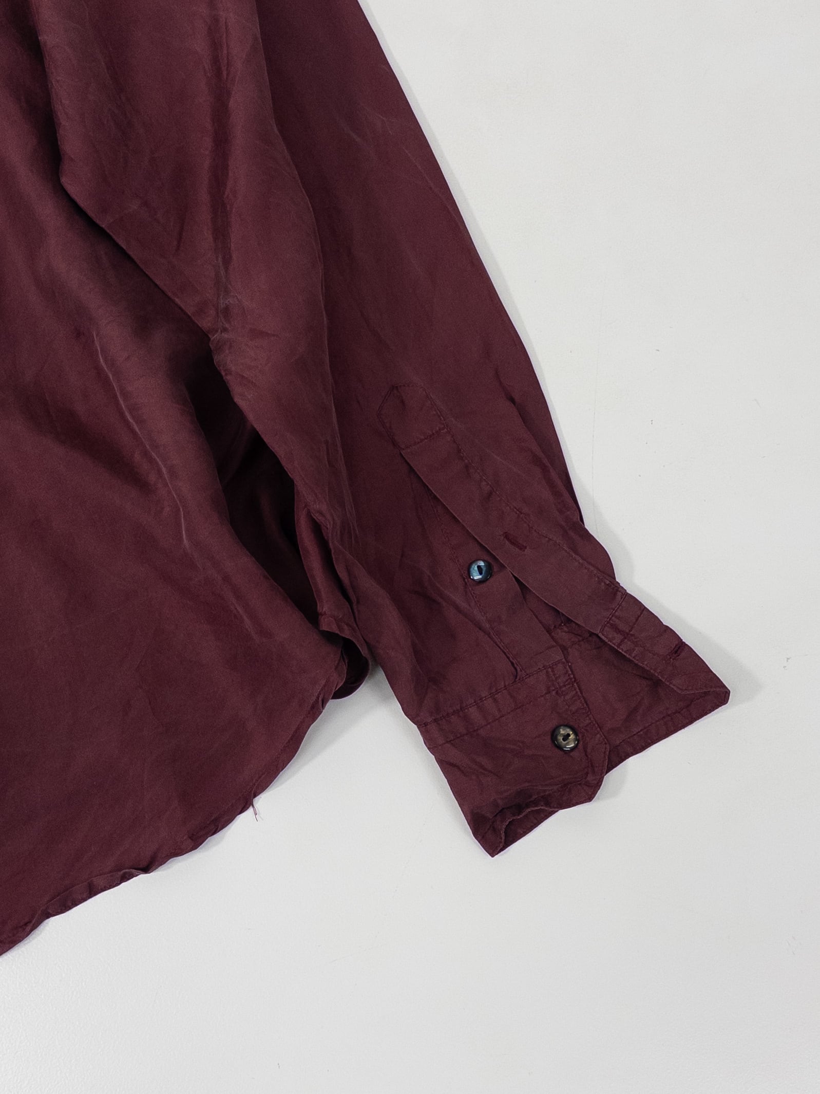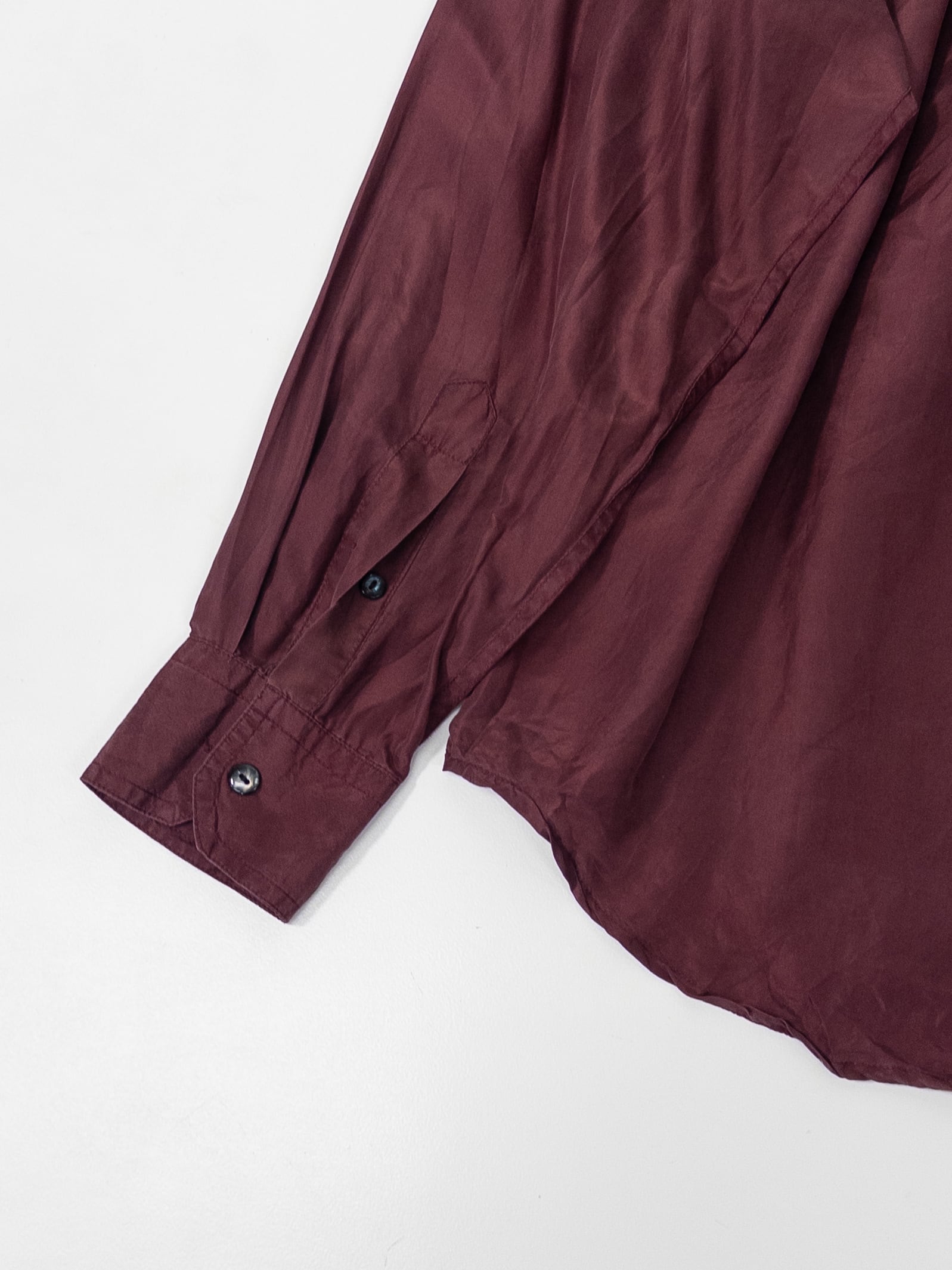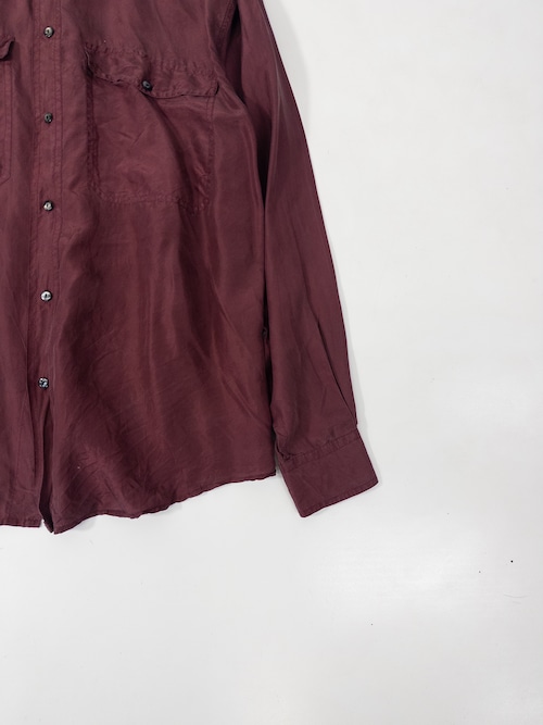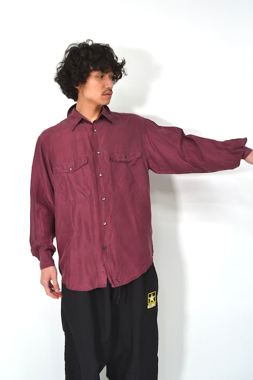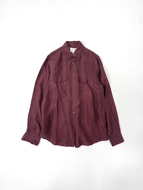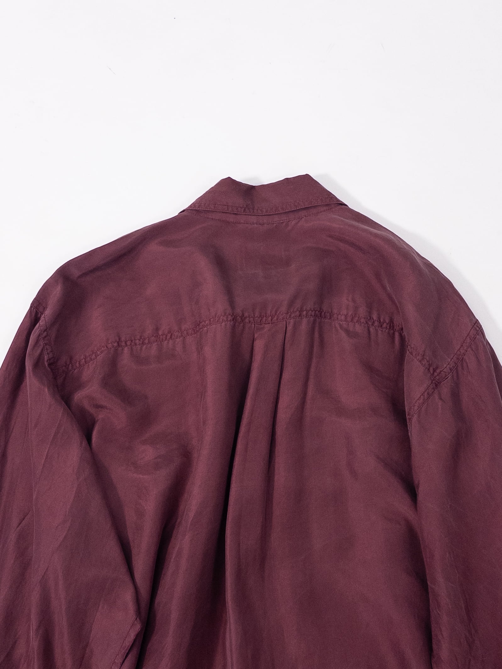 少し赤みのある、深いワインカラーのシルクシャツ。