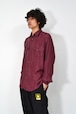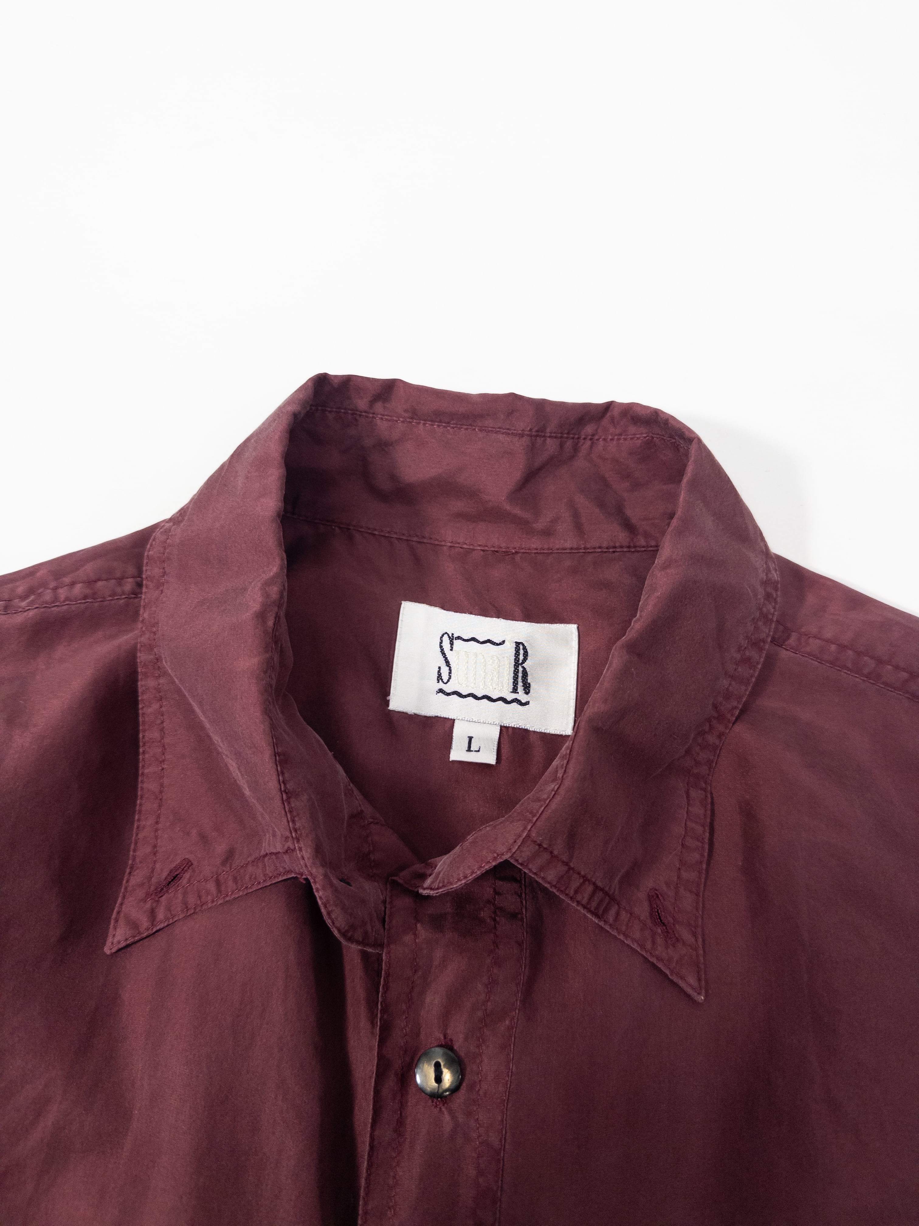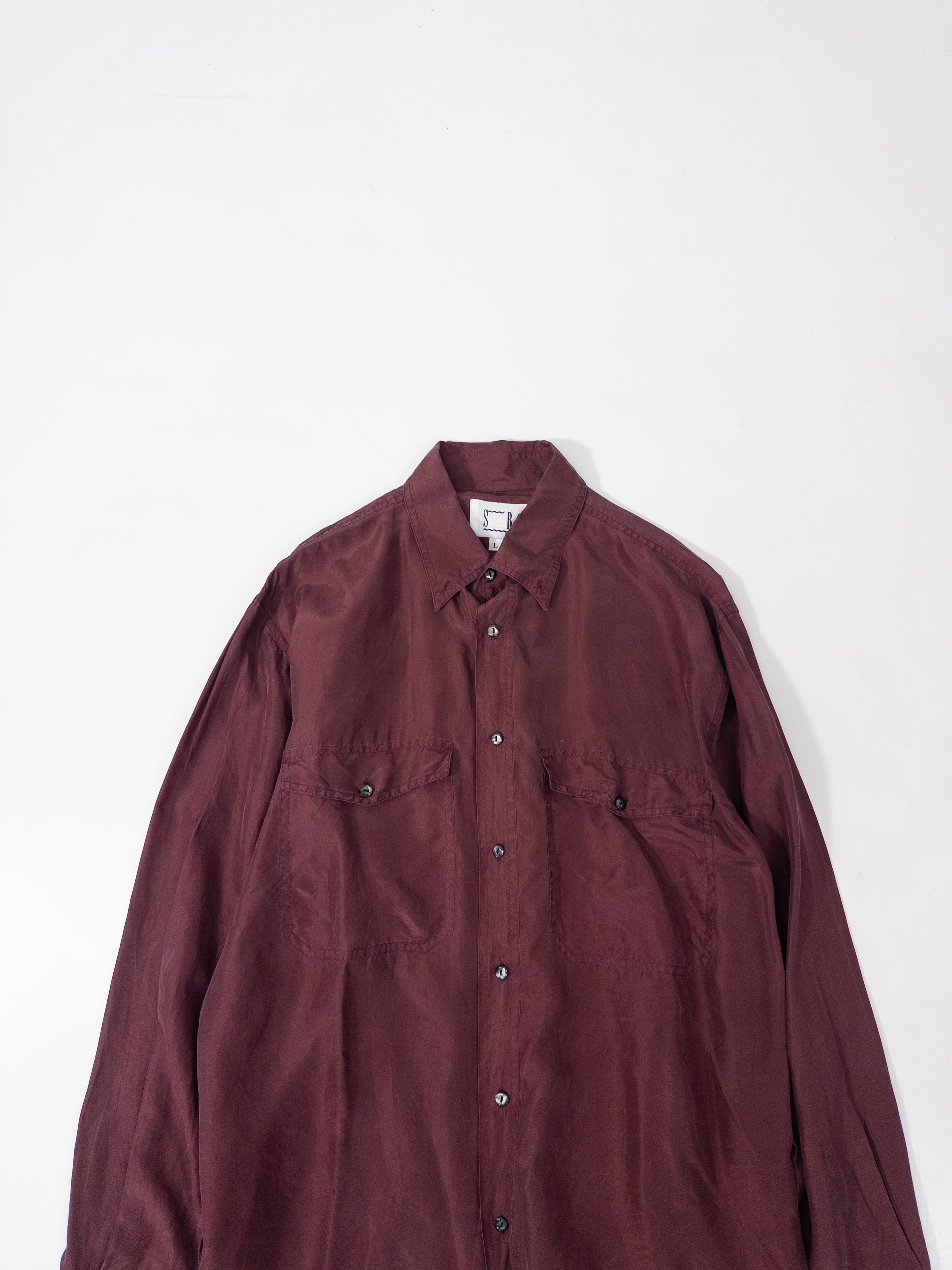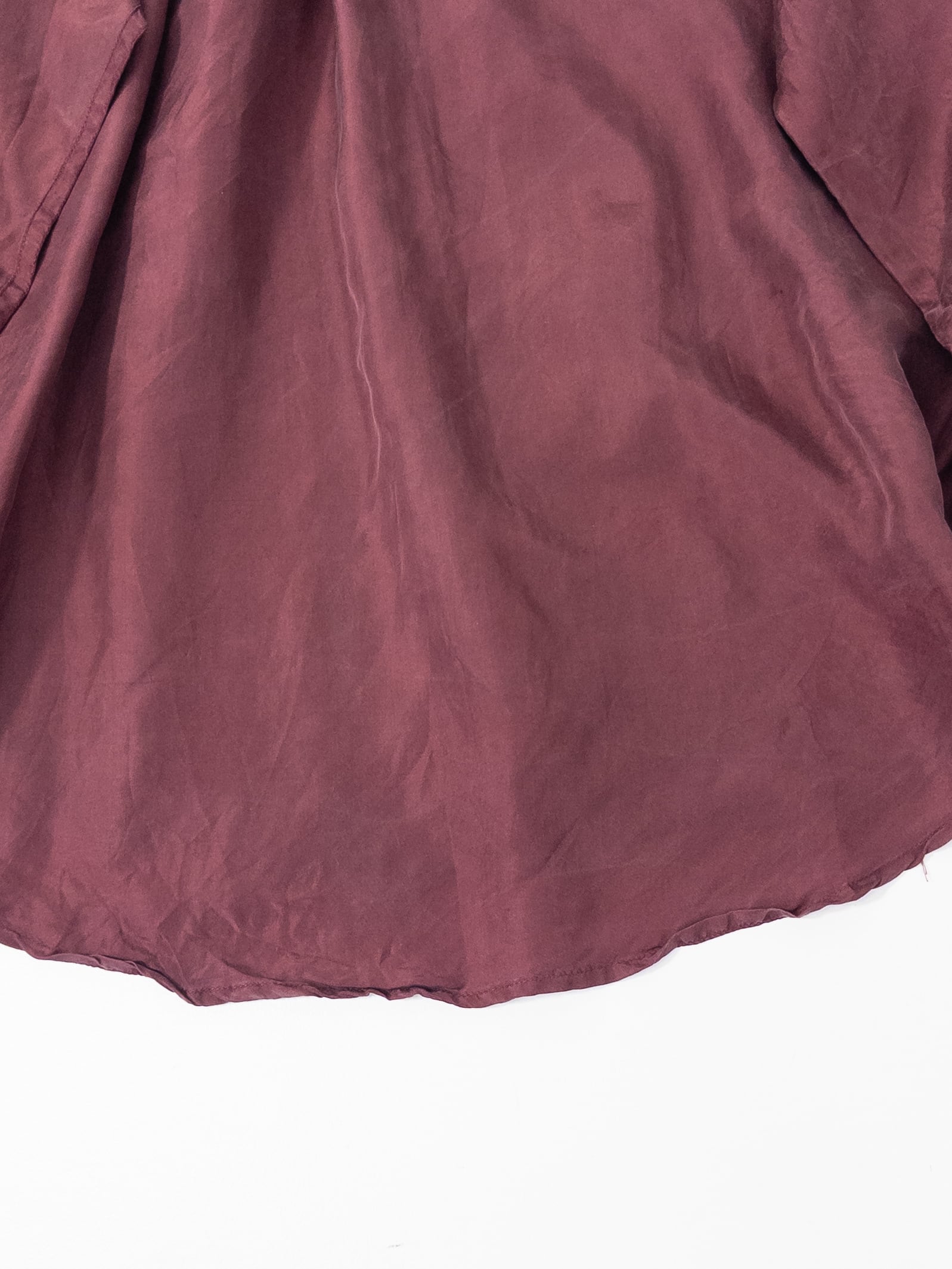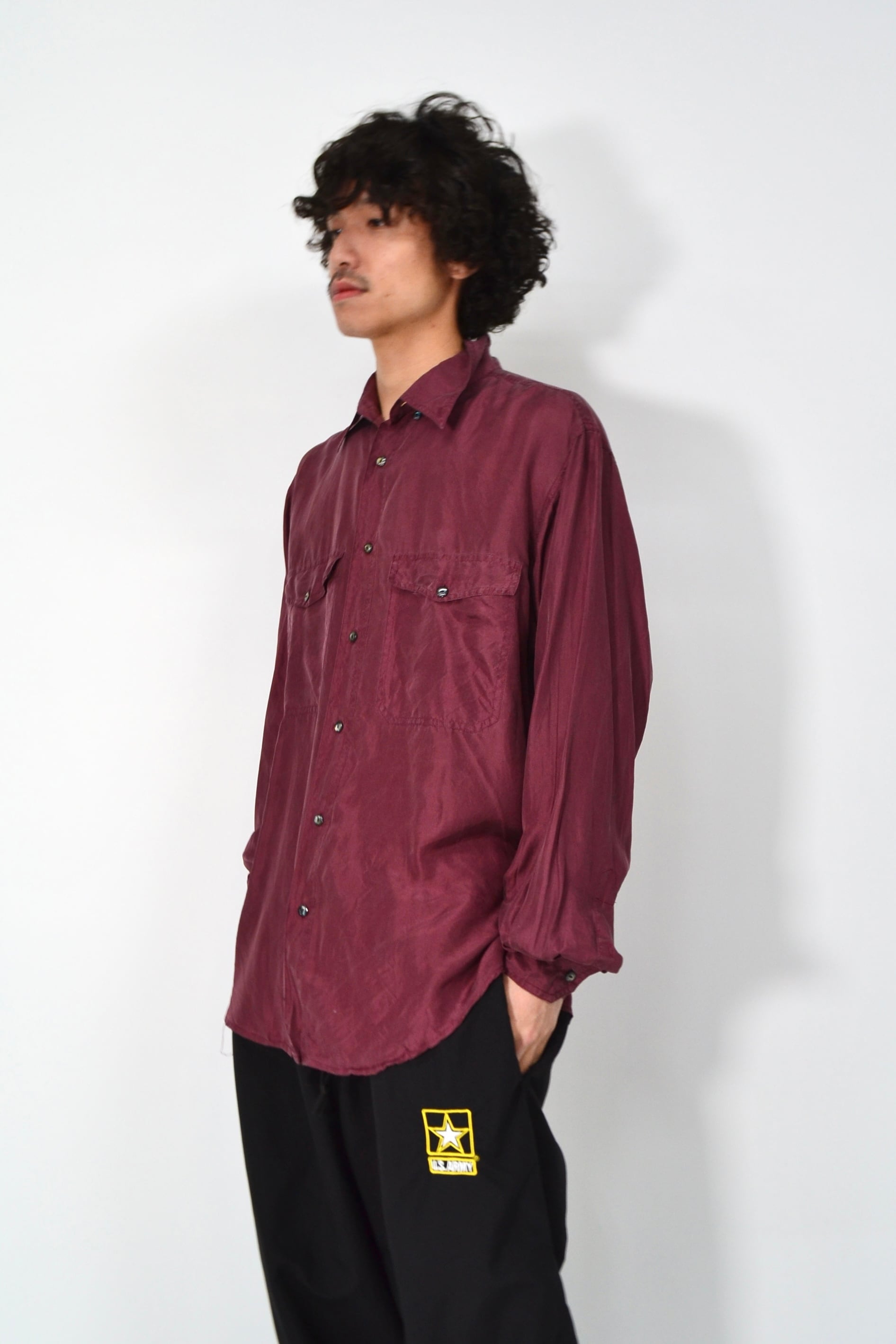 少し赤みのある、深いワインカラーのシルクシャツ。