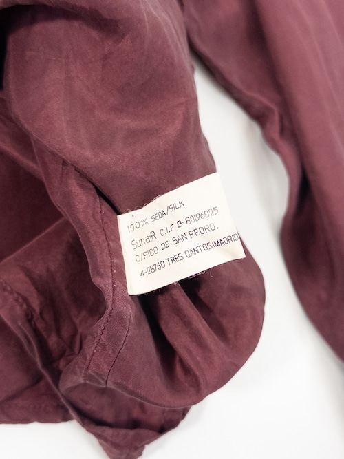 いわゆる有名ブランドの服ではないですが、ヨーロッパのこういう無名のメーカーが作るシルクシャツって、生地だけすごく良かったり、変にデザインを足していなくて形が良かったりするものが多いです。古着でシルクシャツを探すと、アメリカ物とヨーロッパ物で生地感が結構違って、これはどちらかというとヨーロッパっぽい、少し上品なシルクの質感だと思います。