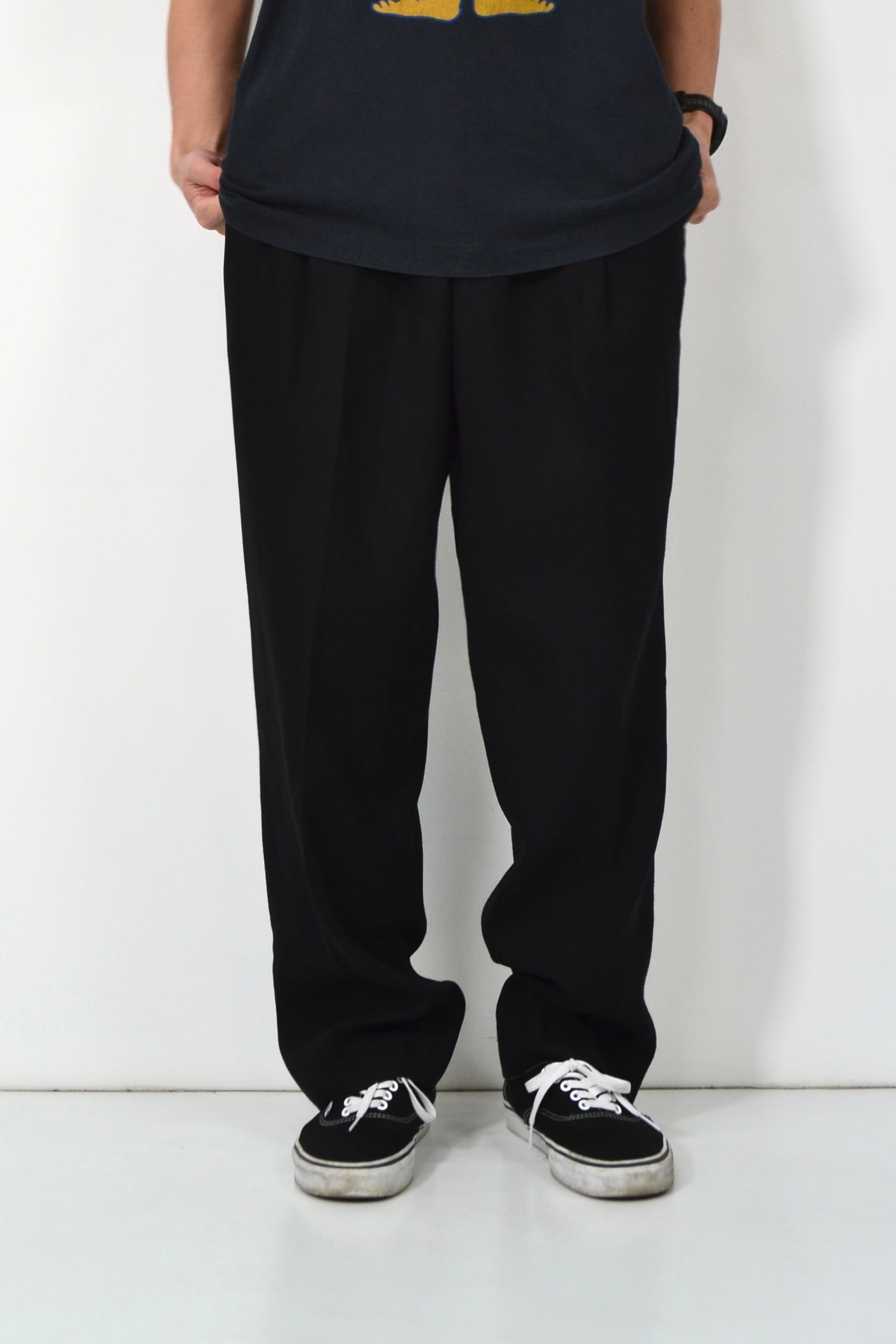 この“ワンタック+サマーウール”の組み合わせのスラックスは、カジュアルな服に合わせるとすごくバランスが取りやすいパンツだと思います。Tシャツやスウェットに合わせてもラフになりすぎないし、シャツやジャケットに合わせればそのまま少しきれいな格好にもなる、ちょうど中間みたいなパンツです。