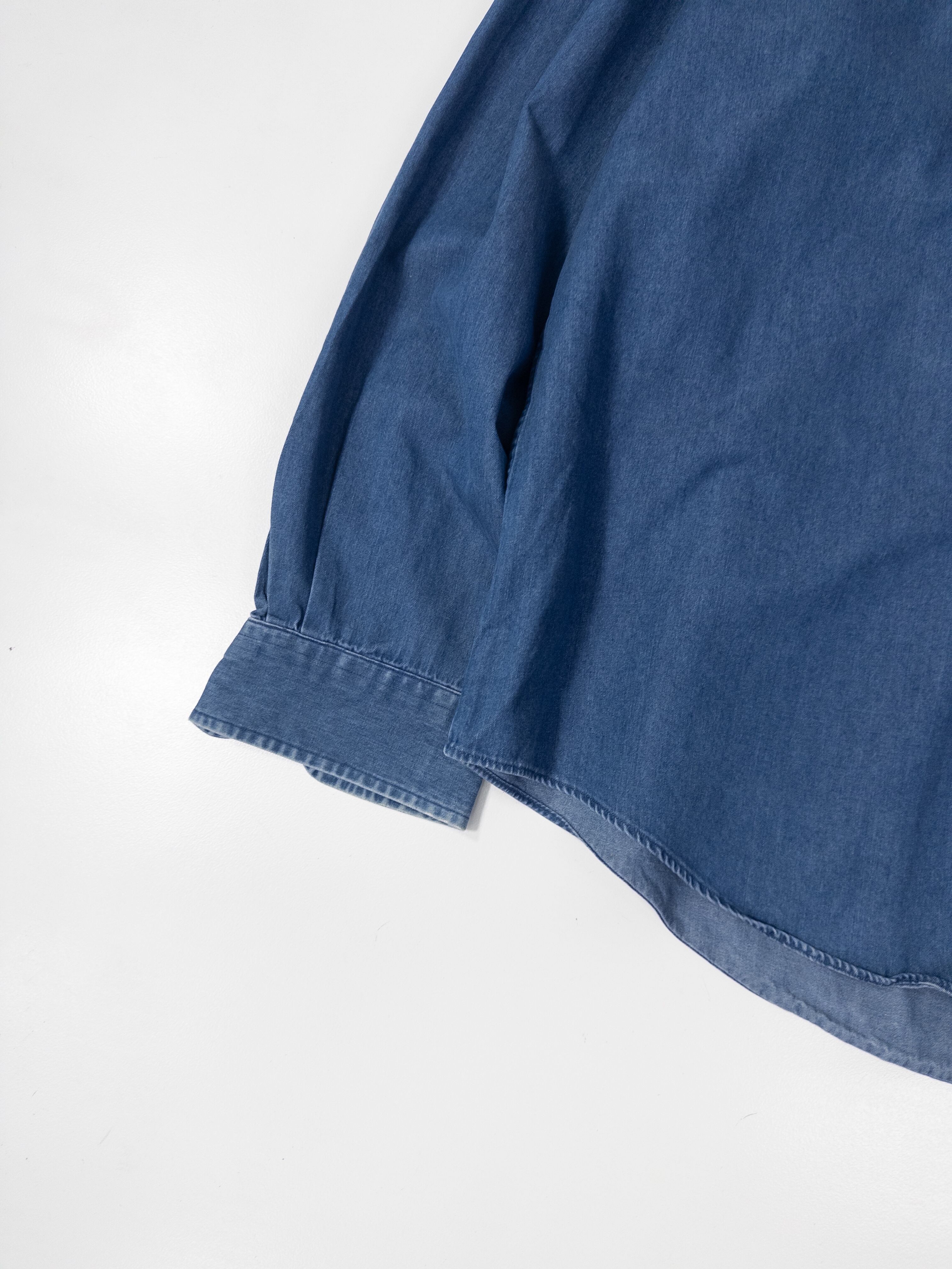 このシャツも作りはちゃんとシャツなんだけど、生地はデニムで、少し色が抜けたブルー。ガチガチのドレスシャツじゃないけど、Tシャツよりはちゃんとして見える、ちょうど中間のポジションの服