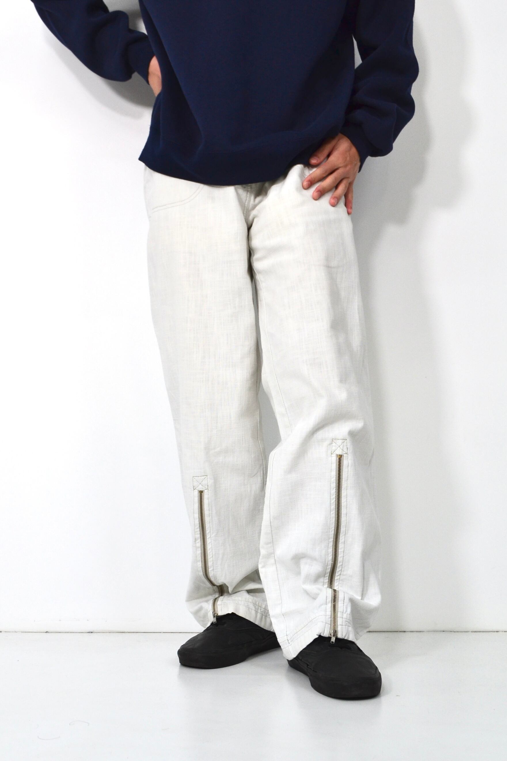 一見するとクリーンなホワイトのストレートパンツですが、裾に走るジップディテールがしっかり効いていて、どこかモードな空気を感じる一本です。