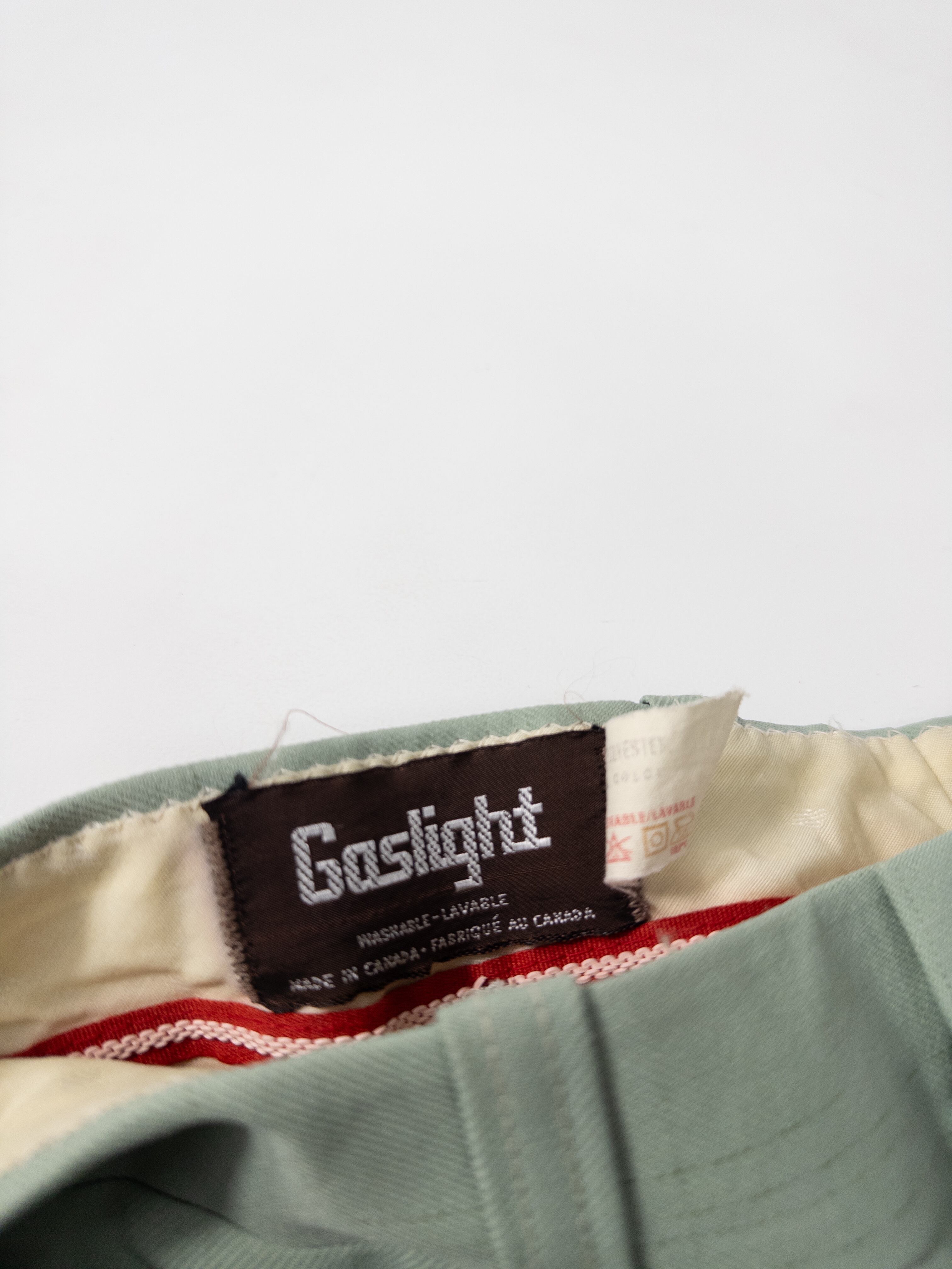 ミントグリーンのような淡いトーンも、この時代の既製ドレスウェアでよく見られるカラーで、単純な明るさじゃなくて少しグレーが混ざったような落ち着きがあるのが特徴。ポリエステル混の生地も当時らしく、シワになりにくく扱いやすい実用面と、ほんのり光沢を持つドレス感が共存している。